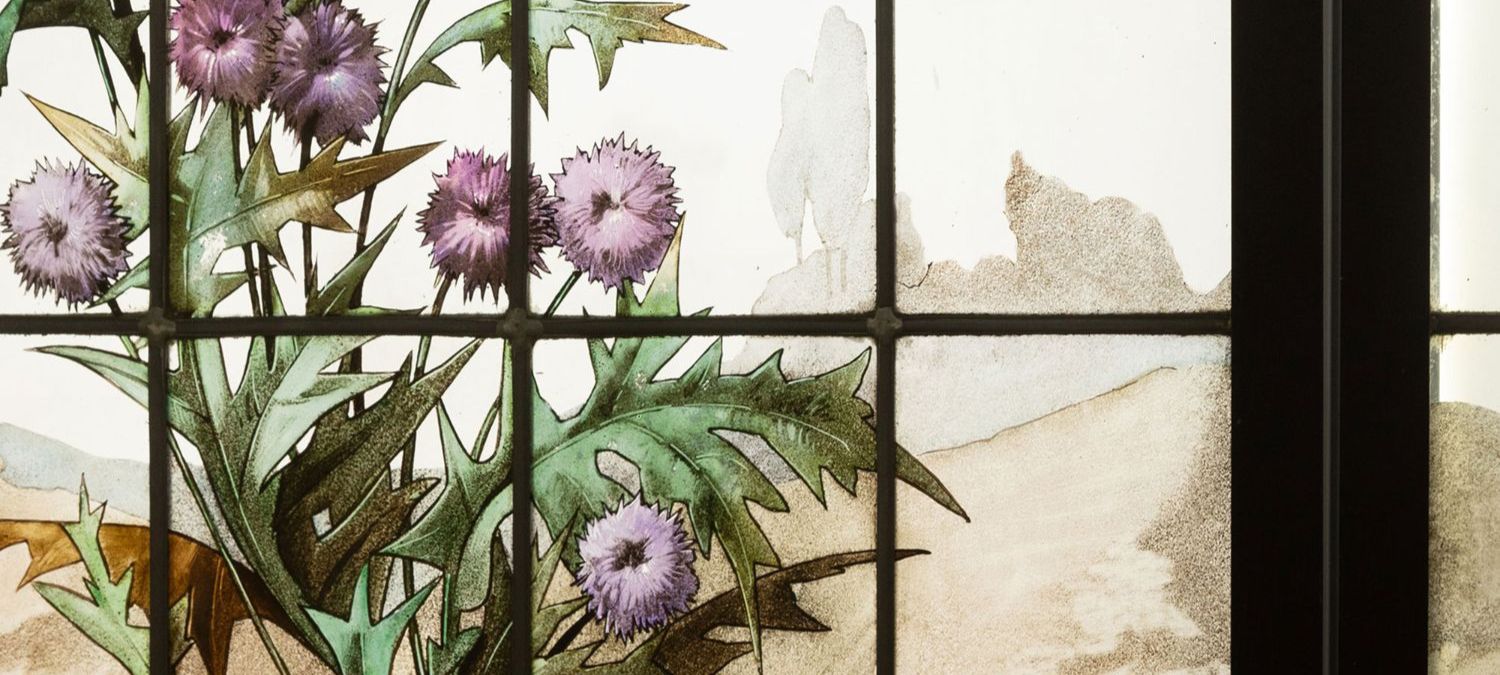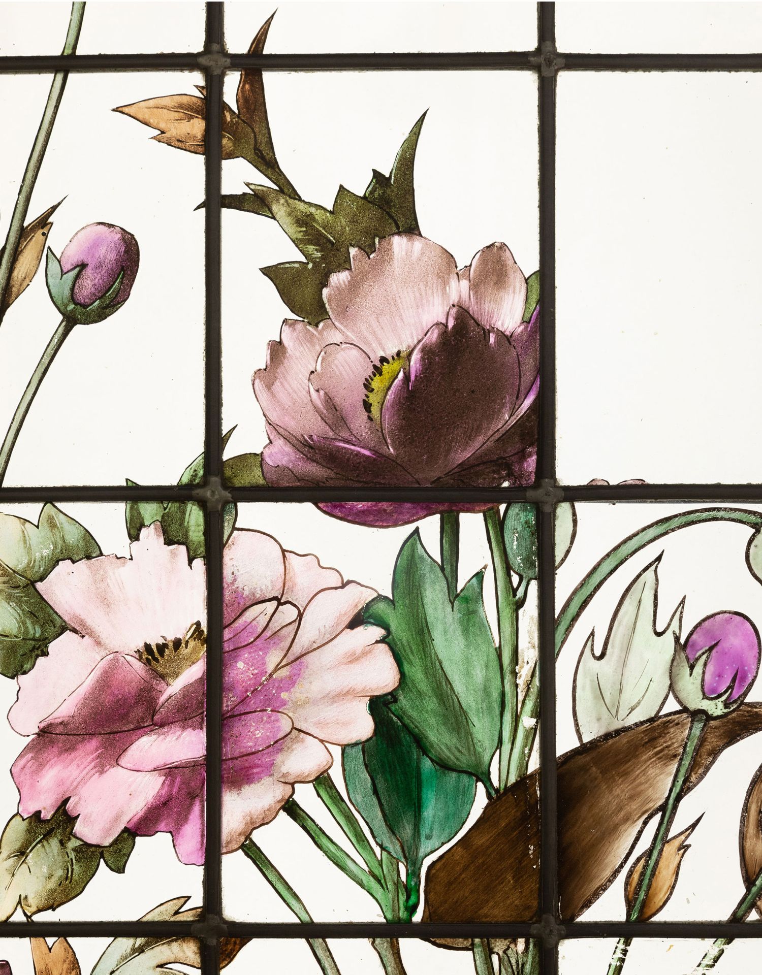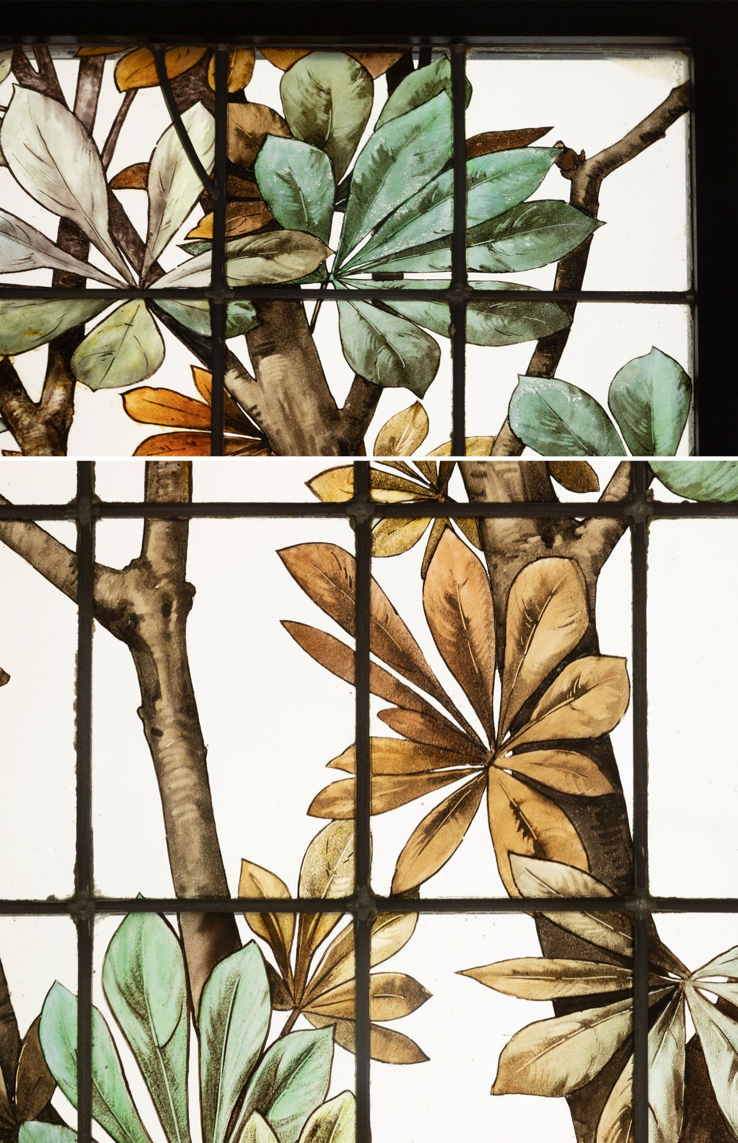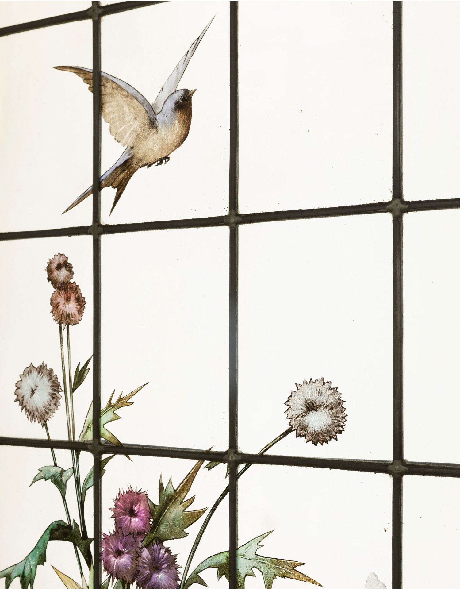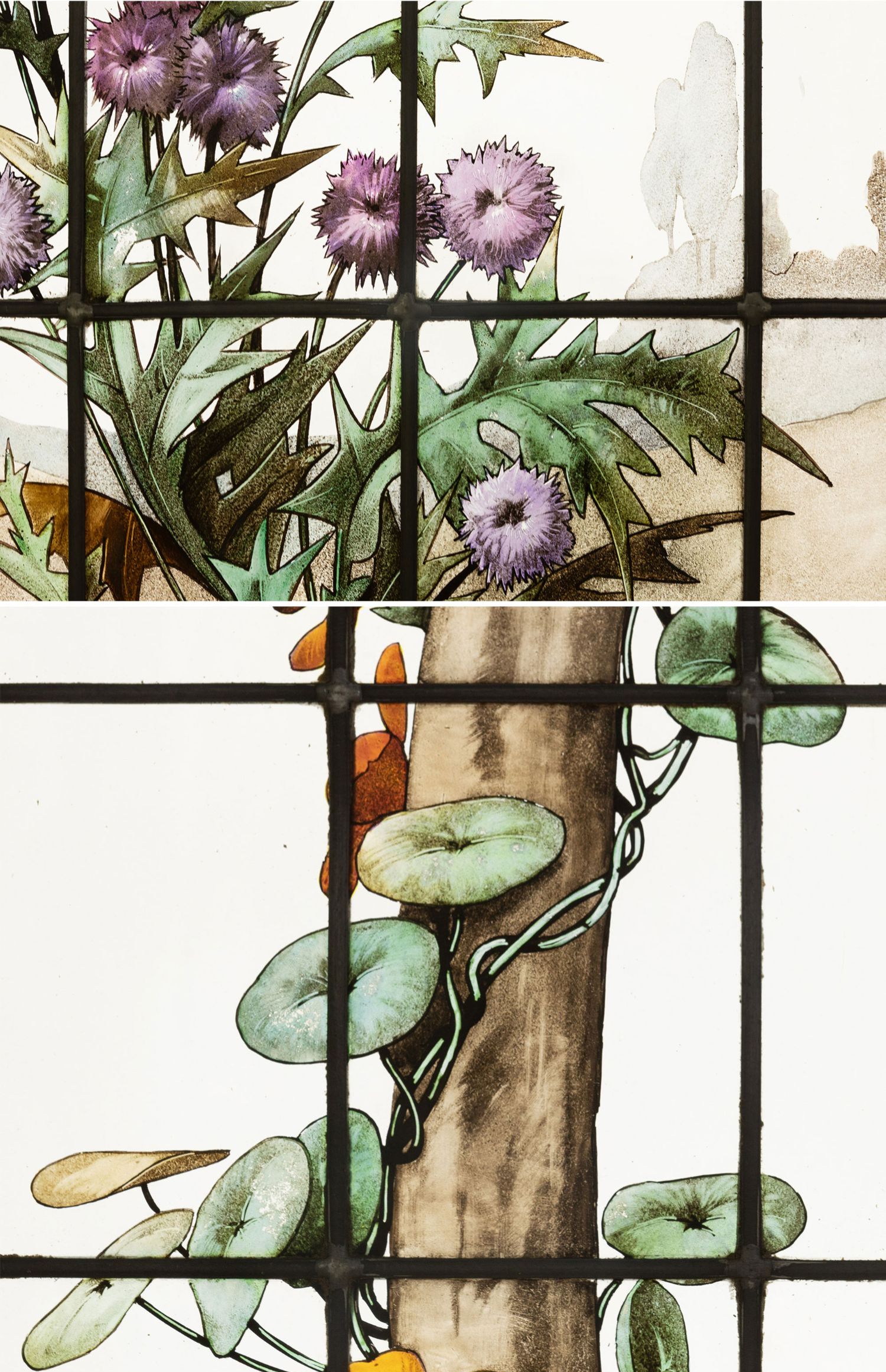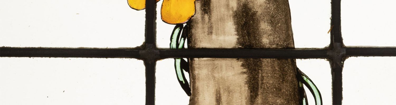 独角鹿西洋古董19世纪法国花树雀鸟水边风景彩绘玻璃花窗一联四幅