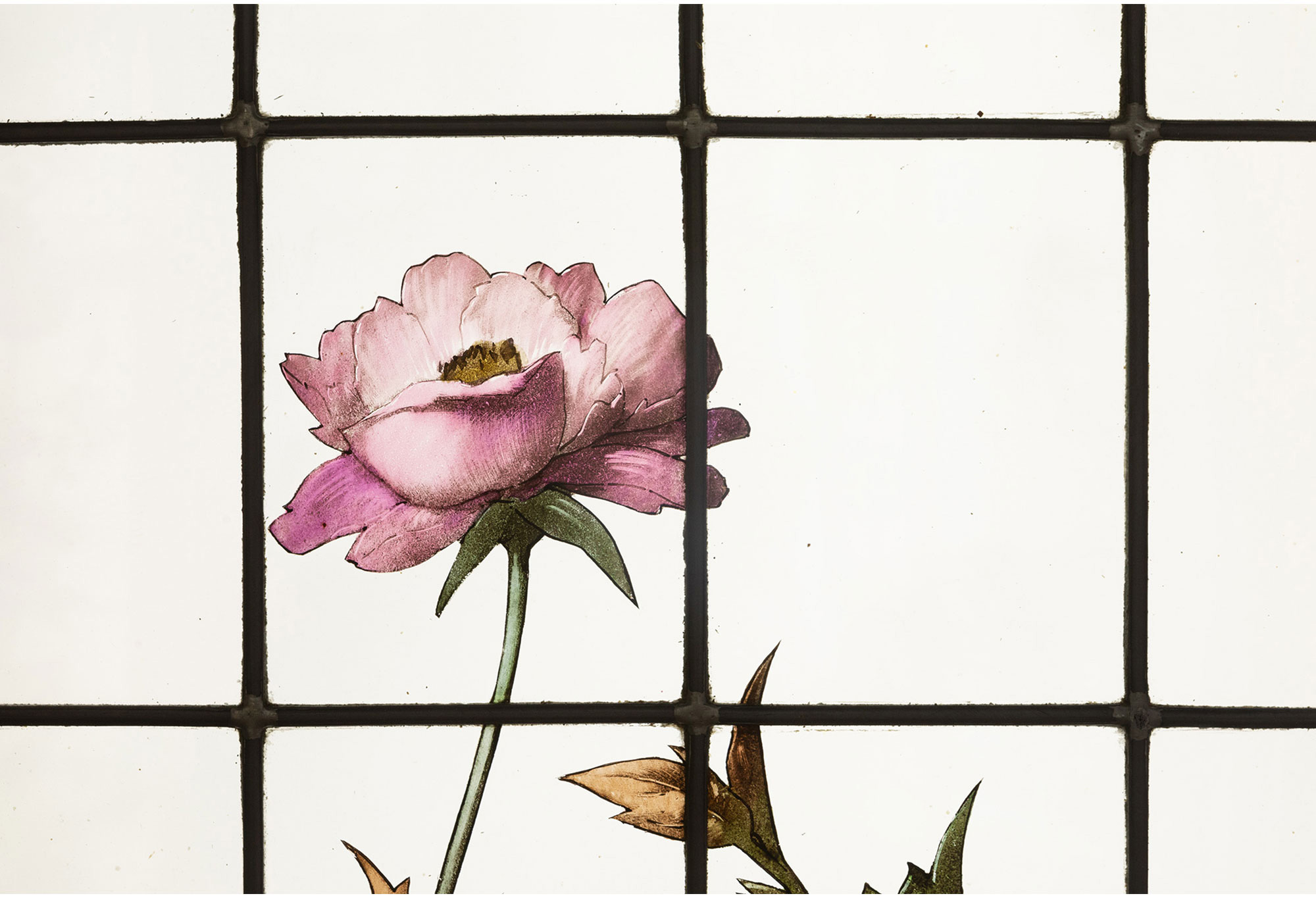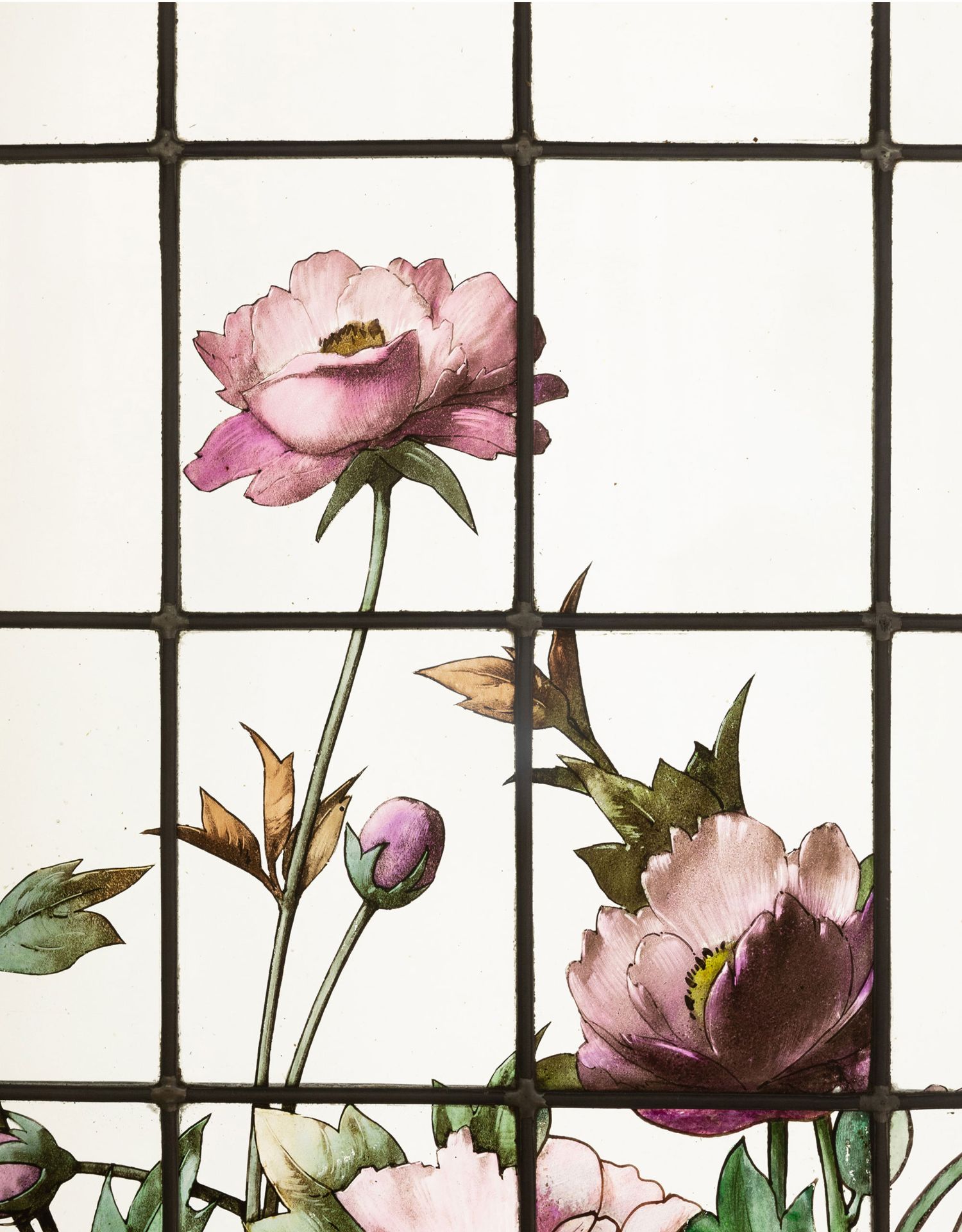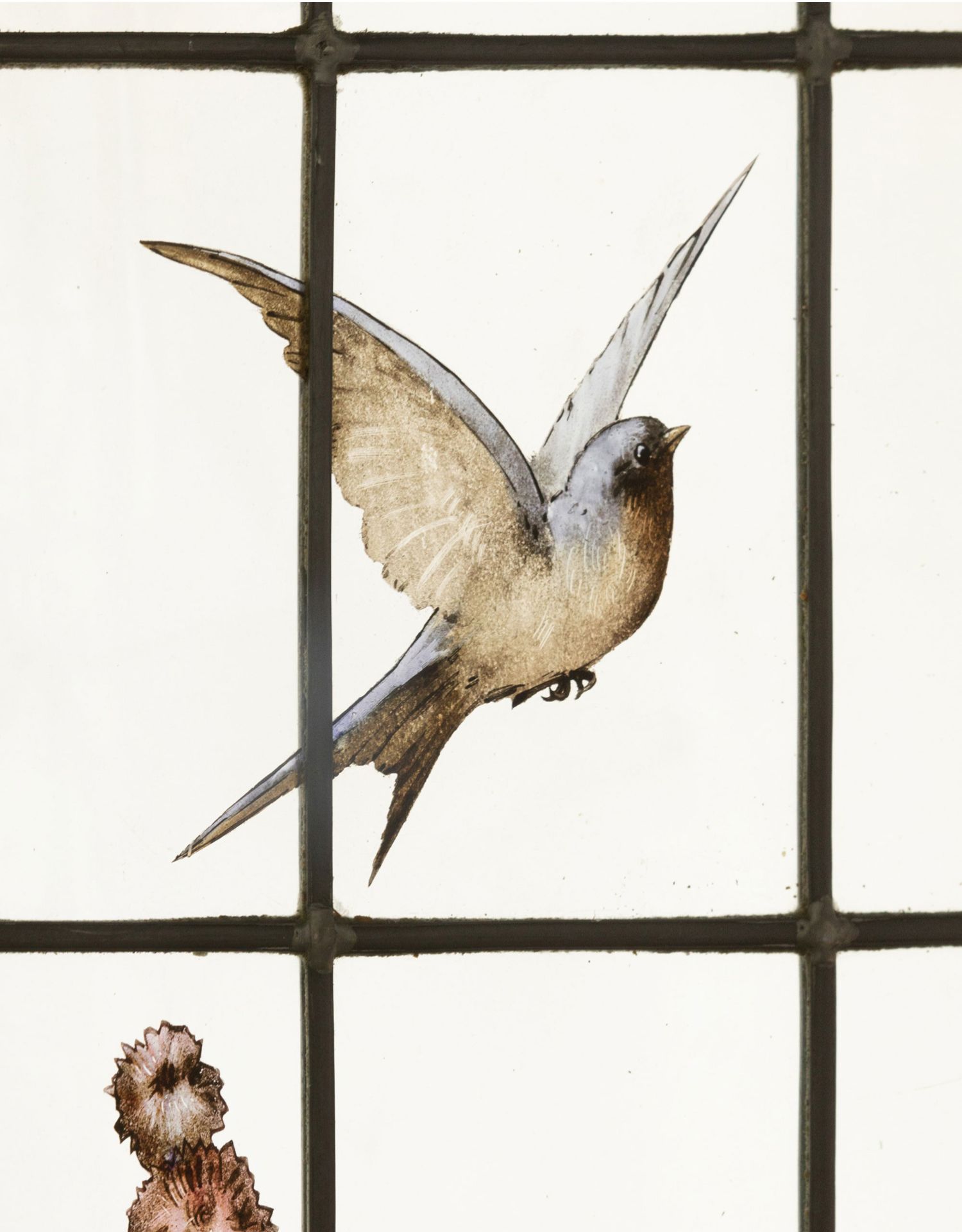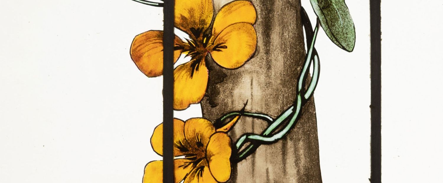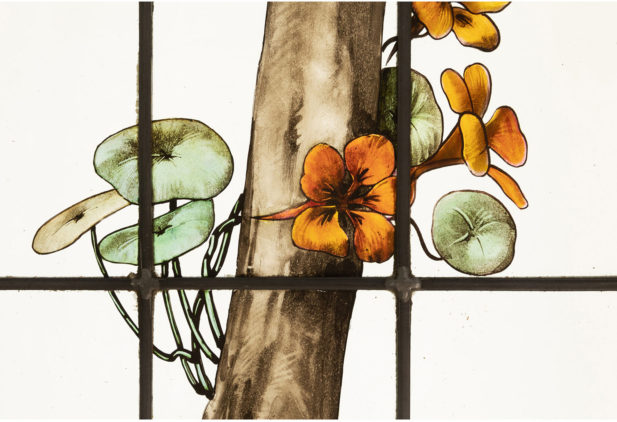 独角鹿西洋古董19世纪法国花树雀鸟水边风景彩绘玻璃花窗一联四幅