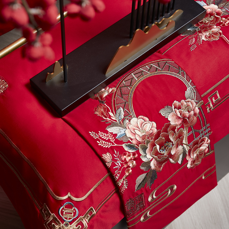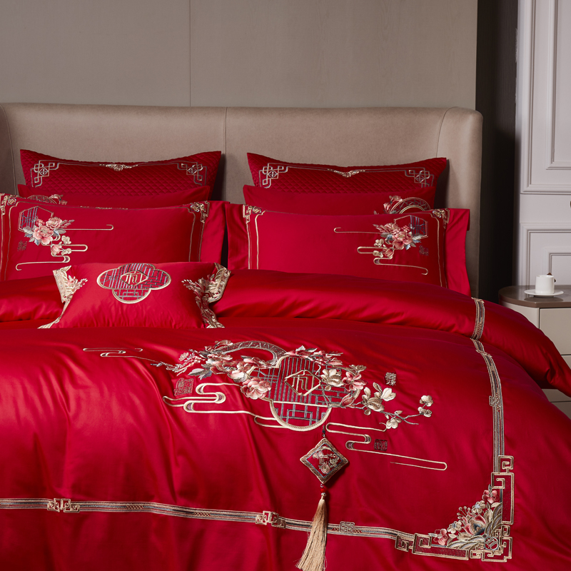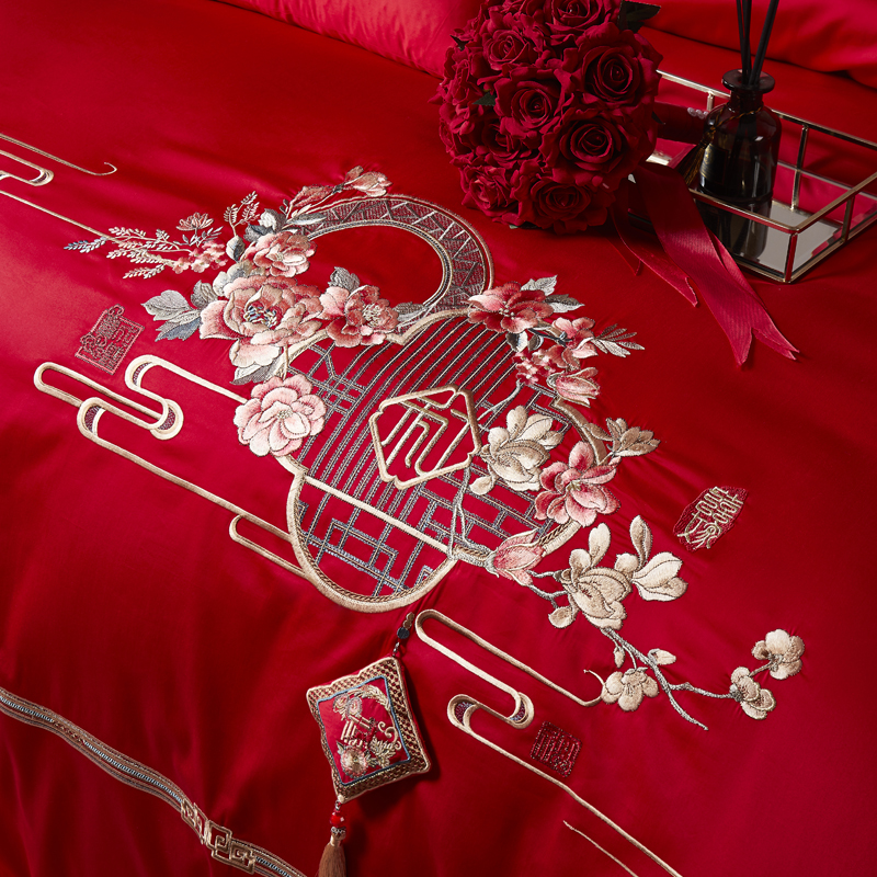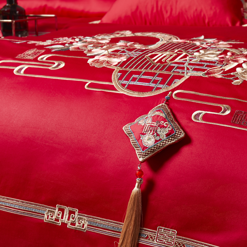 喜庆中国红婚庆六件套百支棉绣花工艺和和睦睦