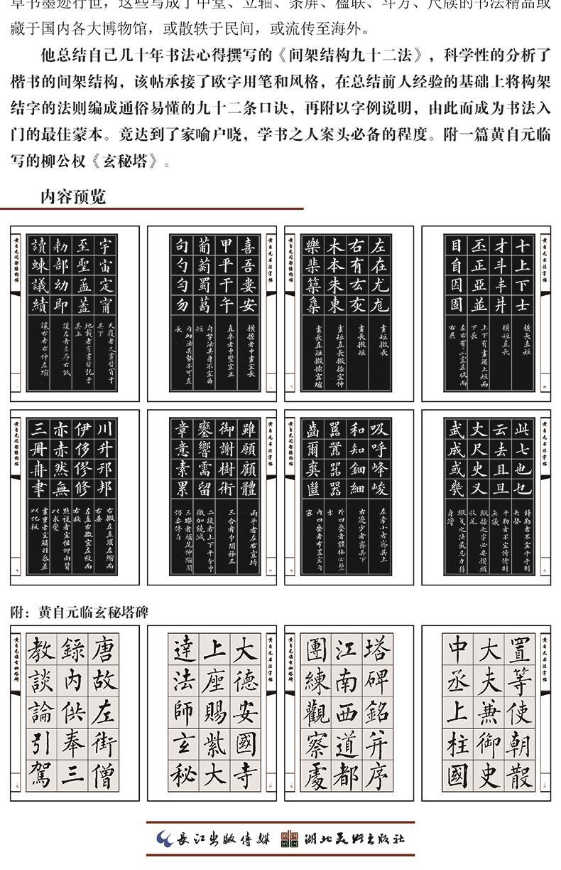 《黄自元间架结构九十二法》由黄自元所著,黄自元总结自己几十年书法心得撰写的《间架结构九十二法》,科学性地分析了楷书的间架结构,该帖承接了欧字用笔和风格,在总结前人经验的基础上将构架结字的法则编成通俗易懂的九十二条口诀,再附以字例说明,由此而成为书法入门的很好摹本。他临写的柳公权《玄秘塔》、欧阳询《九成宫醴泉铭》,以及他书写的《楷书千字文》、《文天祥正气歌》等字帖,经由书店刻版印行,也变得洛阳纸贵,成了人们竞相追捧的书法学习很好摹本,达到学书之人案头推荐的程度。附一篇黄自元临写的柳公权《玄秘塔》。