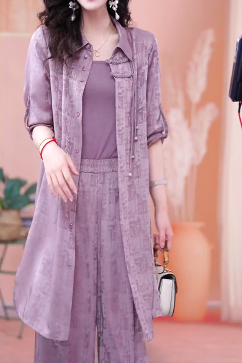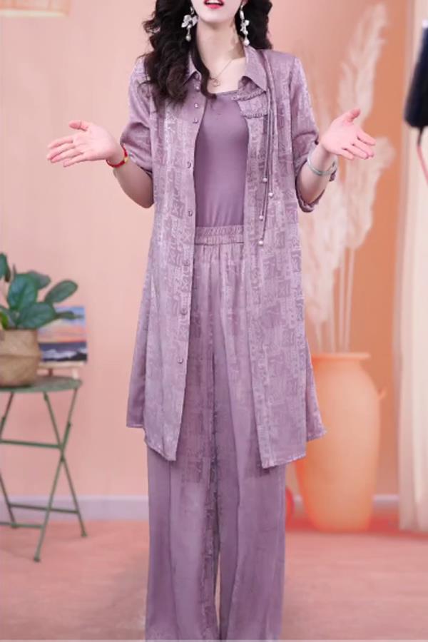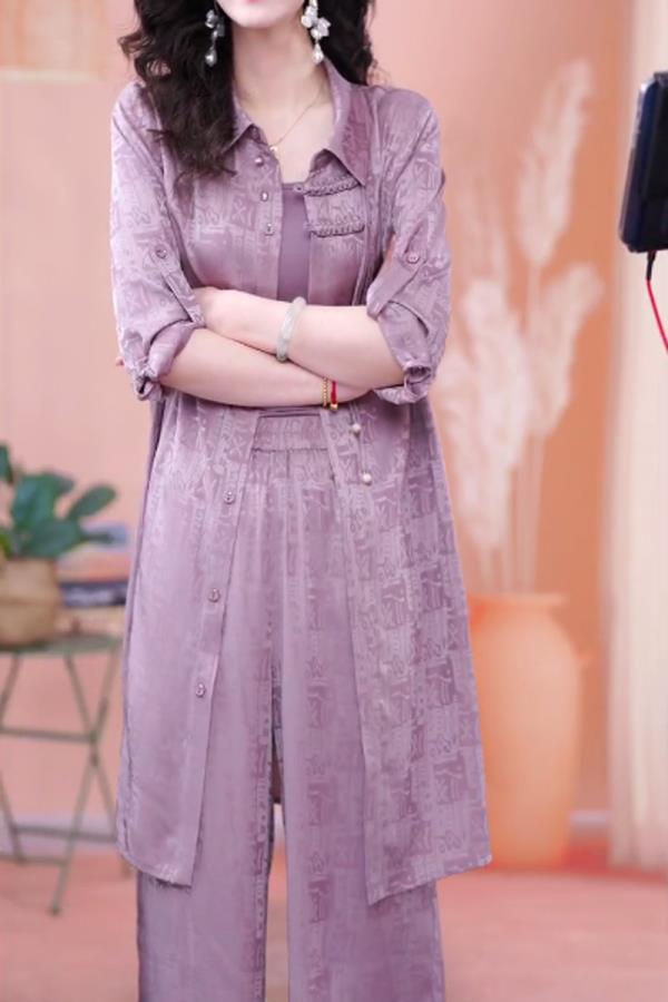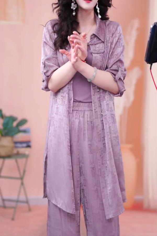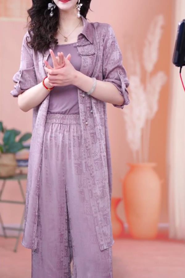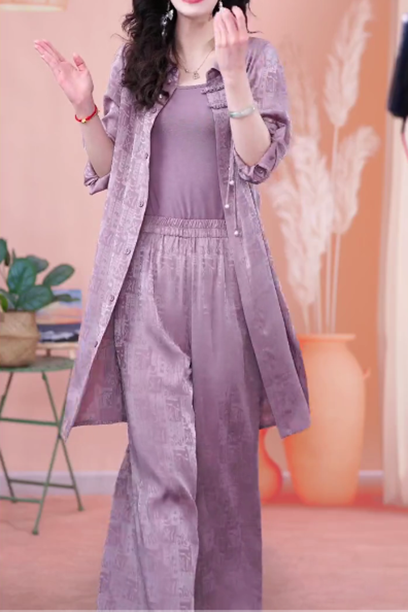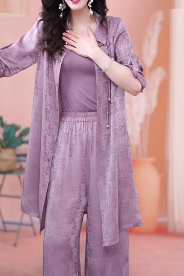 爆款时尚气质印花三件套新款开衫显瘦阔腿裤套装DD