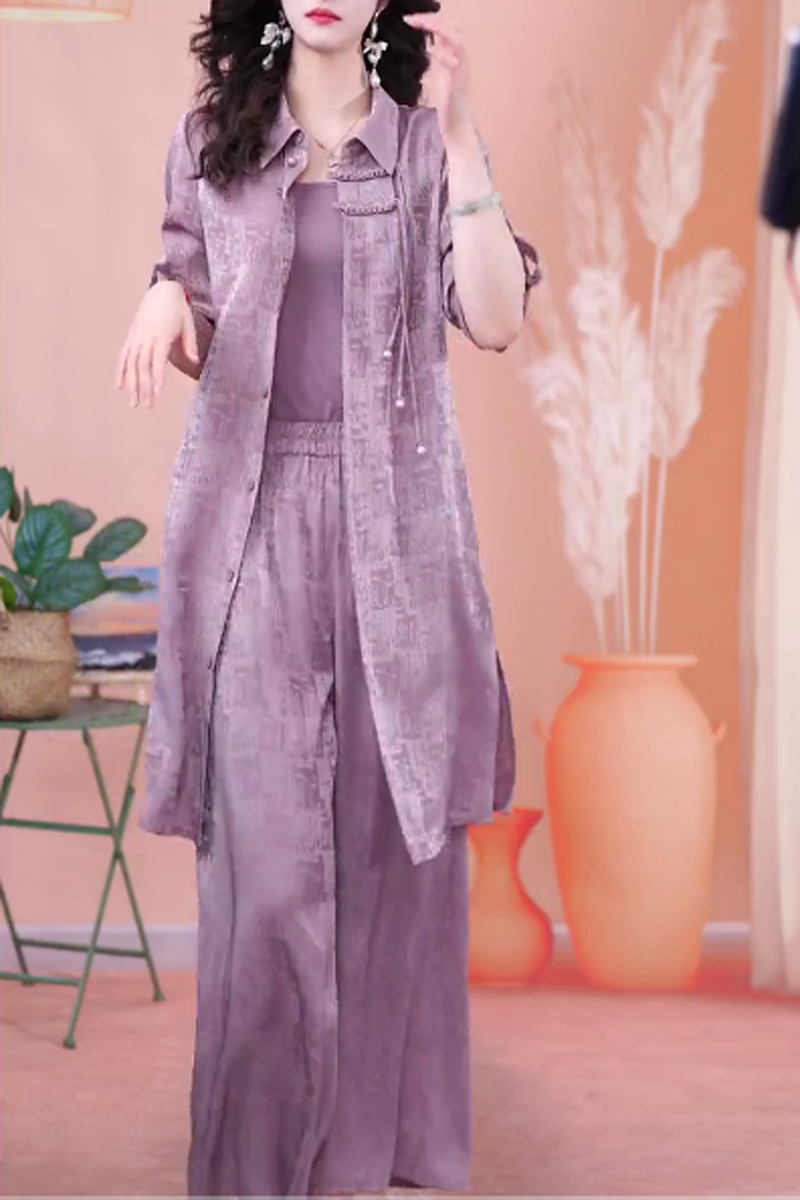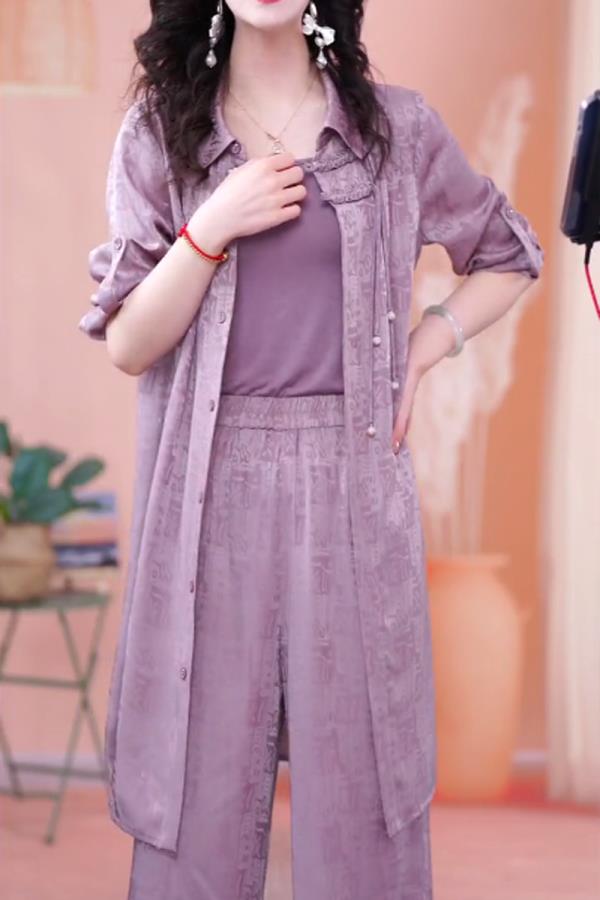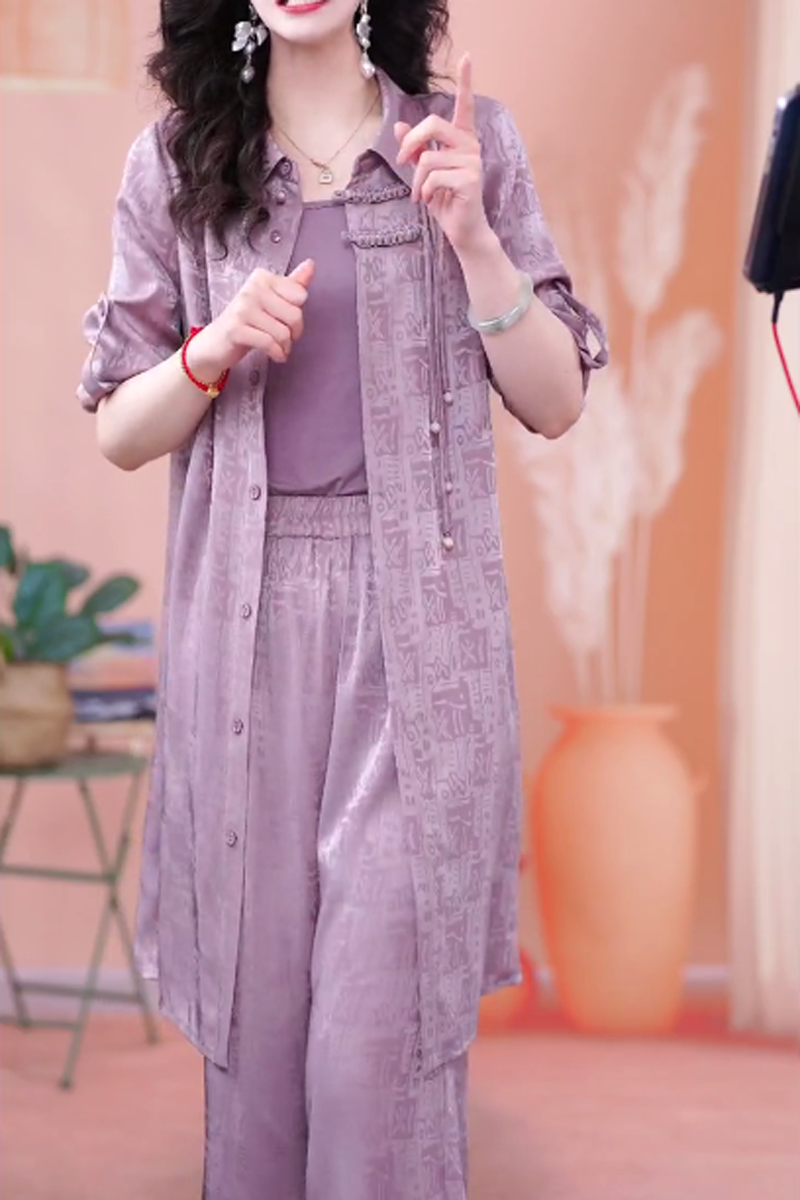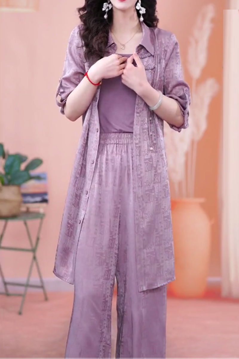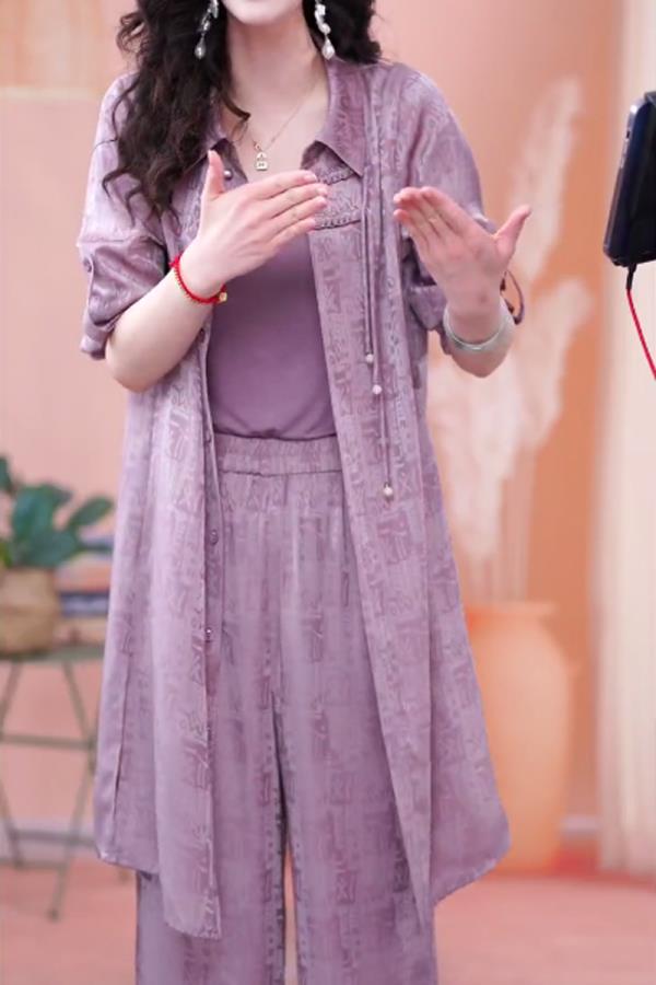 爆款时尚气质印花三件套新款开衫显瘦阔腿裤套装DD