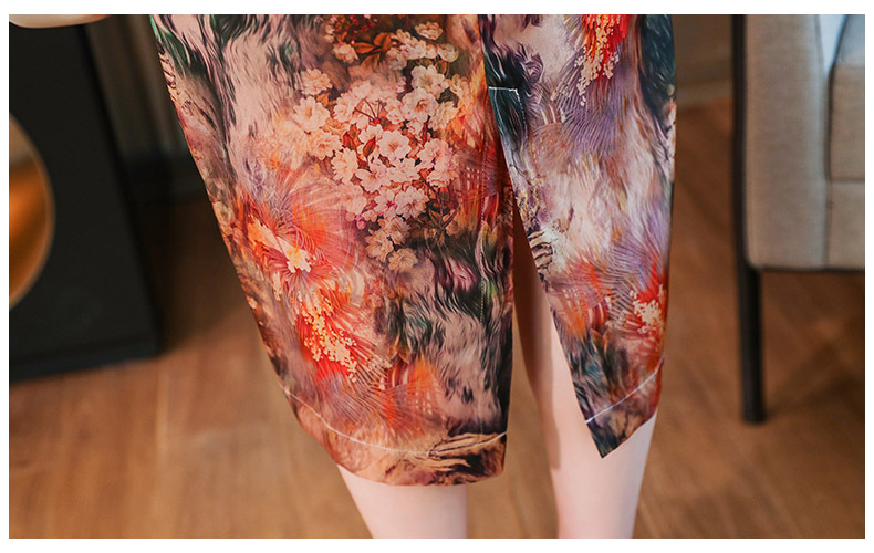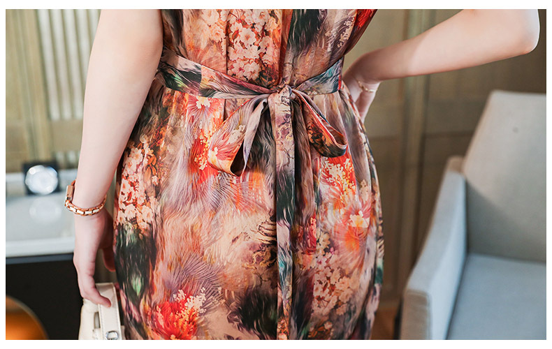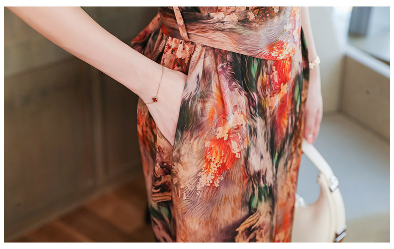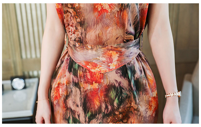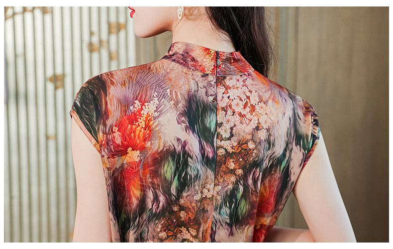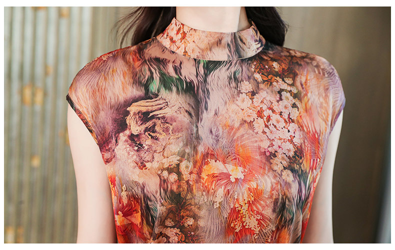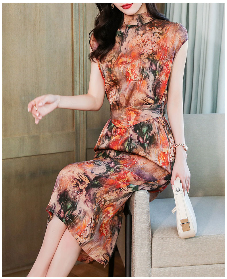 优雅修身,收腰显瘦真丝包袖植物花卉桑蚕丝半高领连衣裙MZC-X9933