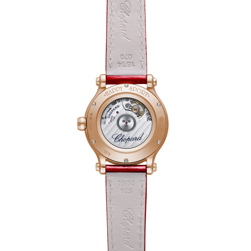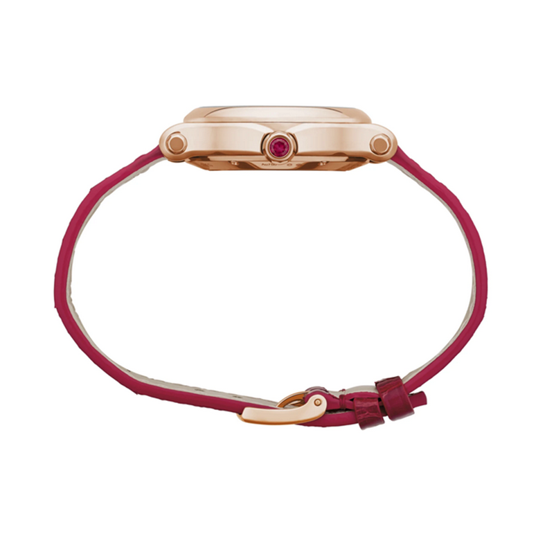 镜面材质 | 蓝宝石水晶玻璃 | 表盘 | 18k玫瑰金表壳 凹凸质感的红色珍珠母贝表盘,白色移印元件;8颗灵动钻石;镀金罗马数字时标和白色铁轨分钟圈;镀金锥形时针和分针;镀金秒针 罗马文及条形时标,8钻灵动钻石 背透 |