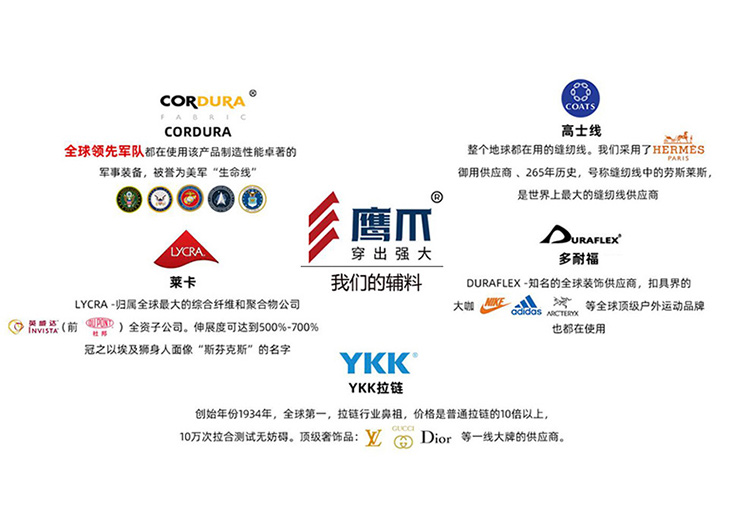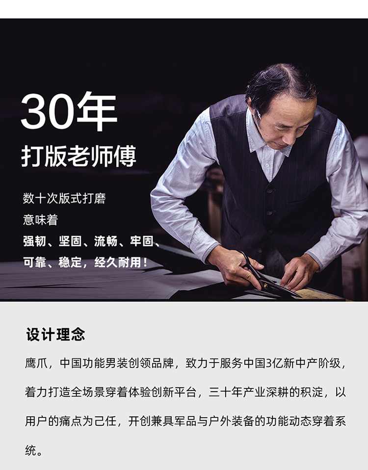 - 鹰爪,中国功能男装创领品牌,致力于服务中国3亿新中产阶级,着力打造全场景穿着体验创新平台,三十年产业深耕的积淀,以用户的痛点为己任,开创兼具军品与户外装备的功能动态穿着系统。