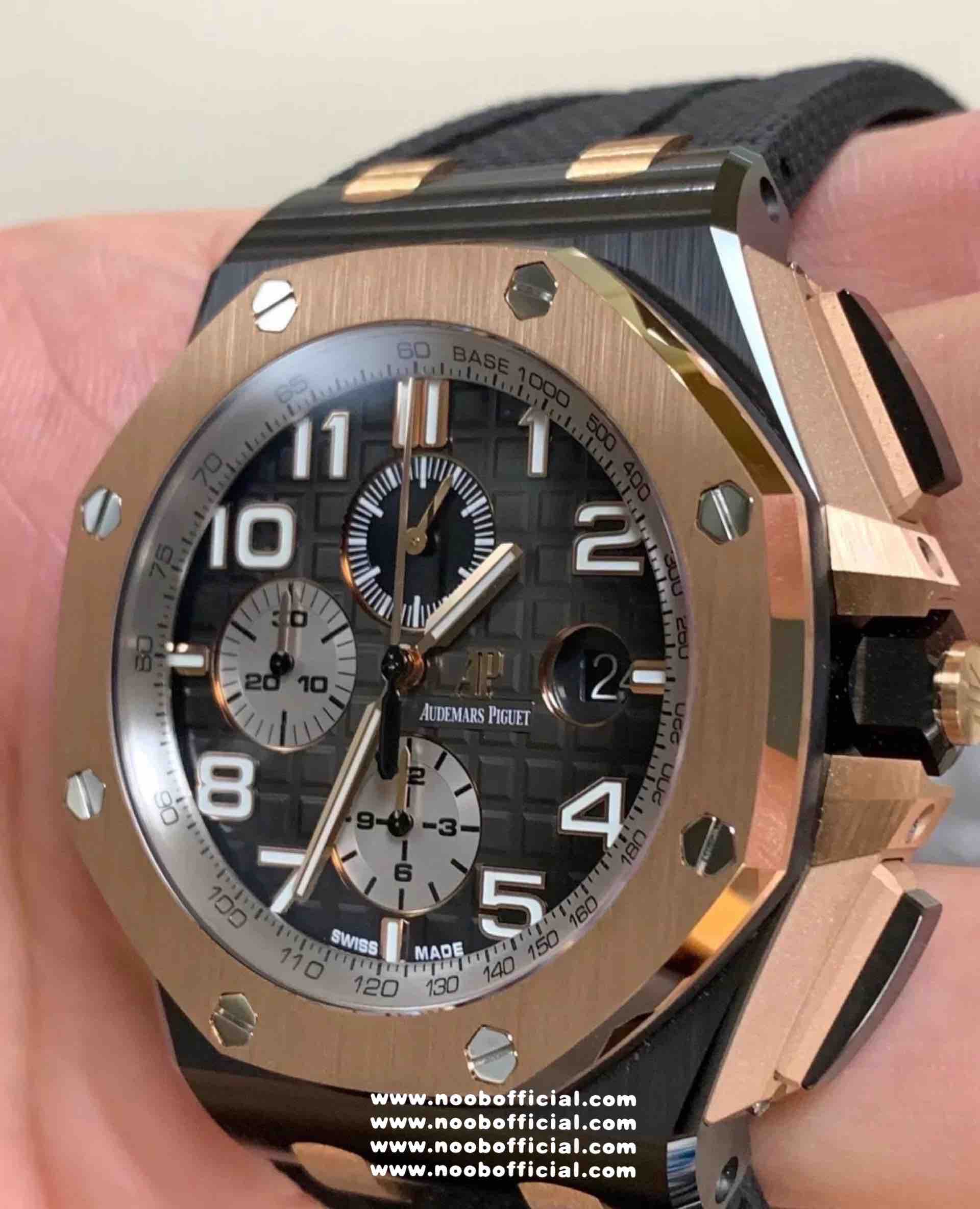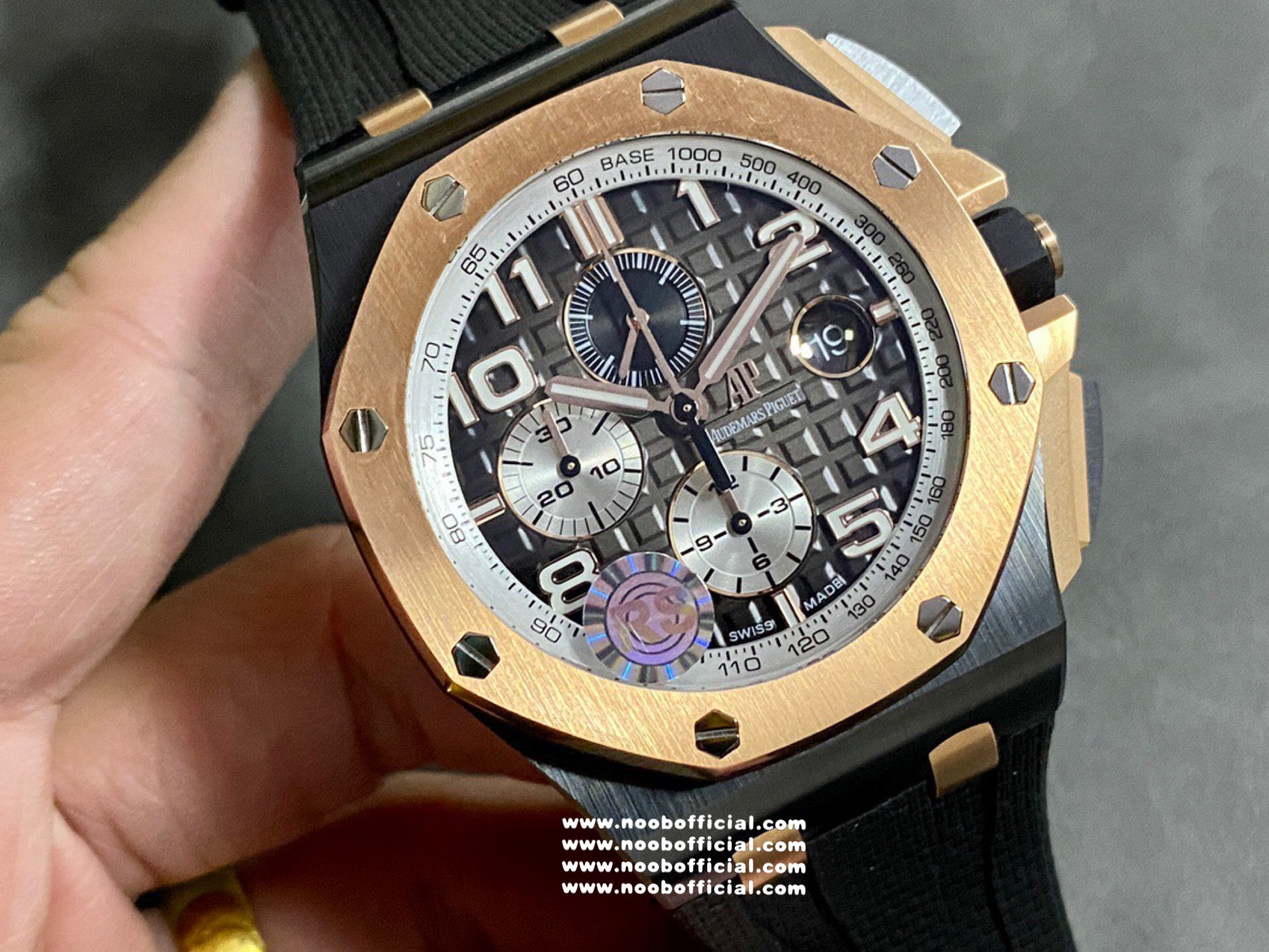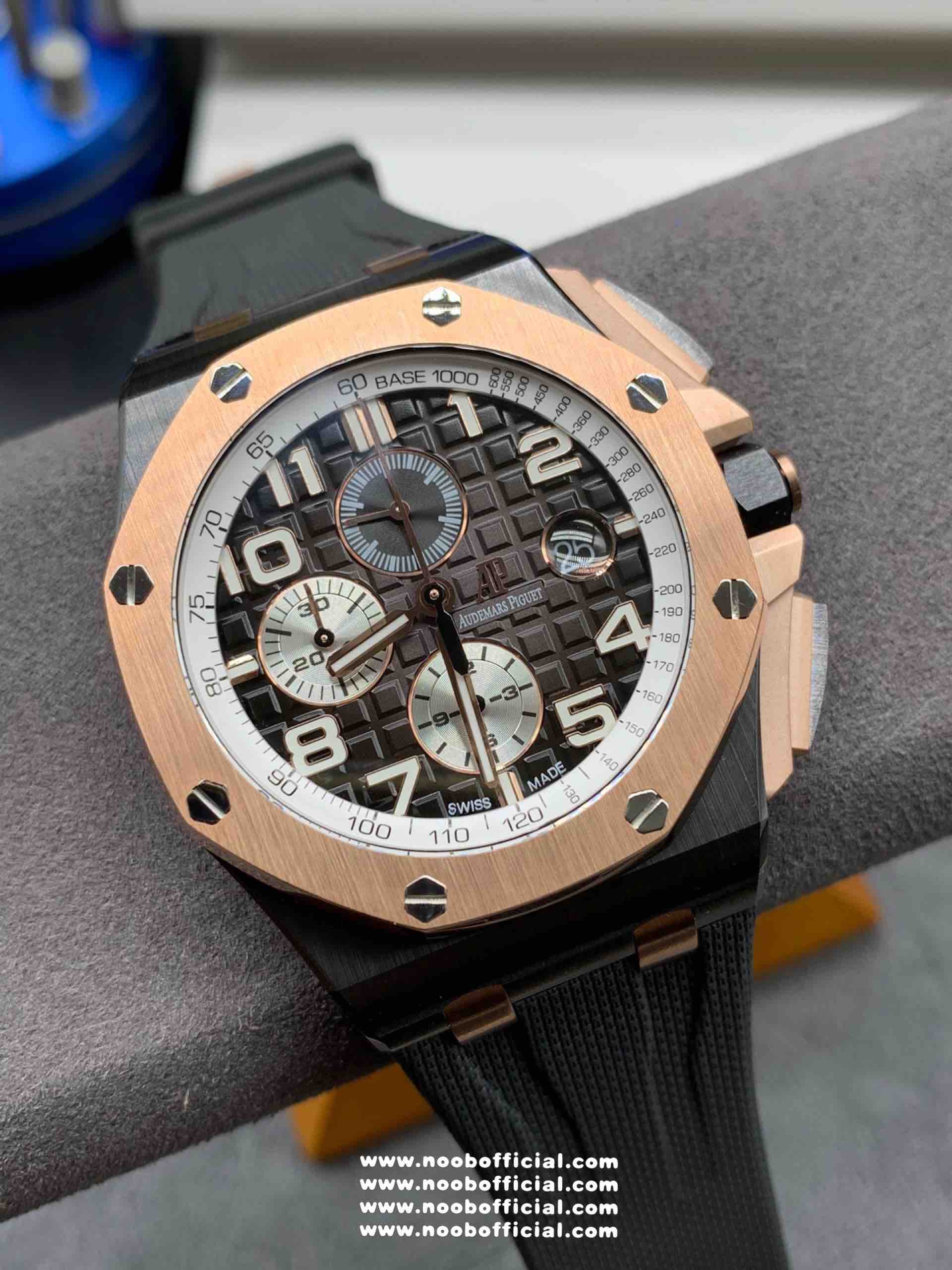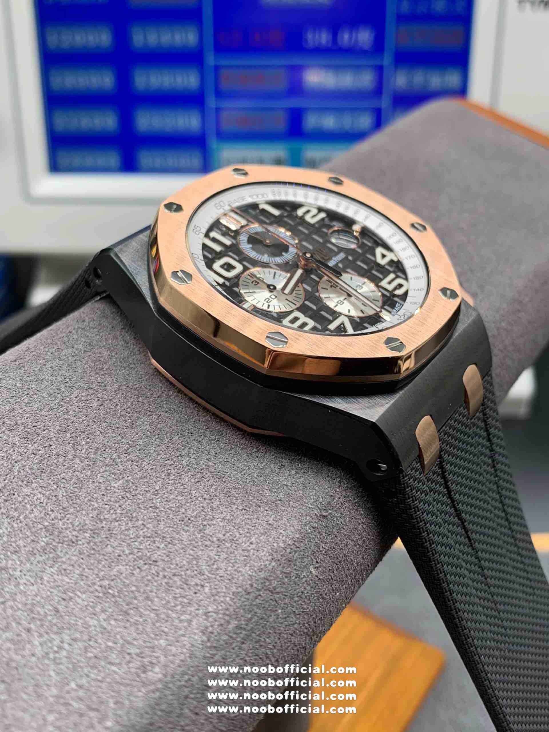 革命性的突破,划时代的产品,Noob MakerFactory 彩色陶瓷横空出世!爱彼皇家橡树离岸型26405系列彩色陶瓷腕表。工厂引用全新的彩色陶瓷锻造技术,表壳与圈口的选料,不惜重本使用日本进口的氧化锆,无需任何颜料,以超高的压力与超高的温度锻造,形成超高密度的彩色陶瓷,再经过百里挑一,确保每一个成品都与原版毫无色差,真正做到不惧任何口嗨者与键盘侠的鸡蛋里挑骨头!CNC级别的打磨,将整一个表壳的边边角角完美处理,即使陶瓷,也做到毫不割手。圈口的拉丝,经过顶级的打磨技术,做到每一丝每一线都毫无断续,每一颗六角螺丝都与表框处在同一平面,拒绝一丝一毫的凸显与凹陷,诠释了何为顶级的复刻工艺!表盘以爱彼经典的大格纹为背景,一个个层次分明的方格排列,经过完美的打磨,将尽善尽美体现得淋漓尽致。三个小表盘凸显于表壳之上,六点位跟九点位的绿色和蓝色表针十分耀眼,十二点位的小秒盘,每一个小圆圈都做到排列有序。三点位的日历表盘,在蓝宝石玻璃凹透镜的作用下,TPE扩大效果与原版一般无二。每一根大小表针,无论从各个角度来看都没有出现毛刺现象,这一点解决了大部分强迫症表友一直存在的烦恼!刻度与表针中间部位都采用瑞士进口夜光粉,每一个个体都做到手工填充,均匀饱满度是机器填充远远比拟不了的,亮度与发光颜色与原版几乎一致!机芯方面采用7750改3126的计时机芯,十二位的小秒,六点位和九点位的12小时计时与30分钟计时,完美的还原了原版的所有功能,经过团队的精密打磨,大大提升了7750基础机芯的稳定性,缓解了一直以来计时机芯款式空有其表的尴尬现象!做到无可挑剔,堪称天花板级别,欢迎广大表友品鉴!