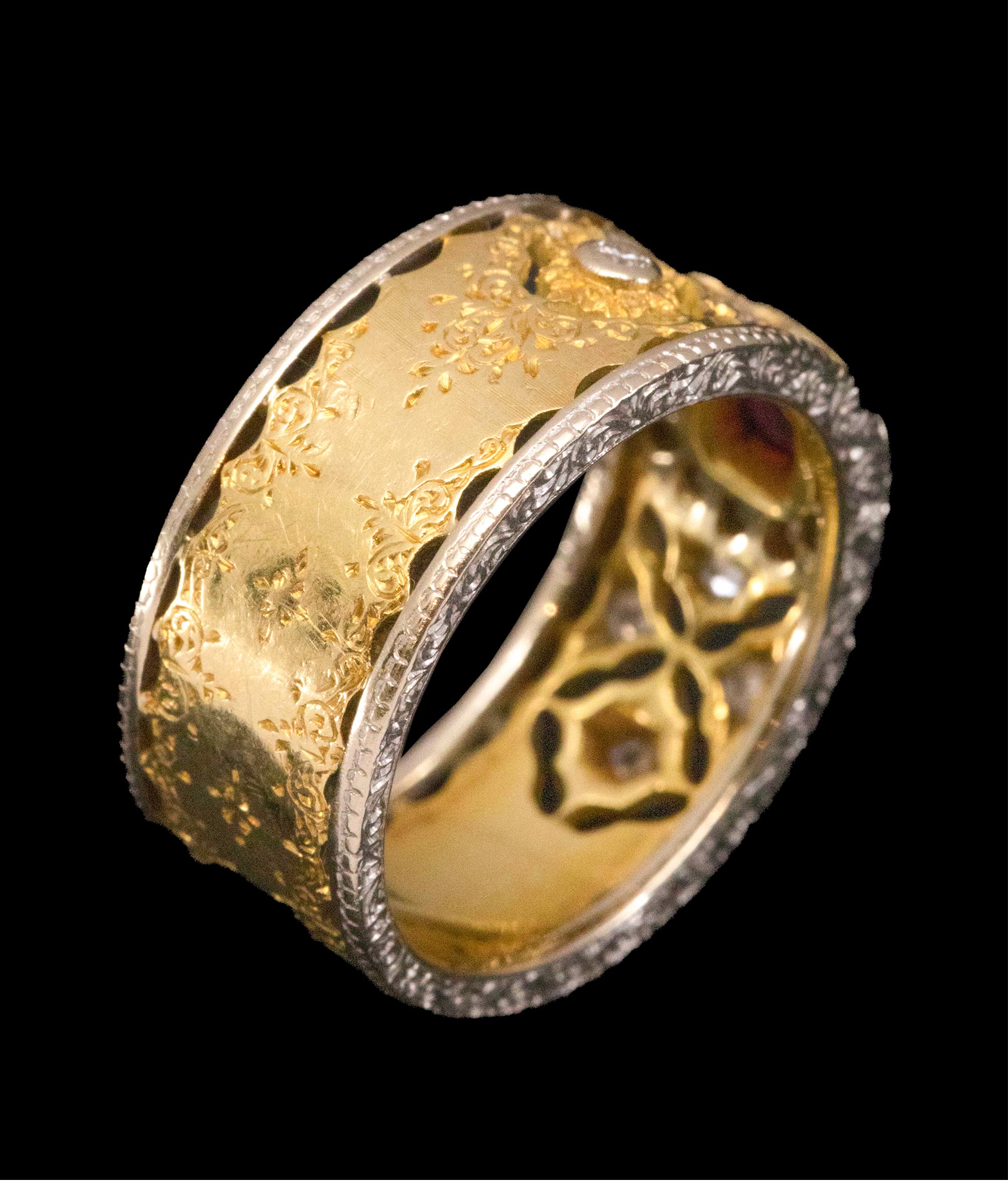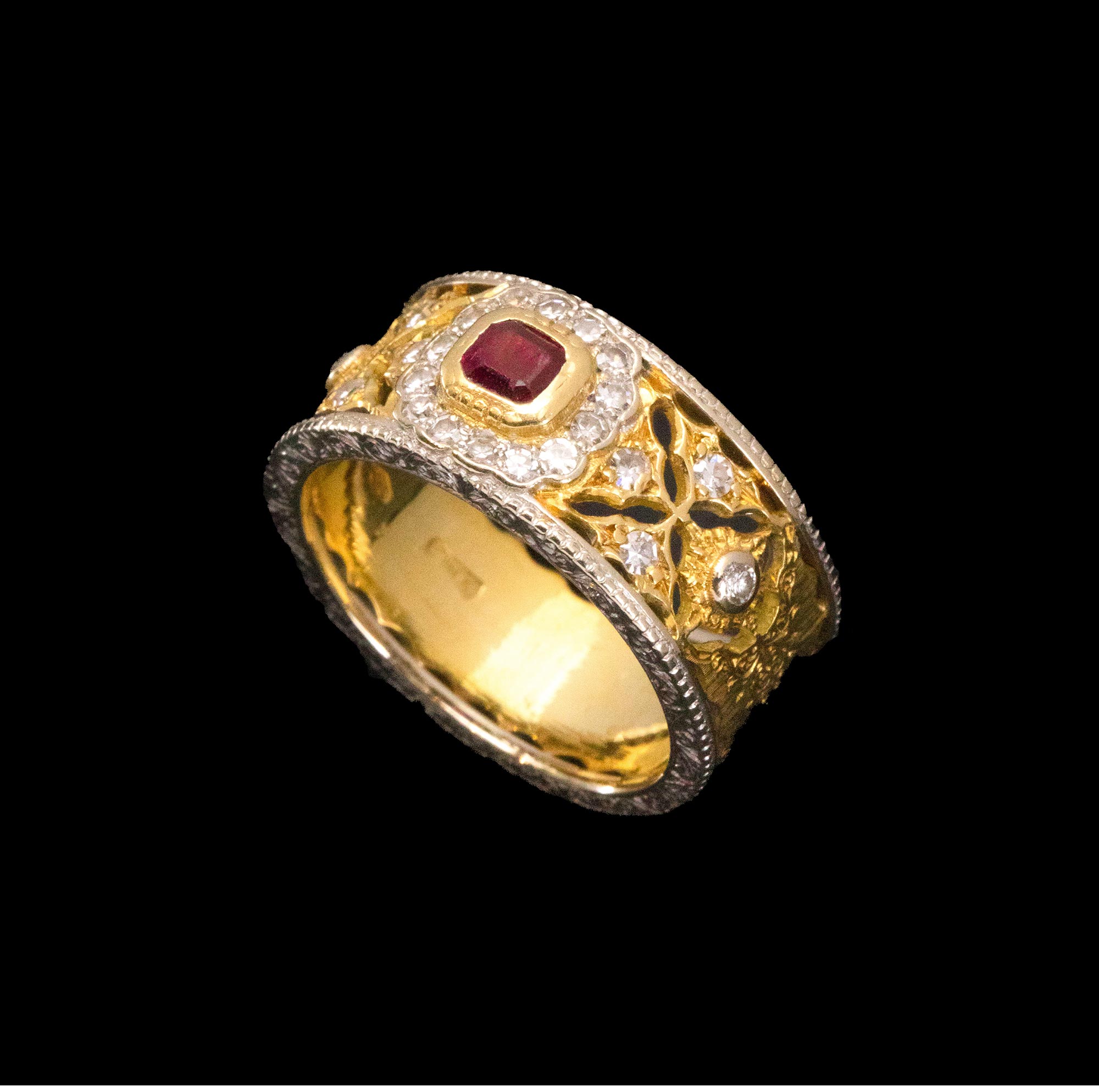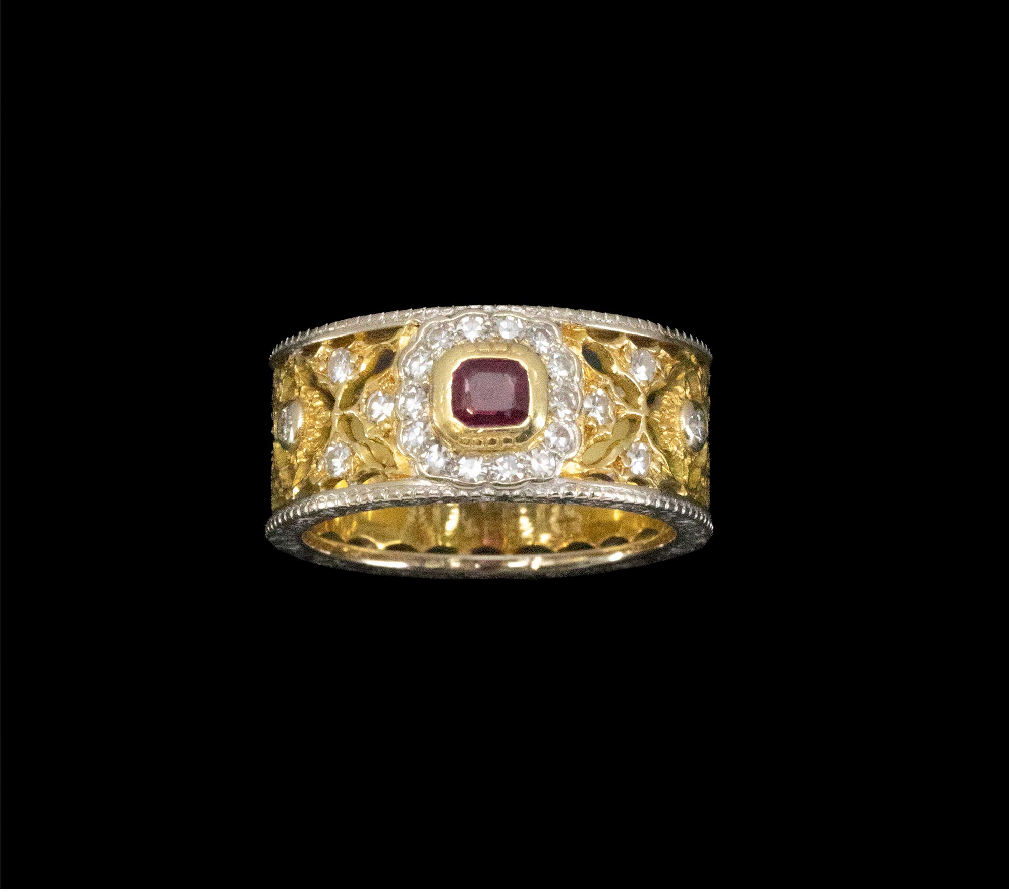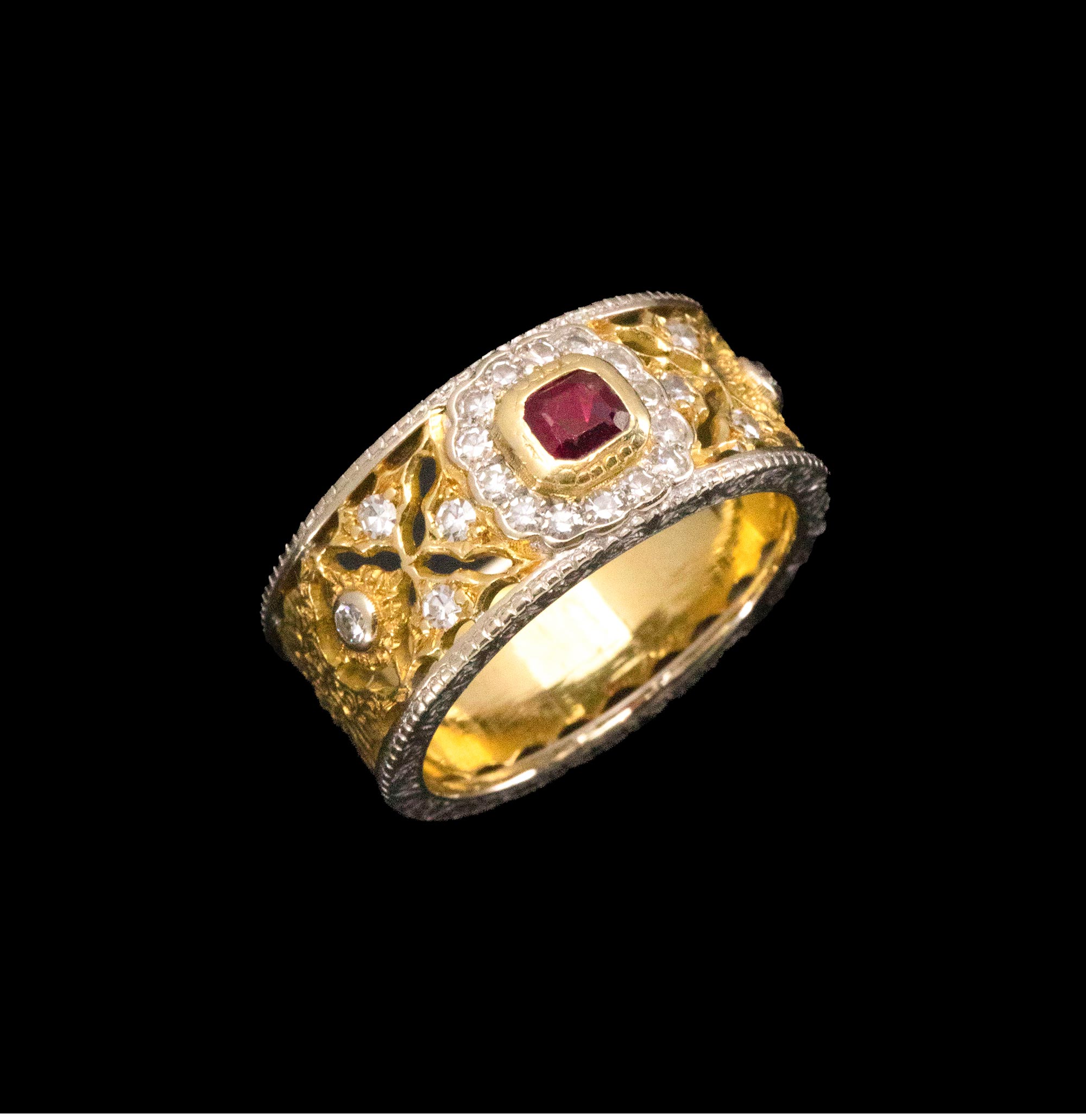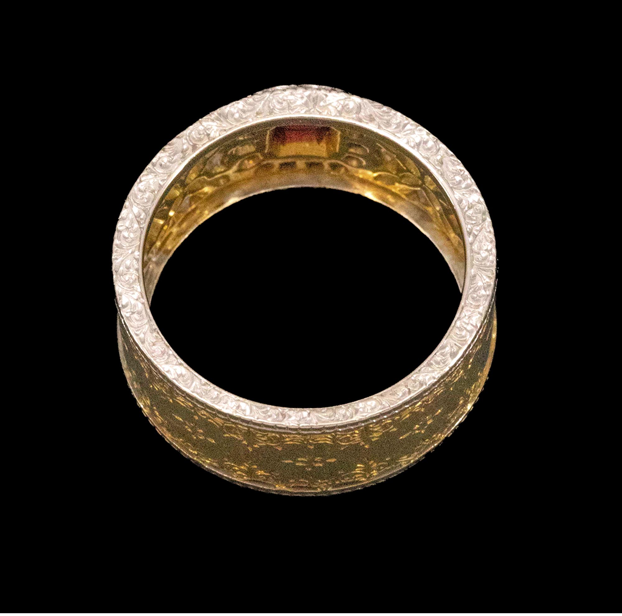 1970年代意大利顶级珠宝工坊布契拉提出品18K黄金及白金镂雕镶嵌钻石及红宝石戒指