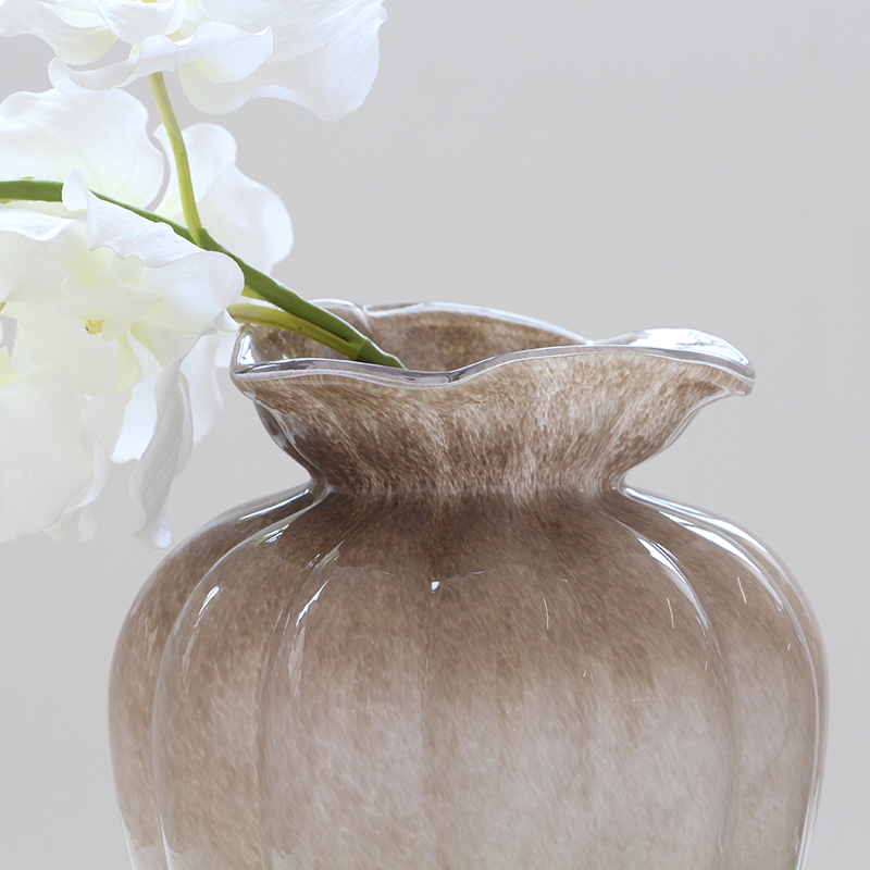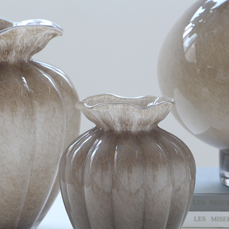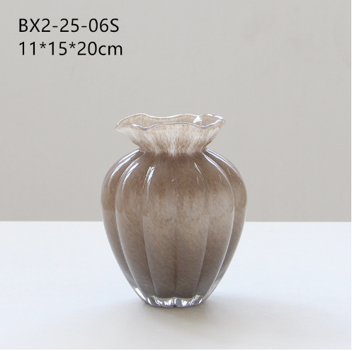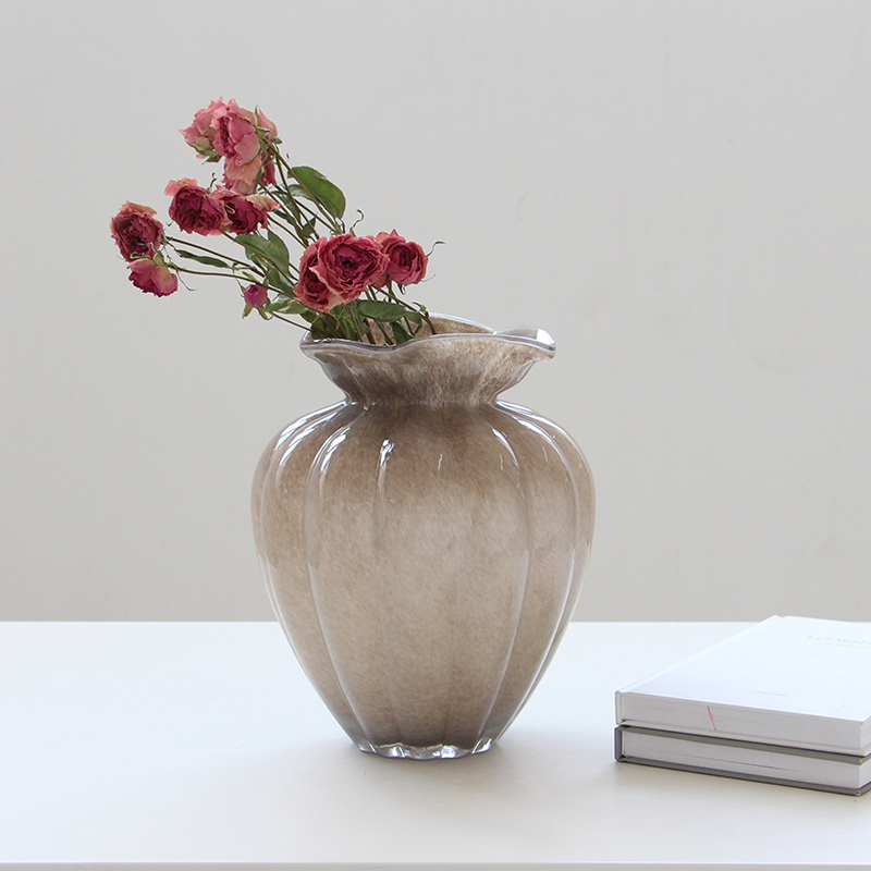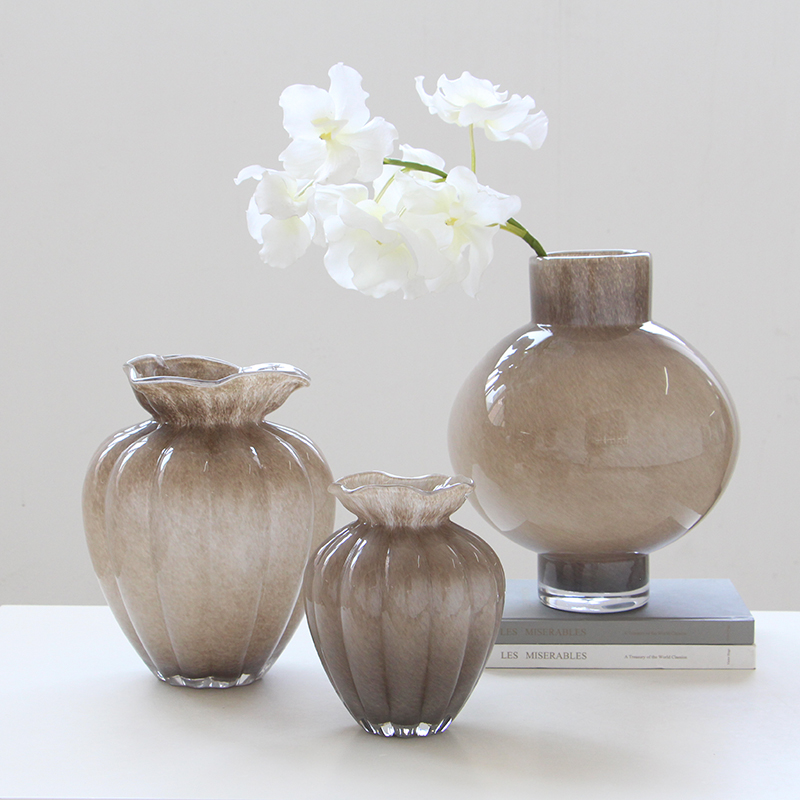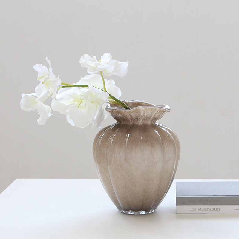 法式中古巧克力灰磁玻璃花瓶荷叶口高级感轻奢水培家居鲜花装饰品