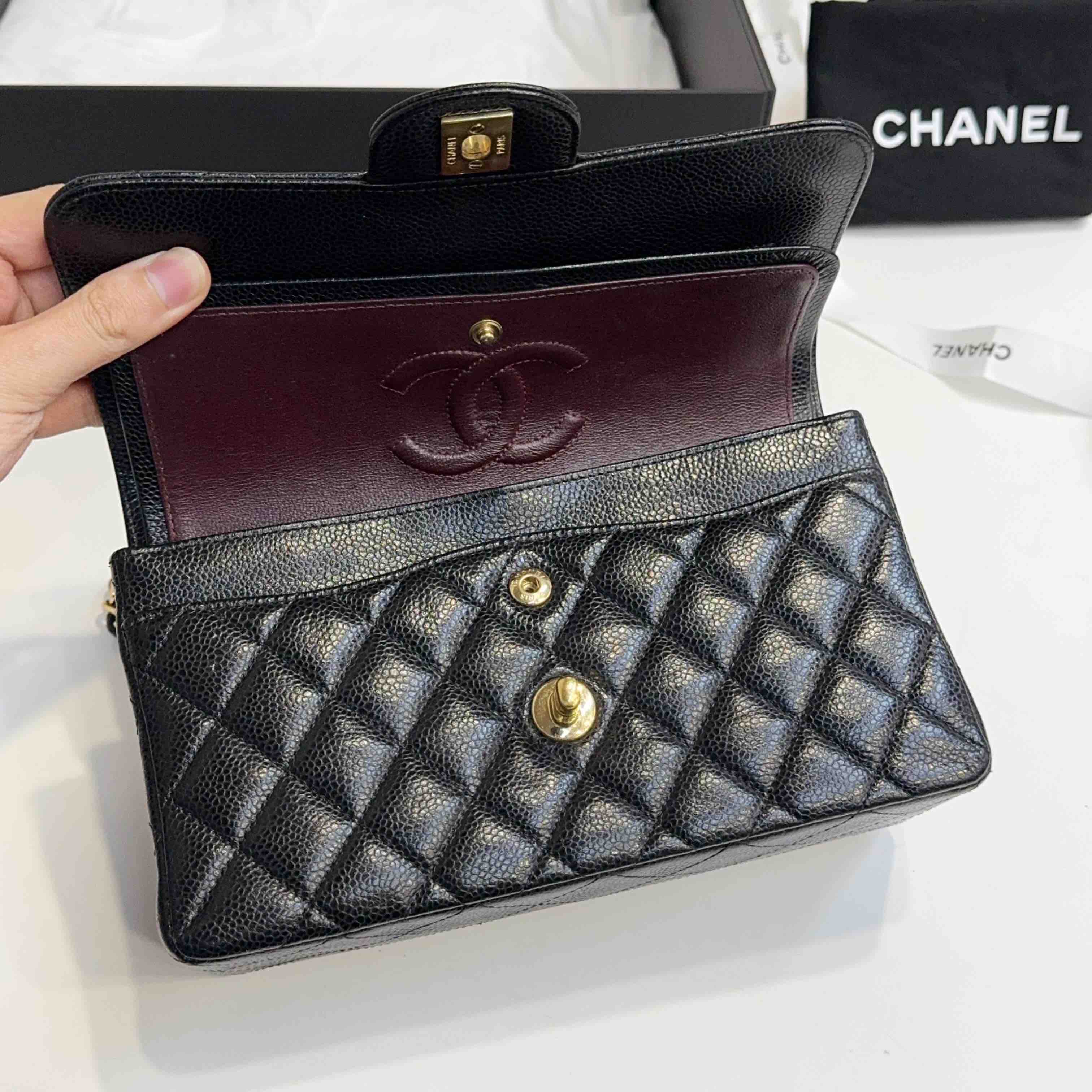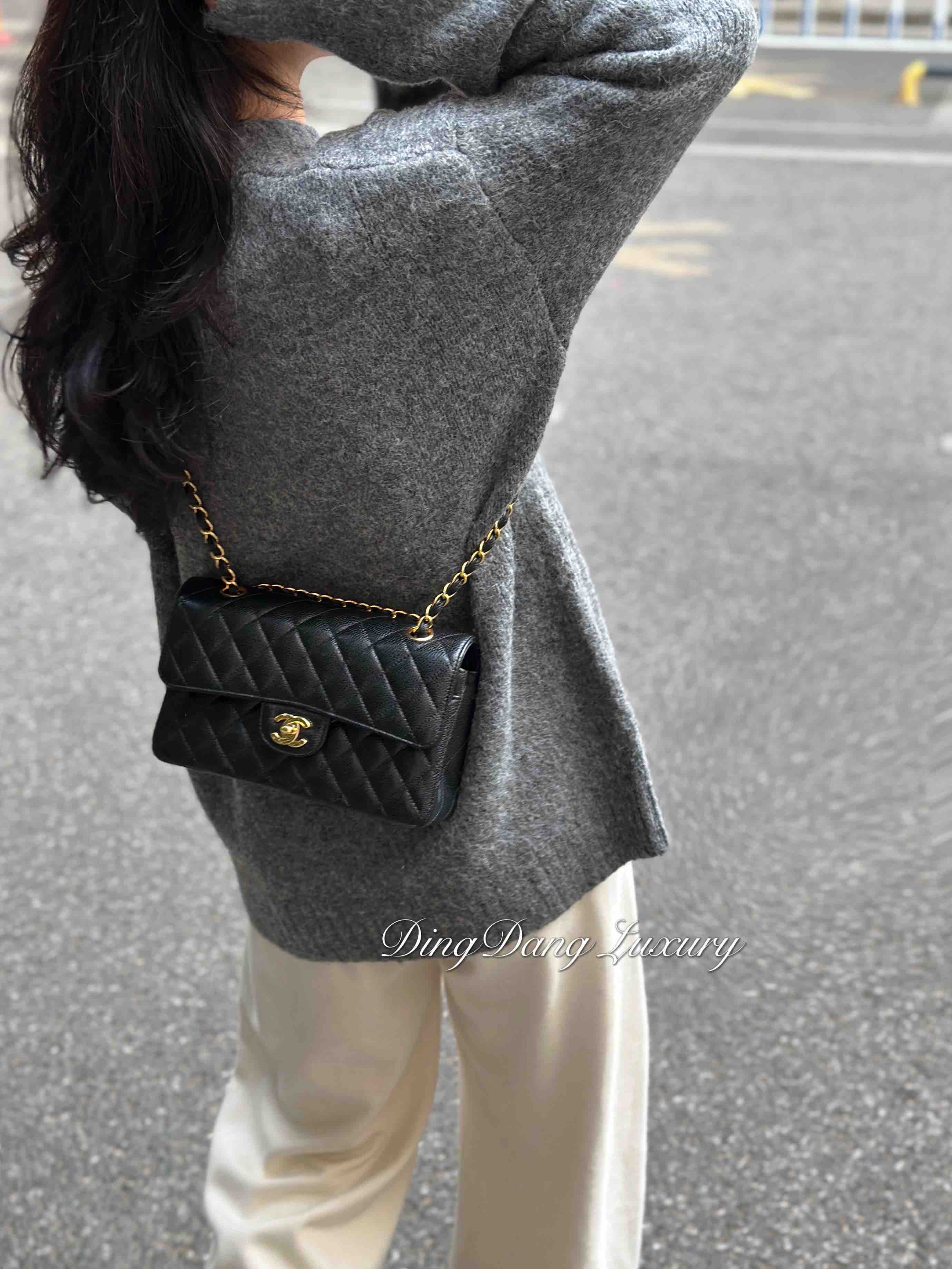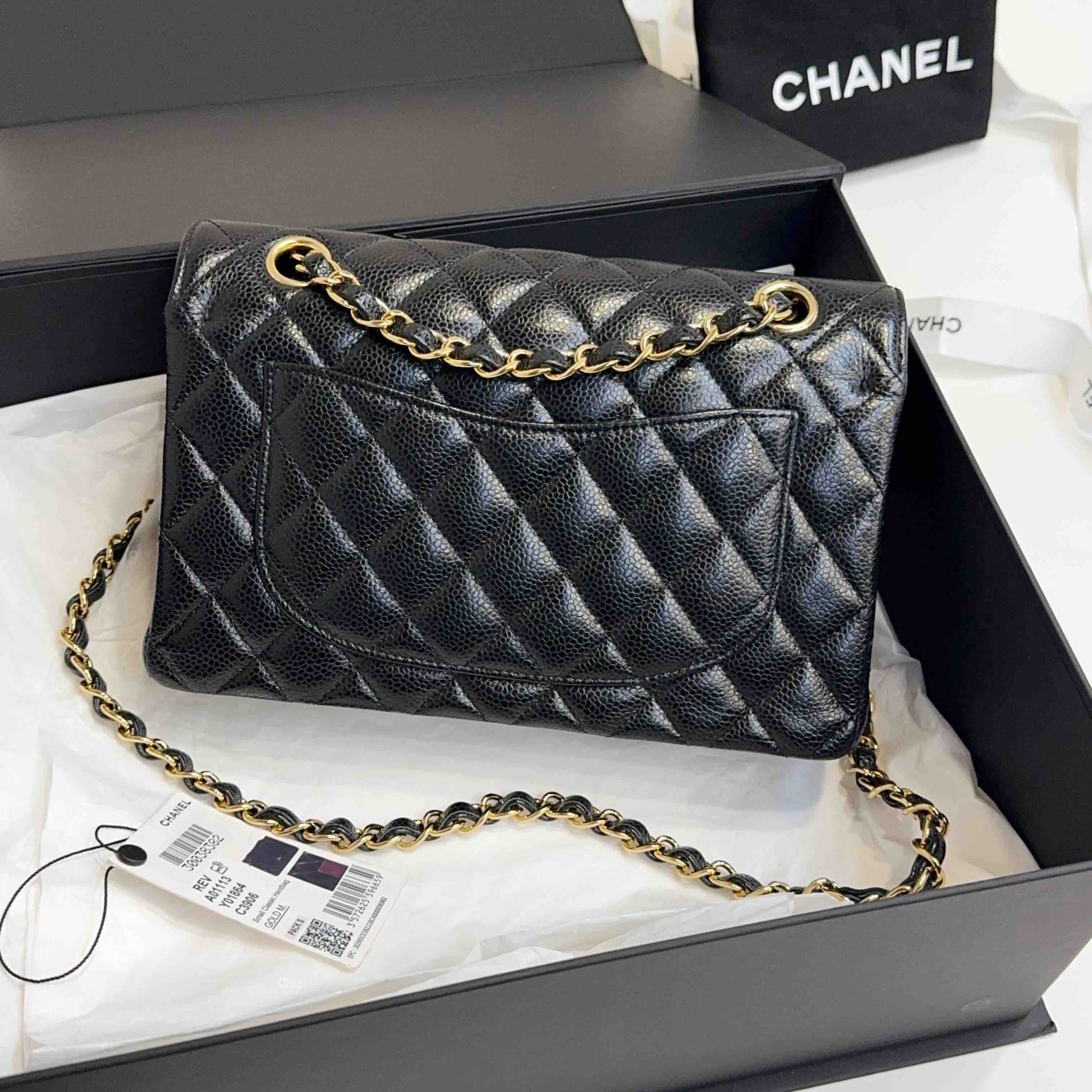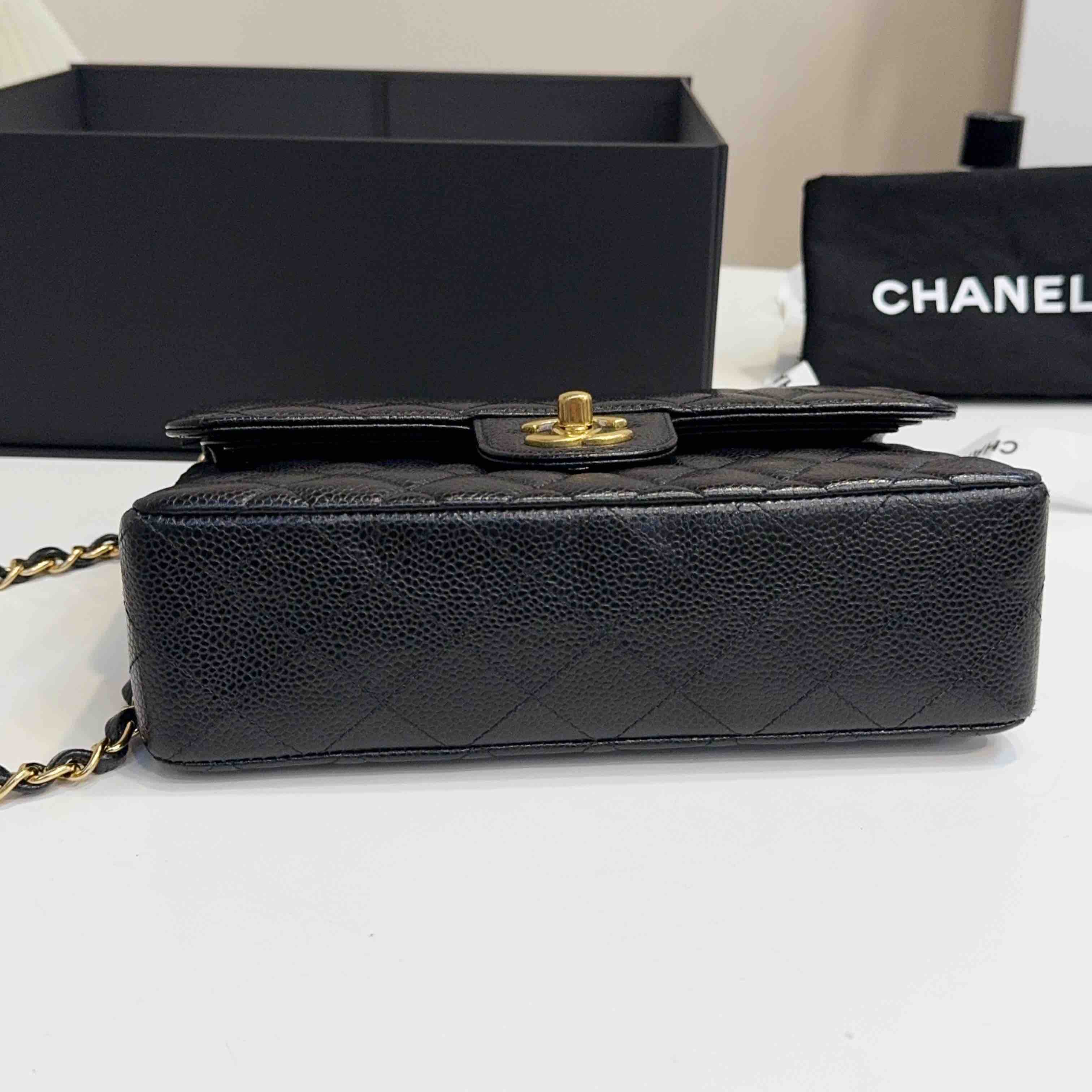 【商品详情】正品二手 Chanel CF 黑金 荔枝纹牛皮 小号 单肩包👜97新 23x16 镭射30开 配件:盒子 防尘袋 吊牌。边角和logo五金有微微使用感 包内有一处磨损 精致优雅感拉满