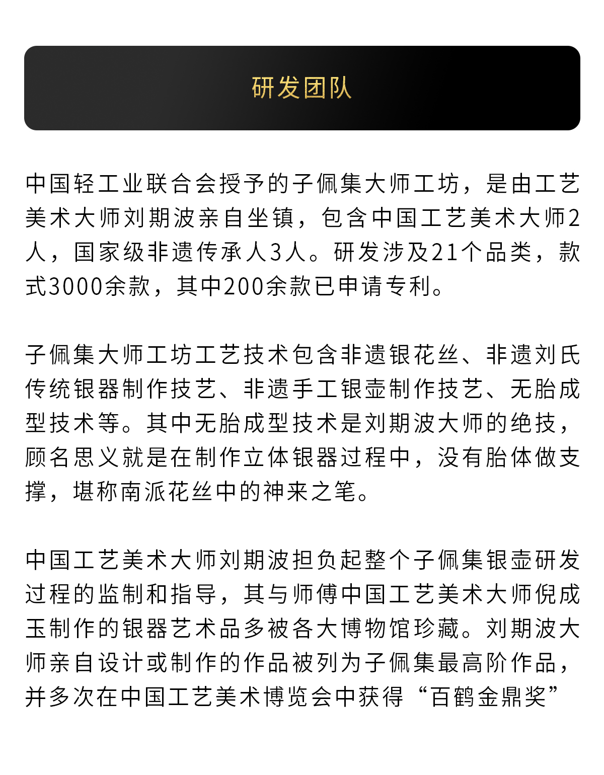 - 国家级非遗项目成都银花丝优秀传承单位 四川工艺美术行业协会副会长单位 四川传统文化促进会常务副会长单位 成都非物质文化遗产保护中心协会会员单位 国货品牌 历史400余年