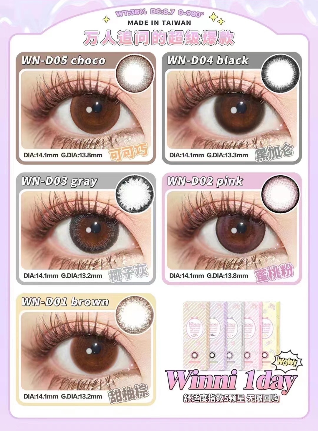 winni 日抛,78/盒,146/两盒,288/四盒,428/六盒,550/八盒,999/十六盒(一盒10片装相同度数款式,左右眼度数不同至少需要拍两盒),如需佩戴工具请备注哦!