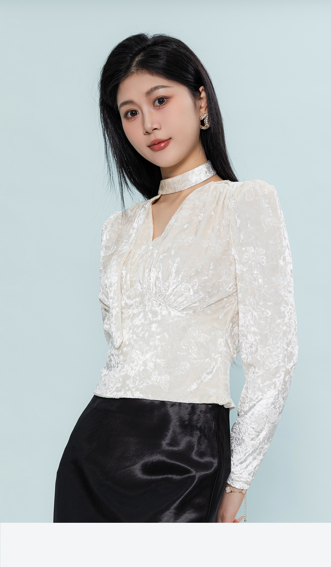 夏上新V领收腰泡泡袖设计感小众气质通勤小衫1262011