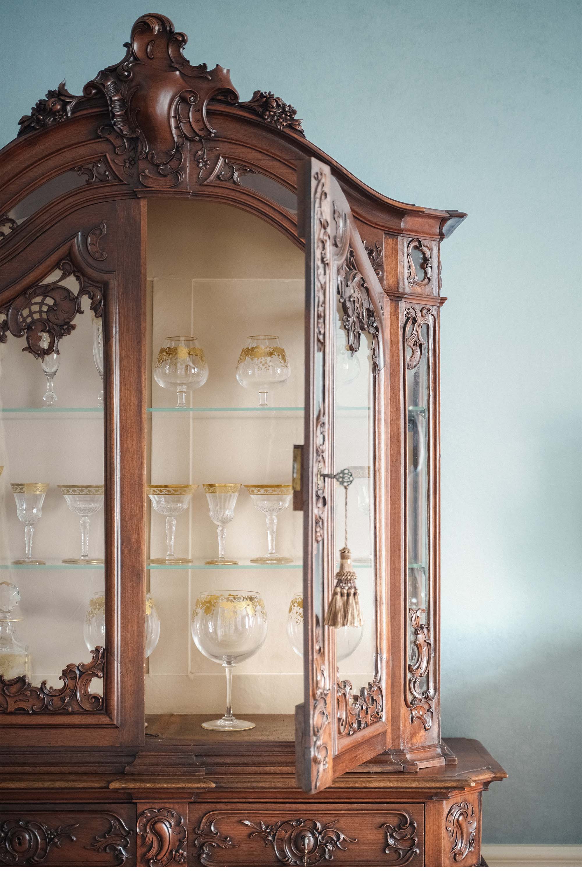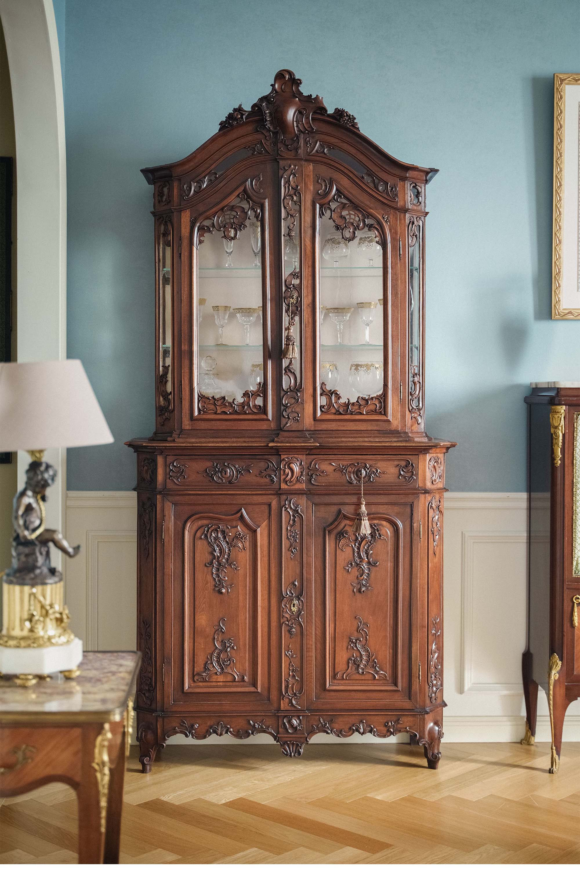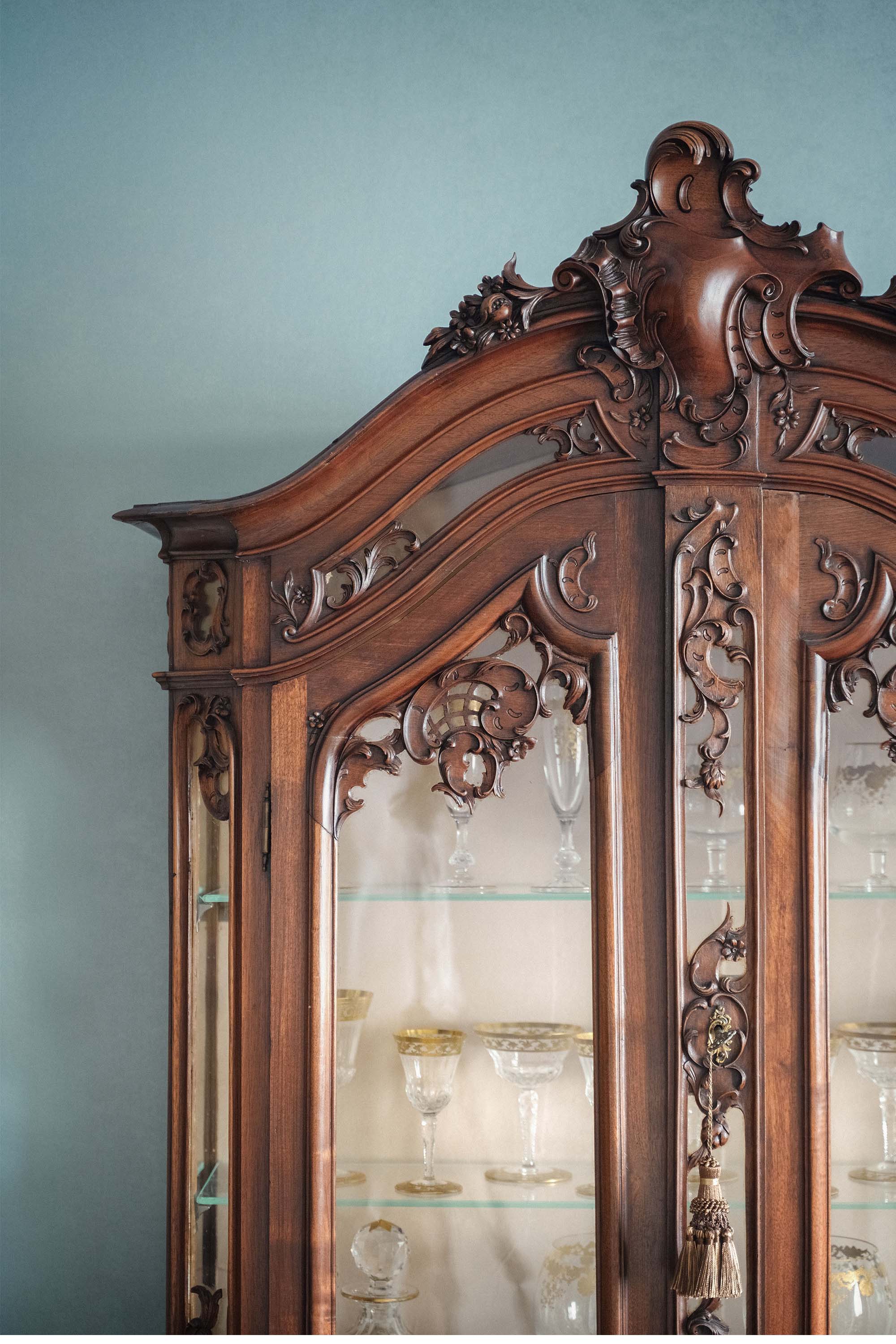 1890年代法国出品路易十五风格花卉卷叶主题胡桃木精雕装饰玻璃展柜