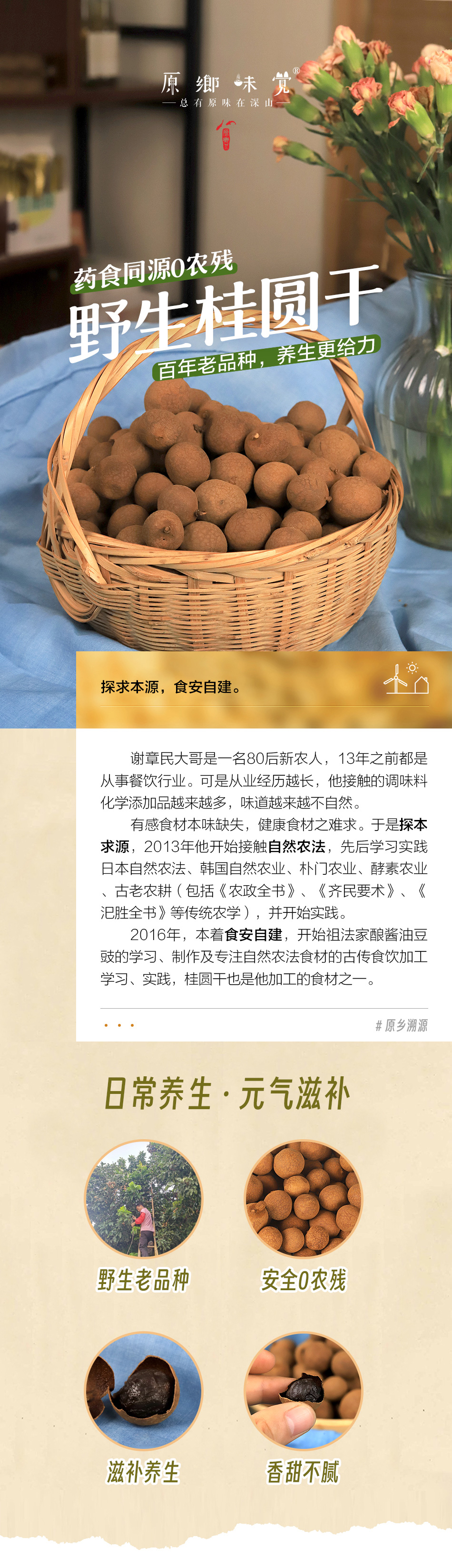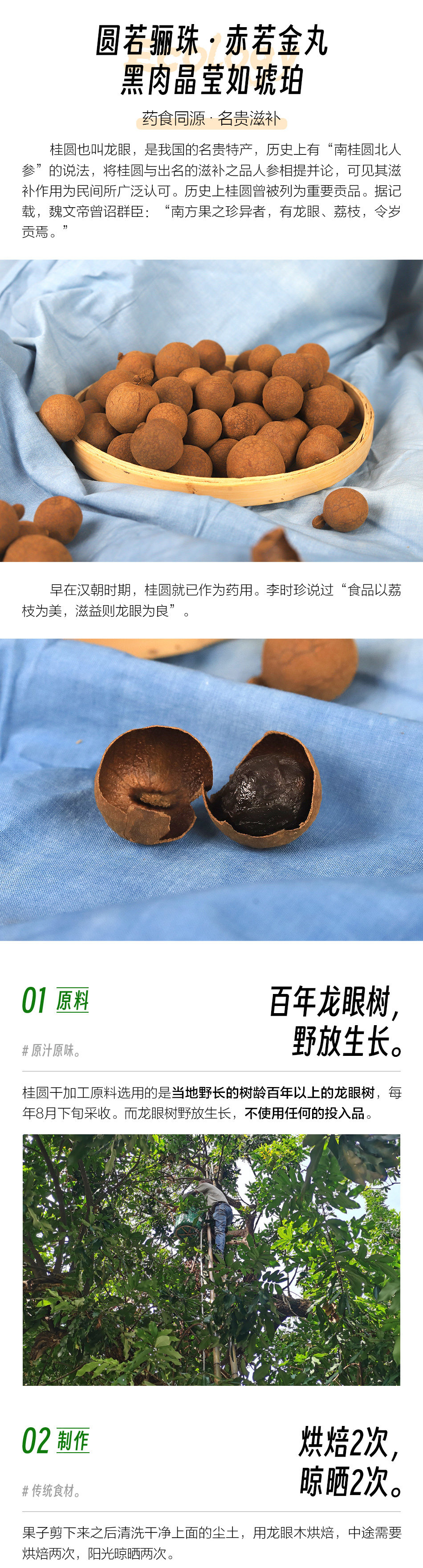【规格】:200g/罐 【生产者】:谢章民 【产地】:福建省泉州市安溪县凤城镇上山村 【生产方式】:桂圆树野生生长,不使用任何投入品,选取树龄百年以上的桂圆树,采摘后清洗,遵药用炮制,使用桂圆木两道烘干,方不改其性,再经阳光晾晒而成;不使用任何防腐剂等添加剂。 【贮存方式】:密封冷藏 【保质期】:12个月 【食用建议】:清洗捏破整个龙眼干,进行入药、煲汤、煮粥、养生茶等,不建议纯粹当作零食,甜食对待。