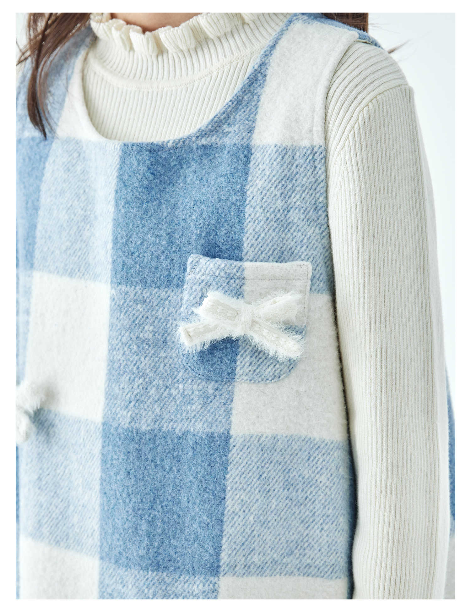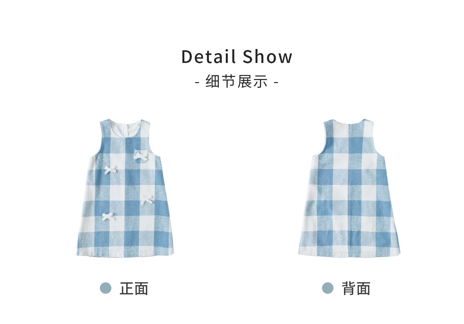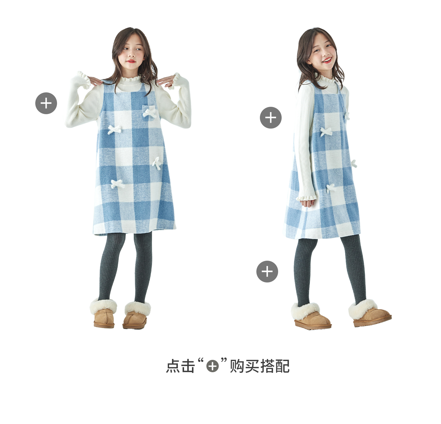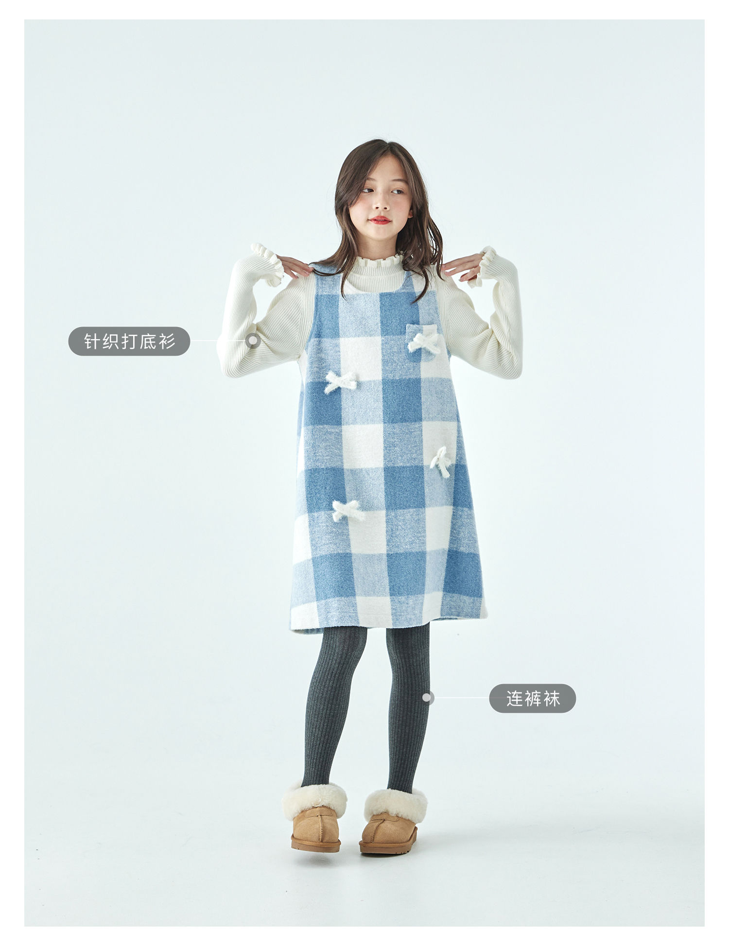 棵初25年冬季新款亲子中大女童蓝白格纹连衣裙无袖立体蝴蝶结裙子