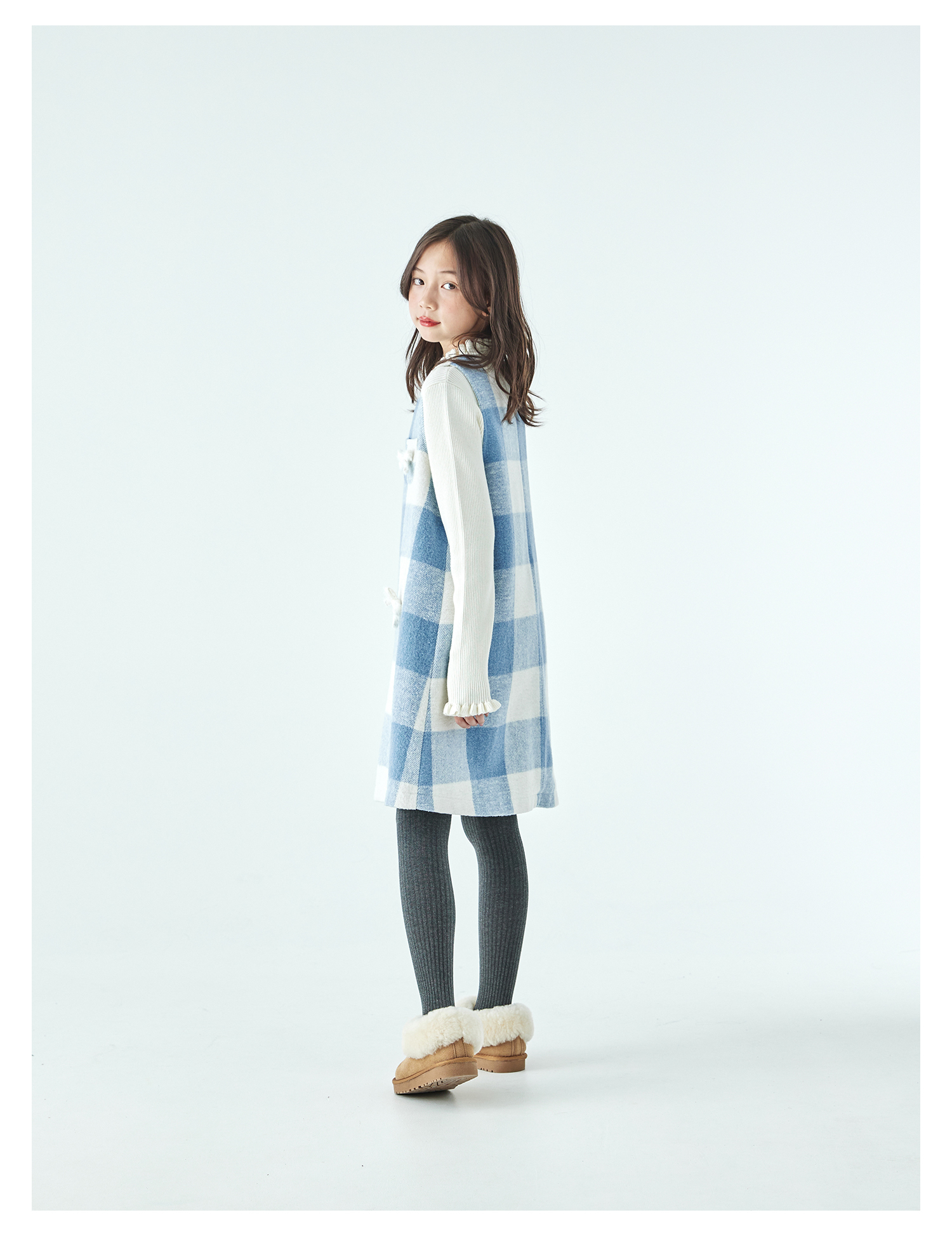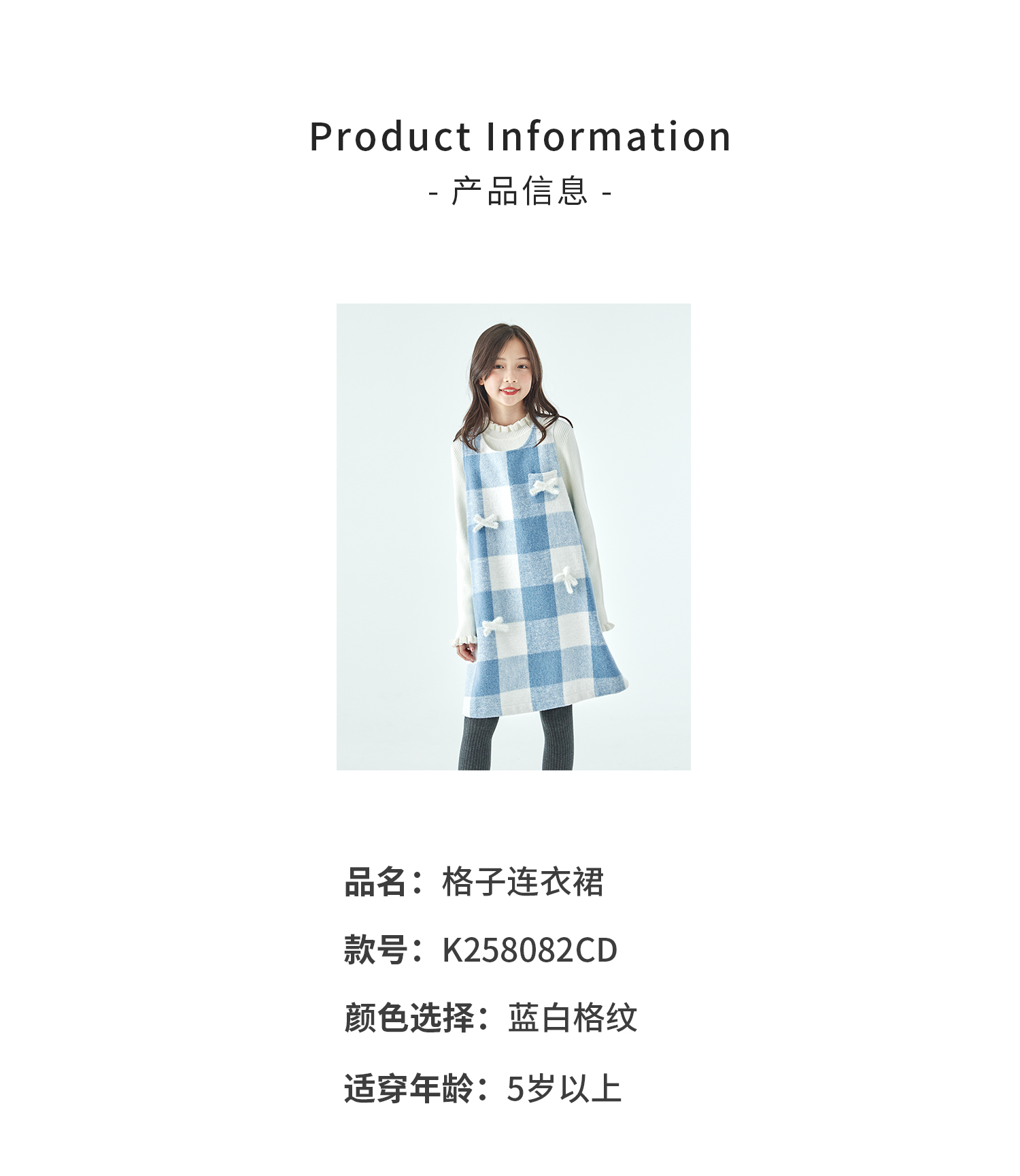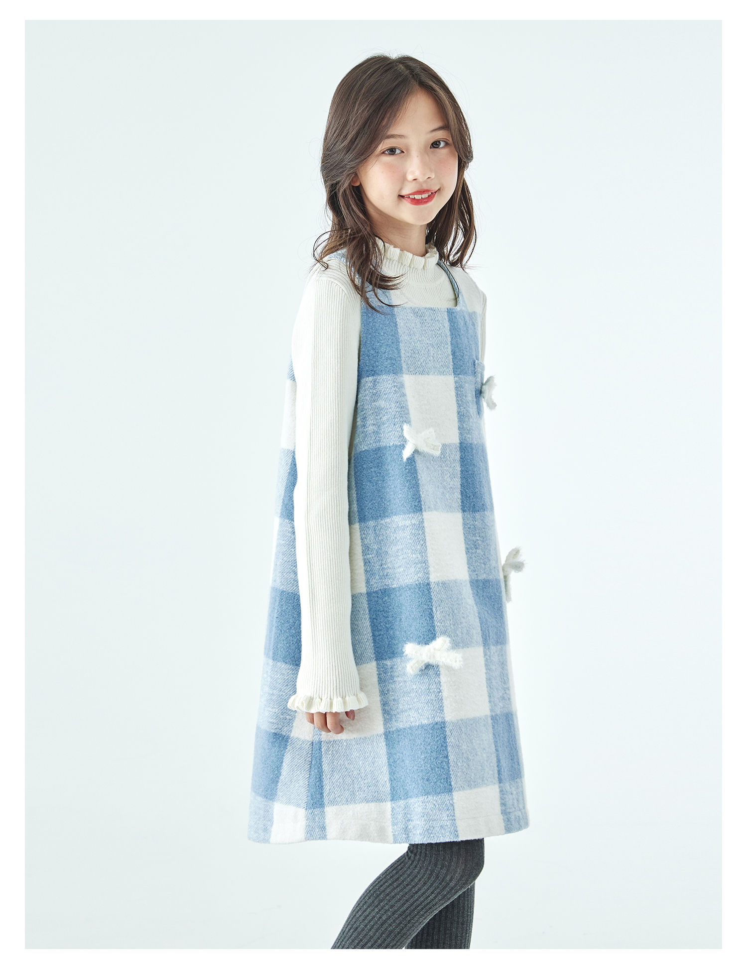 棵初25年冬季新款亲子中大女童蓝白格纹连衣裙无袖立体蝴蝶结裙子