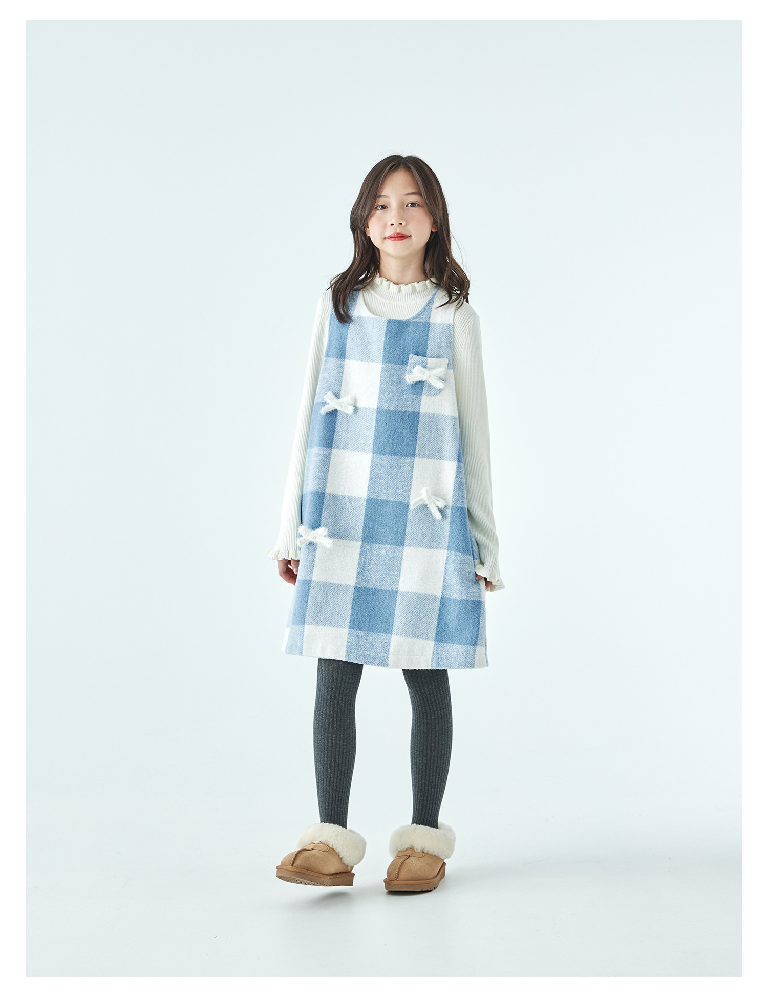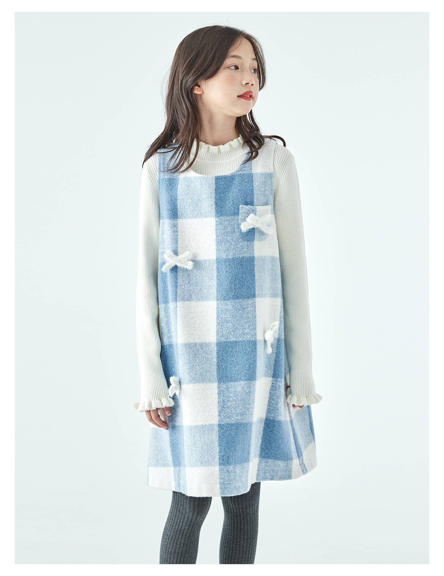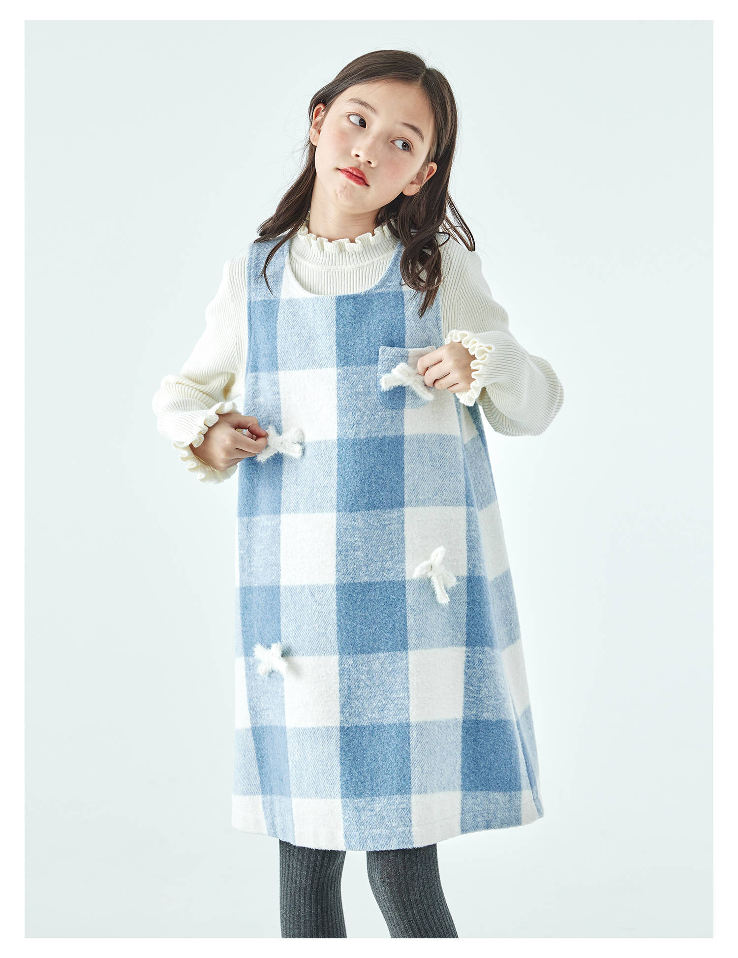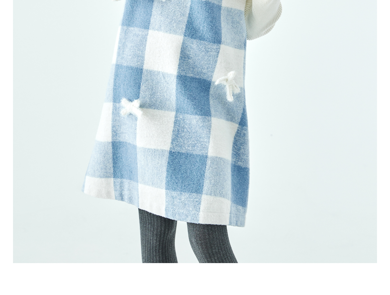 棵初25年冬季新款亲子中大女童蓝白格纹连衣裙无袖立体蝴蝶结裙子