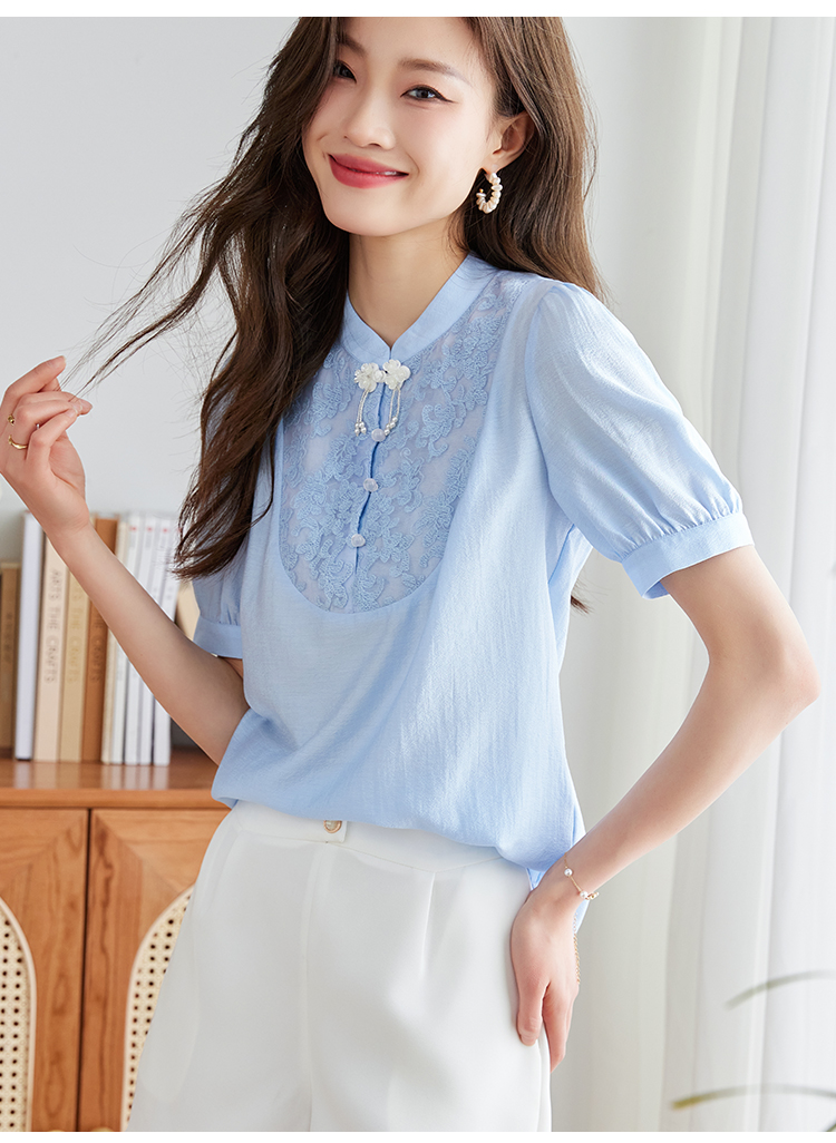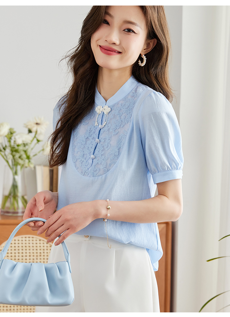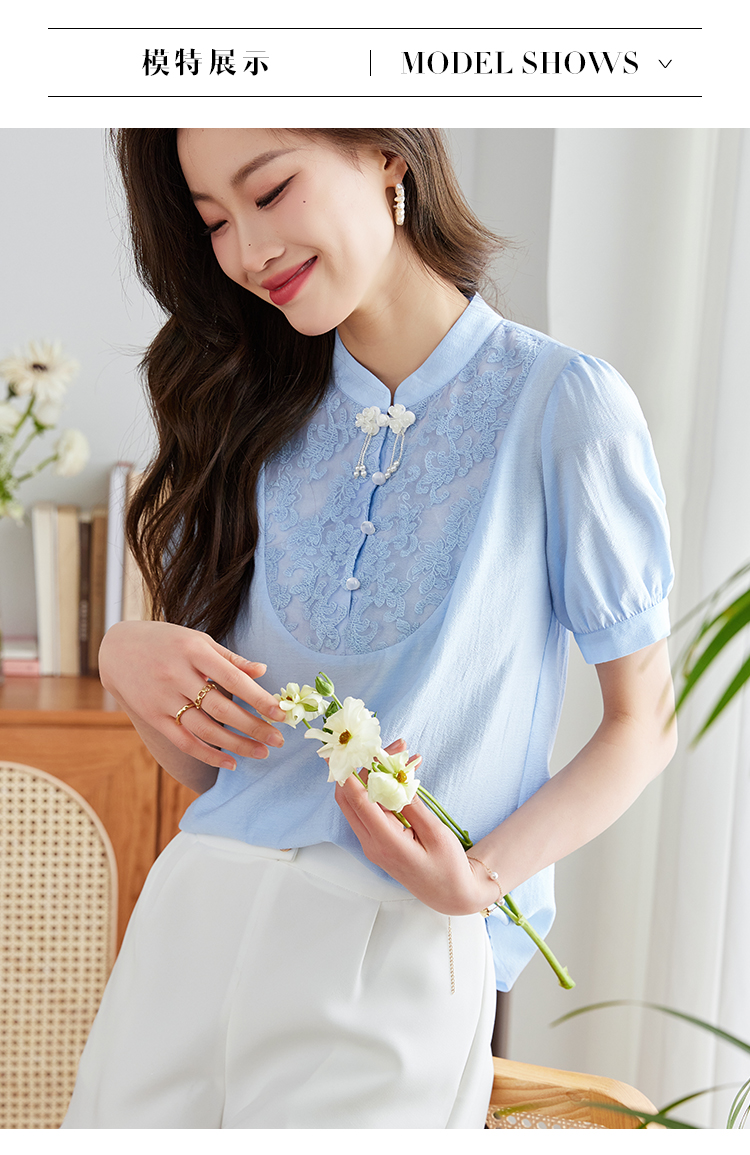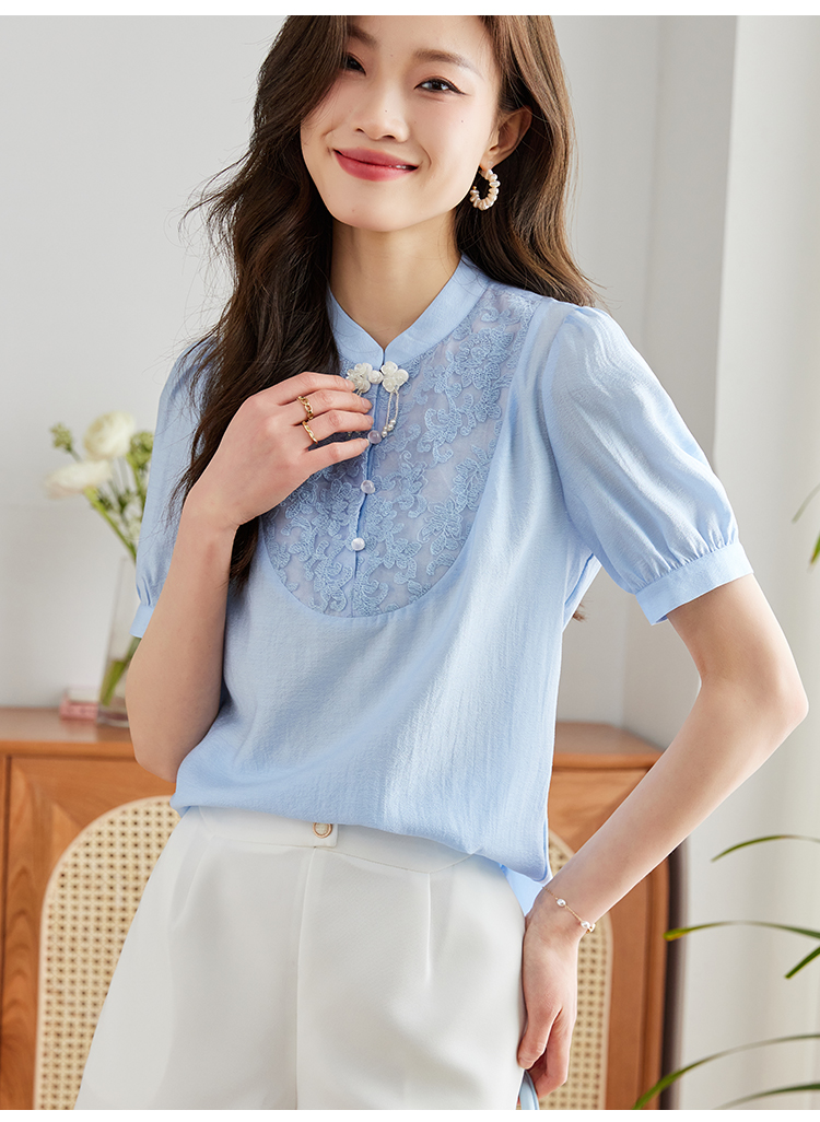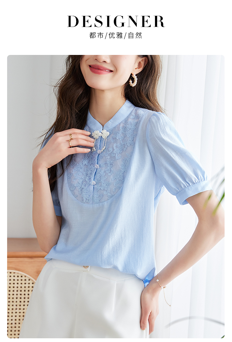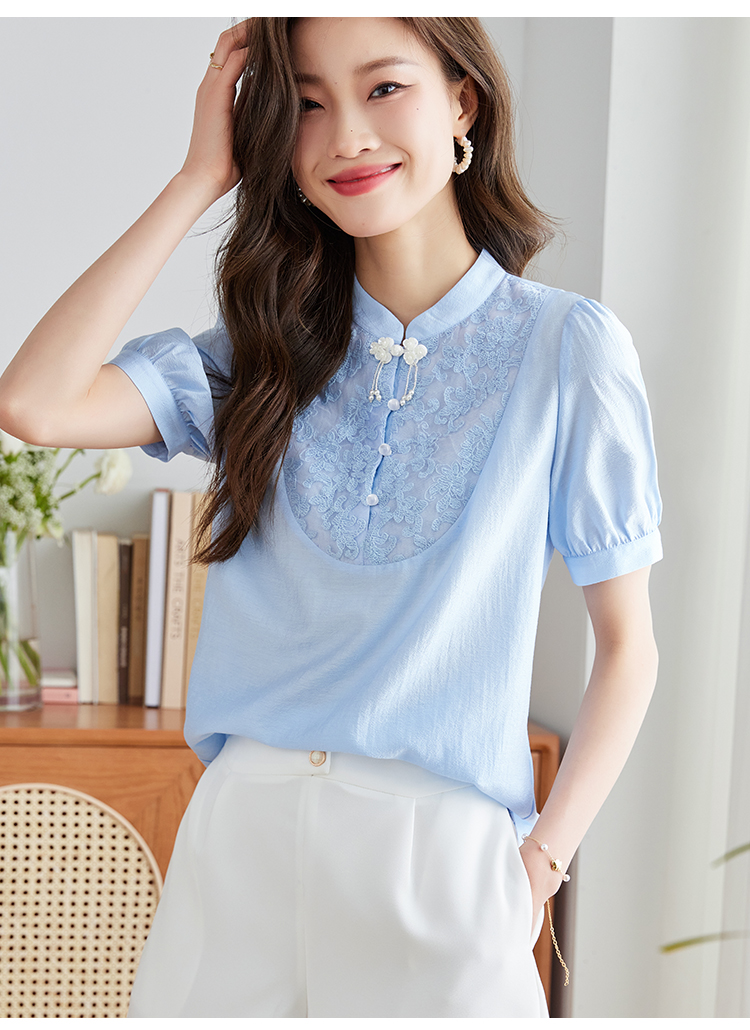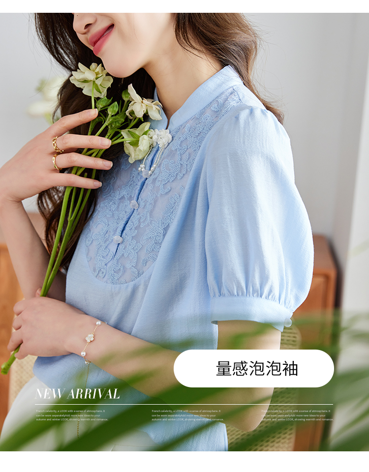 【专属特价】熙世界新中式蕾丝绣花醋酸衬衫2025夏季新款国风立领泡泡袖上衣