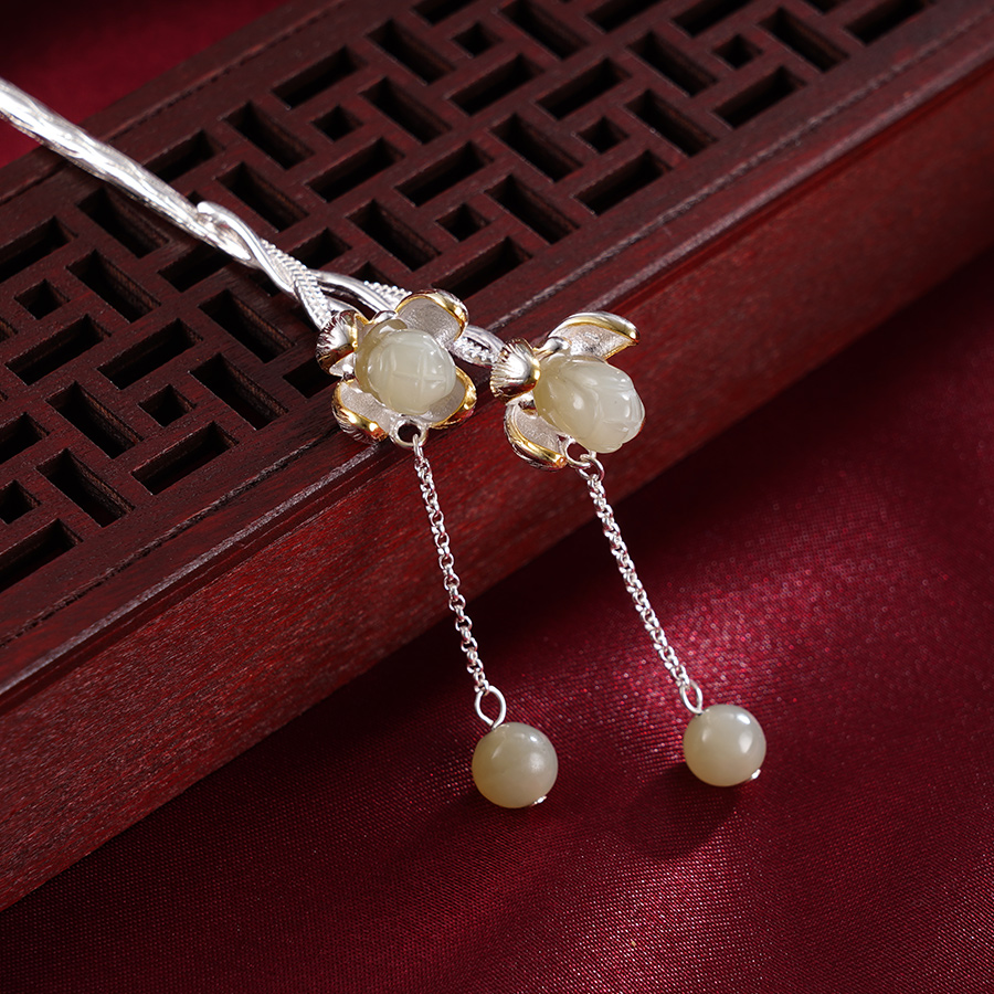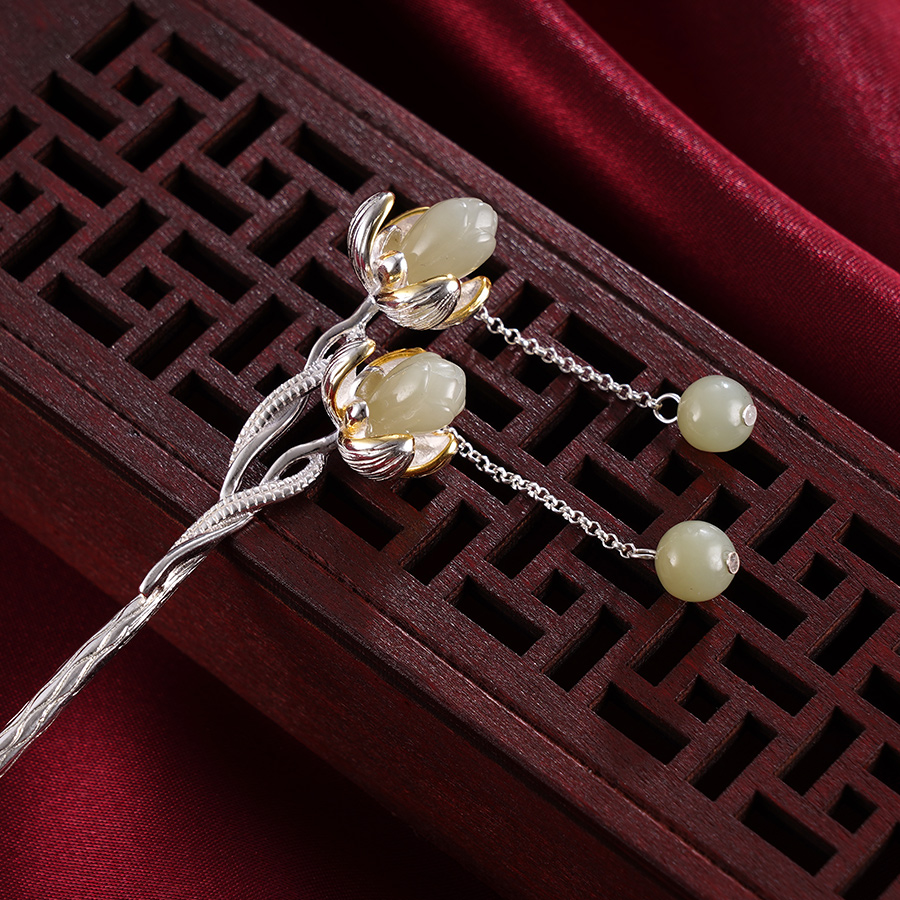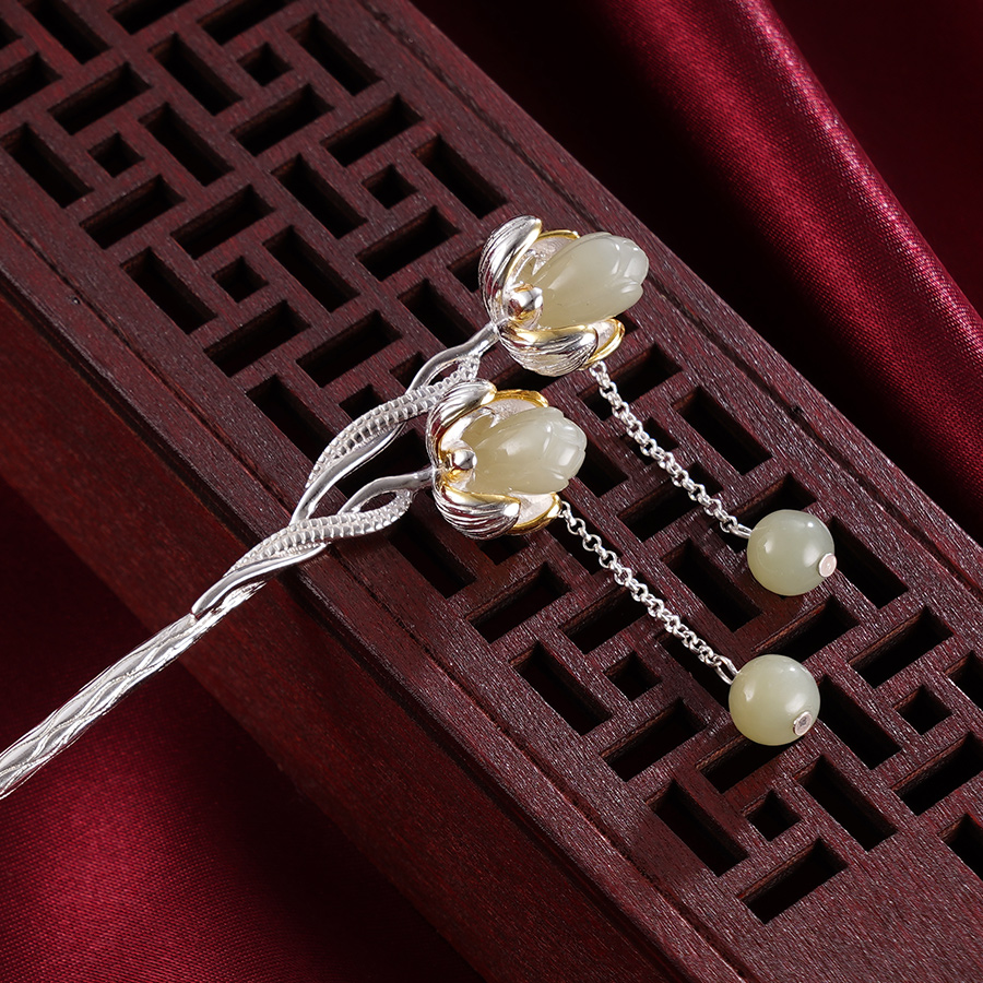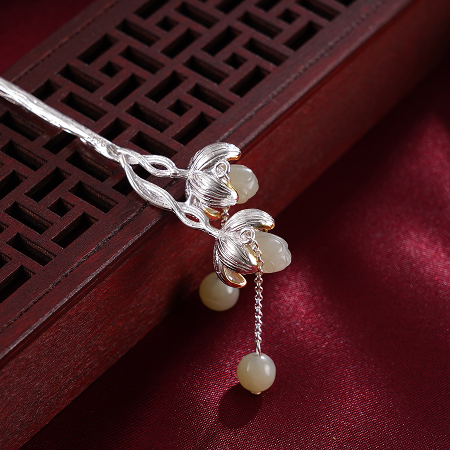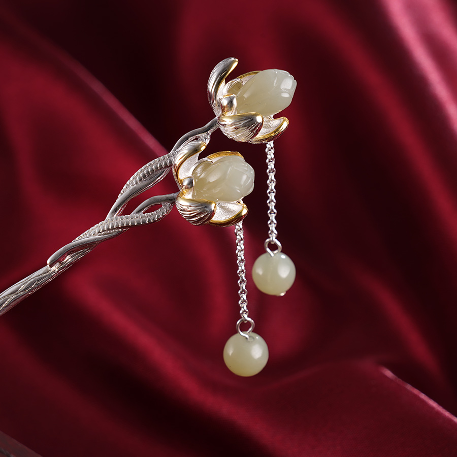 【寓意】:发簪以花朵为灵感设计,和田玉雕琢的花蕊与鎏金渲染的花瓣搭配,层次绽放,和谐美好,飘逸动人。