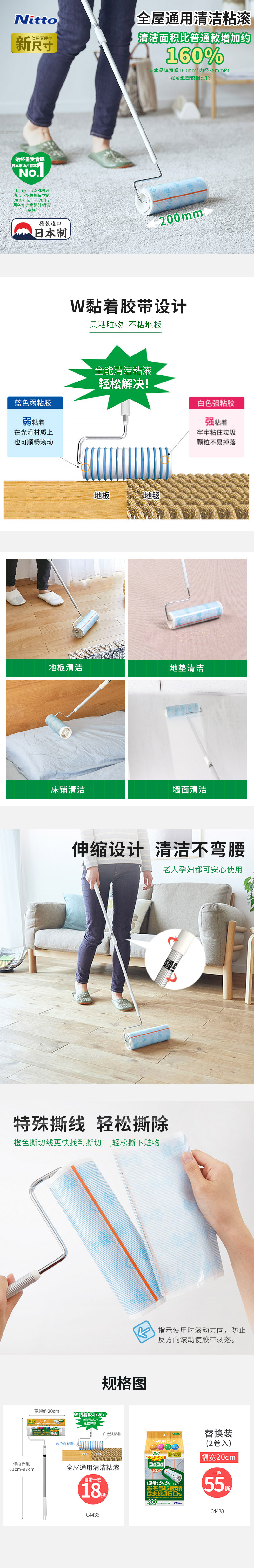 日本NITTO长柄可伸缩200mm宽幅多用途除尘滚筒粘毛器可撕式粘尘滚 WHJC