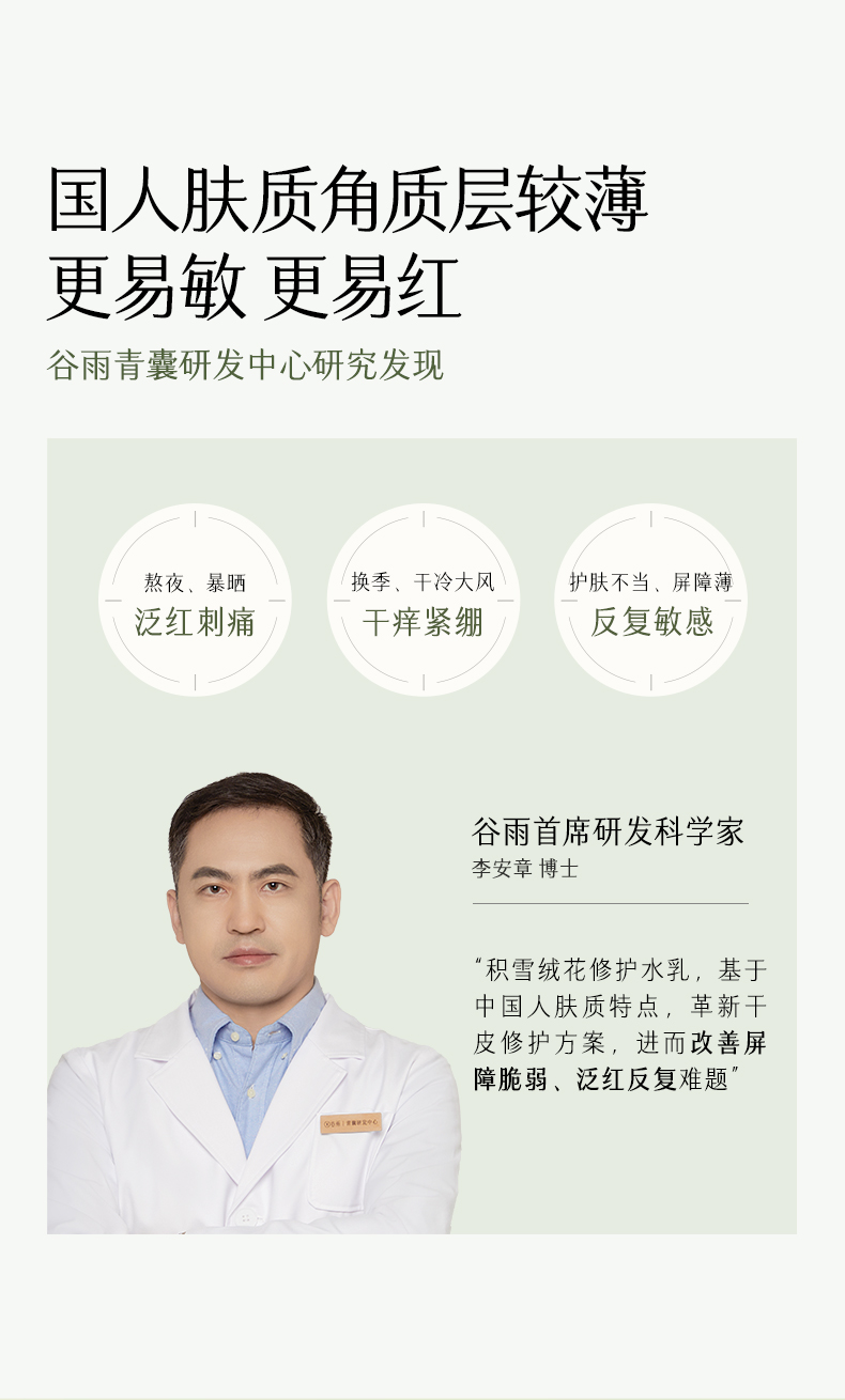 - 谷雨,更适合中国人肤质的植萃美白。专研中华珍稀美白植萃光甘草定,深入研究中国人肤质特点,打造中国女性独有的仙气白。