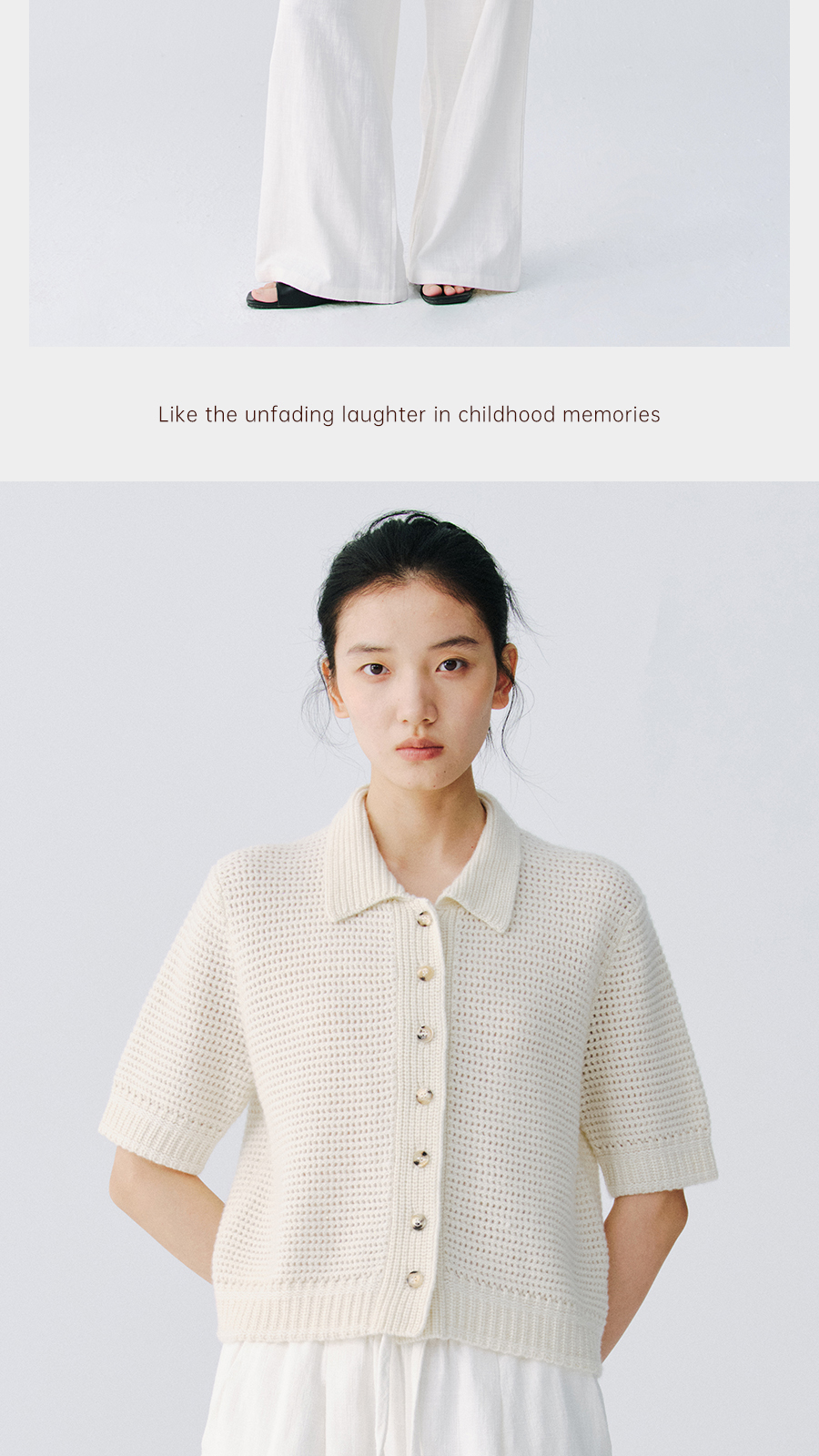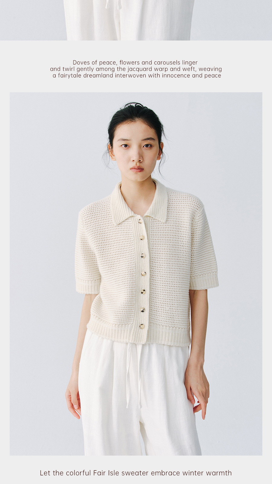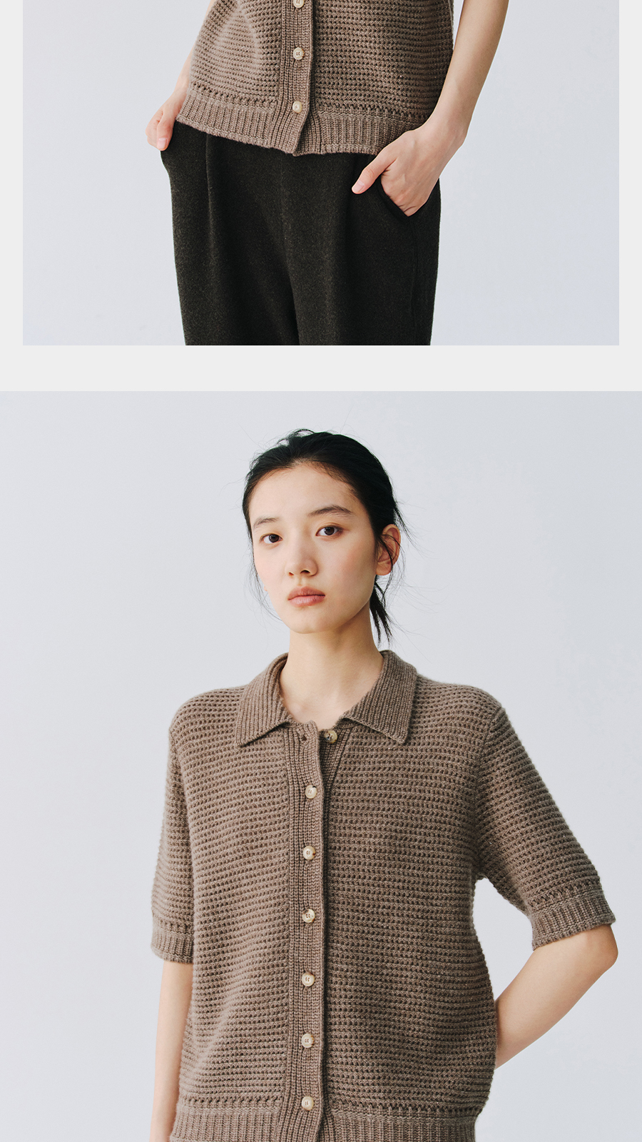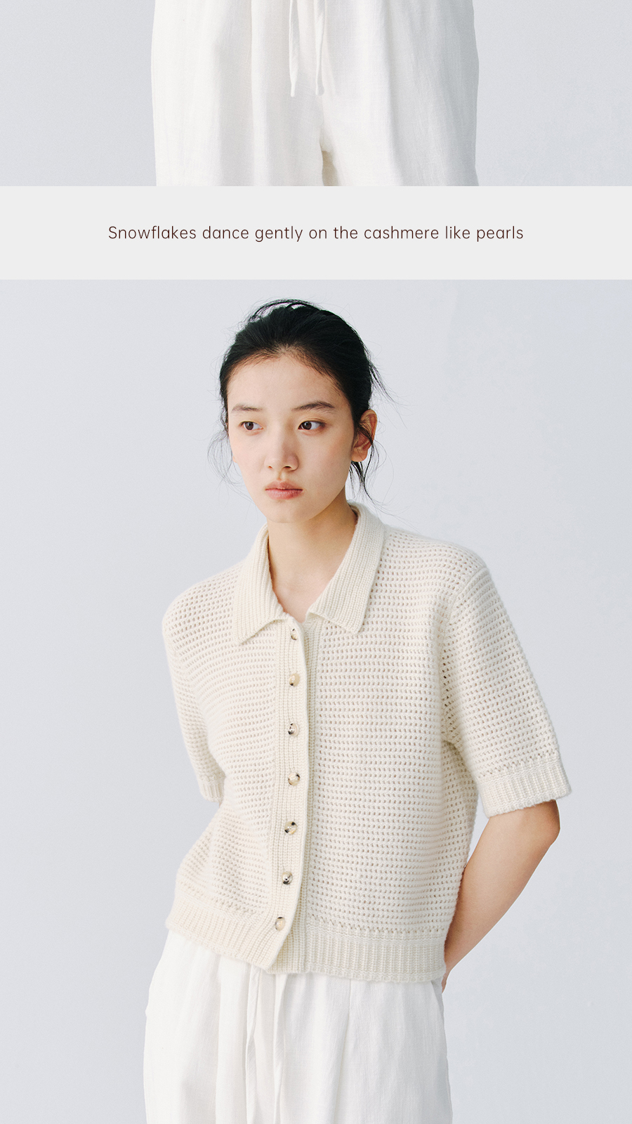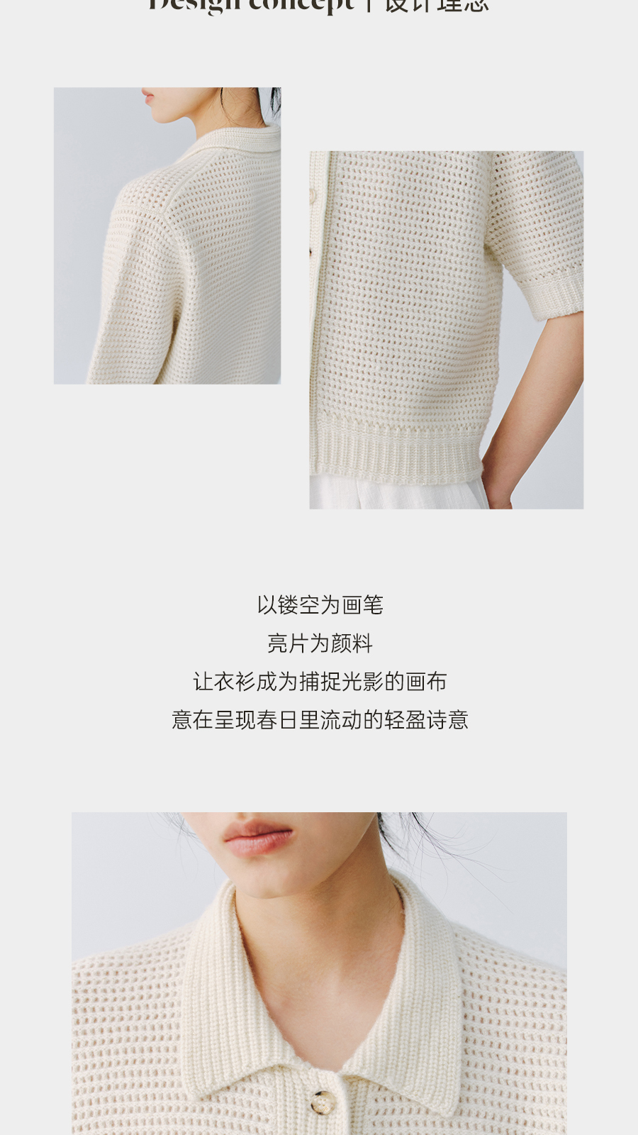 东黎 • 万物复苏 微光华夫格 山羊绒 女士春季翻领镂空珠片半袖开衫 6026