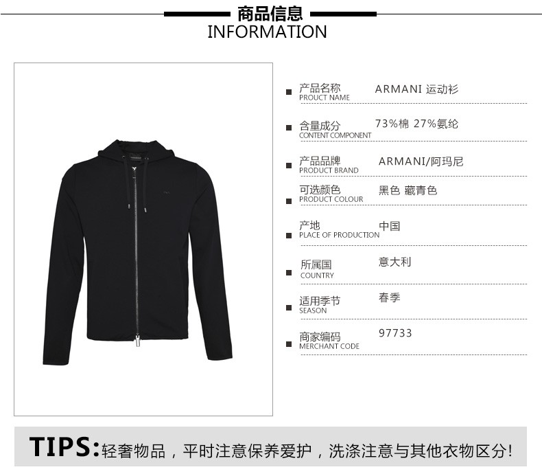 阿玛尼 EMPORIO ARMANI 男女通款 时尚百搭纯色休闲运动衫外套 97733