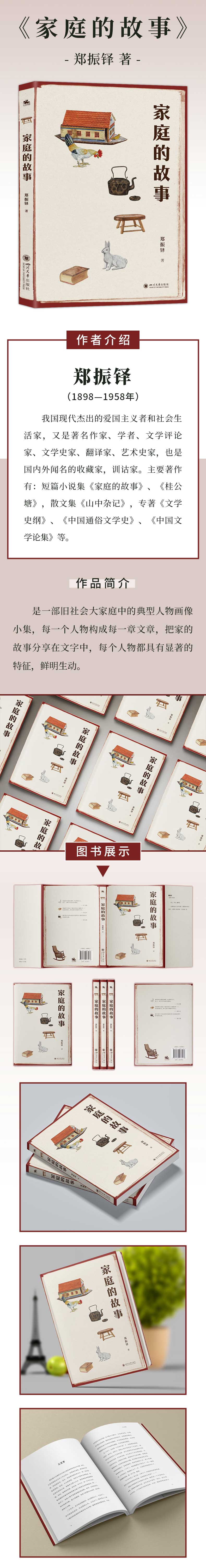 郑振铎反映现实的小说主要收在《家庭的故事》中,这些小说创作于不同时期,按内容也大致可分两类。一类是写于“五四”运动后,表现知识分子家庭生活的困惑与情趣的,另一类是郑振铎1927年被迫离开上海旅居巴黎时写的九个短篇,反映的是旧中国宗法封建性大家庭的生活及作者对这家庭奥秘的思考。