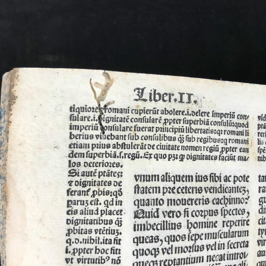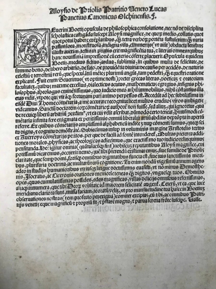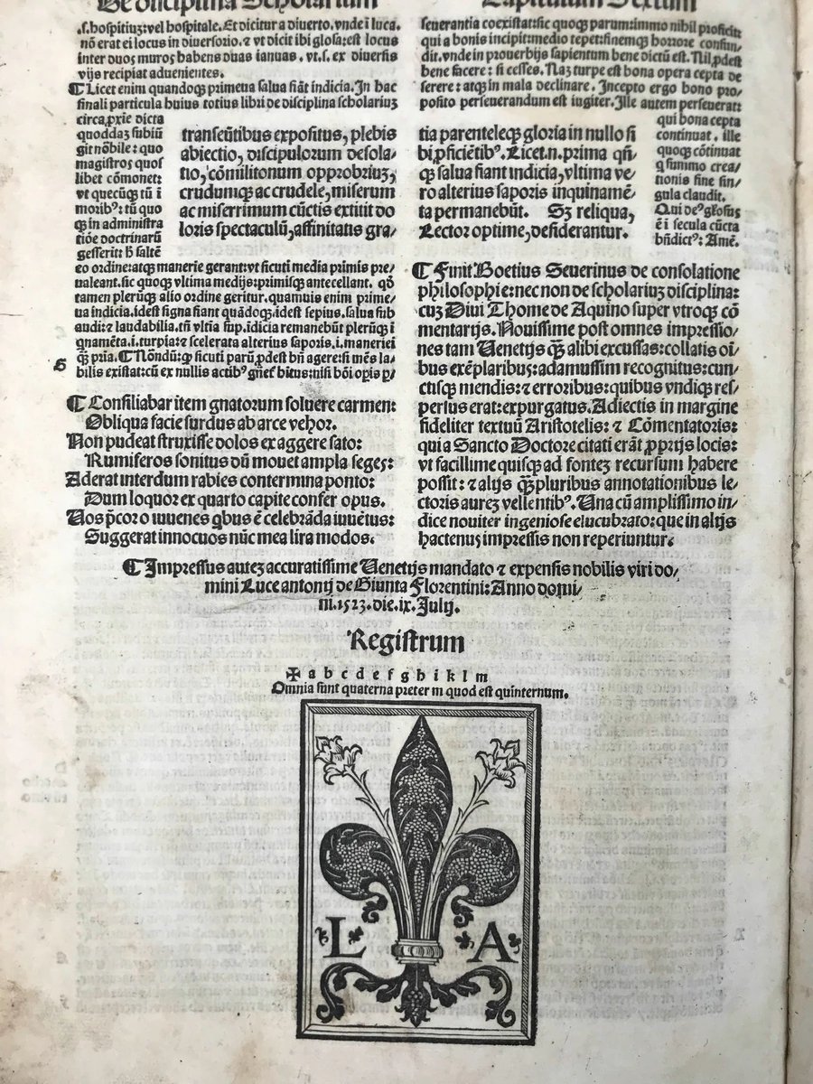是书为古罗马最重要的哲学波爱修斯的代表性作品《哲学的慰藉》,全书采用两栏印刷,由威尼斯著名的出版人Lucantonio Giunti出版,在卷尾有一枚非常漂亮的出版商标识。这个版本还收录了波爱修斯论述disciplina scholastica的内容,文本的修订和批评部分来自16世纪古典学家、修辞家Lucas Panaetius,根据当时的手稿进行了严格的核对,消除了之前的许多错误,尤其是波爱修斯关于亚里士多德的相关内容部分。此外该版本还增加了索引部分,是波爱修斯作品自出版以来最全面的一个版本。