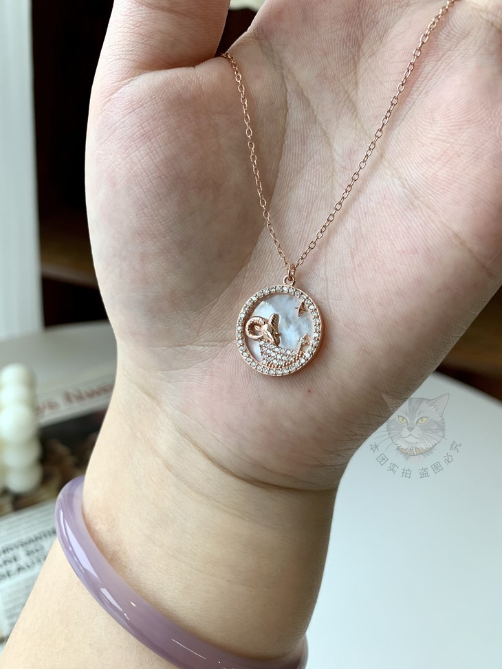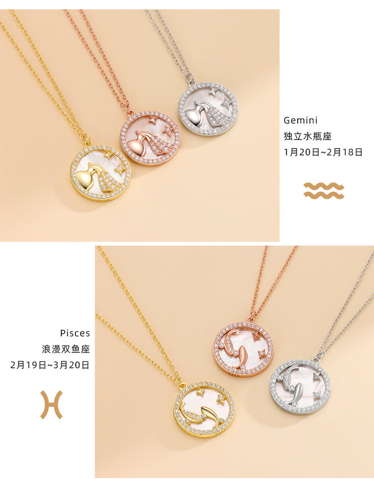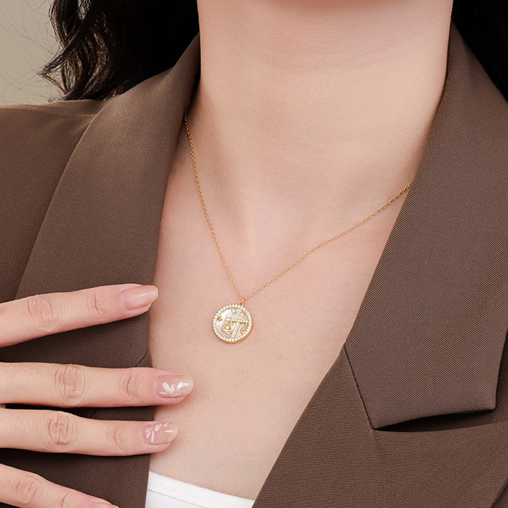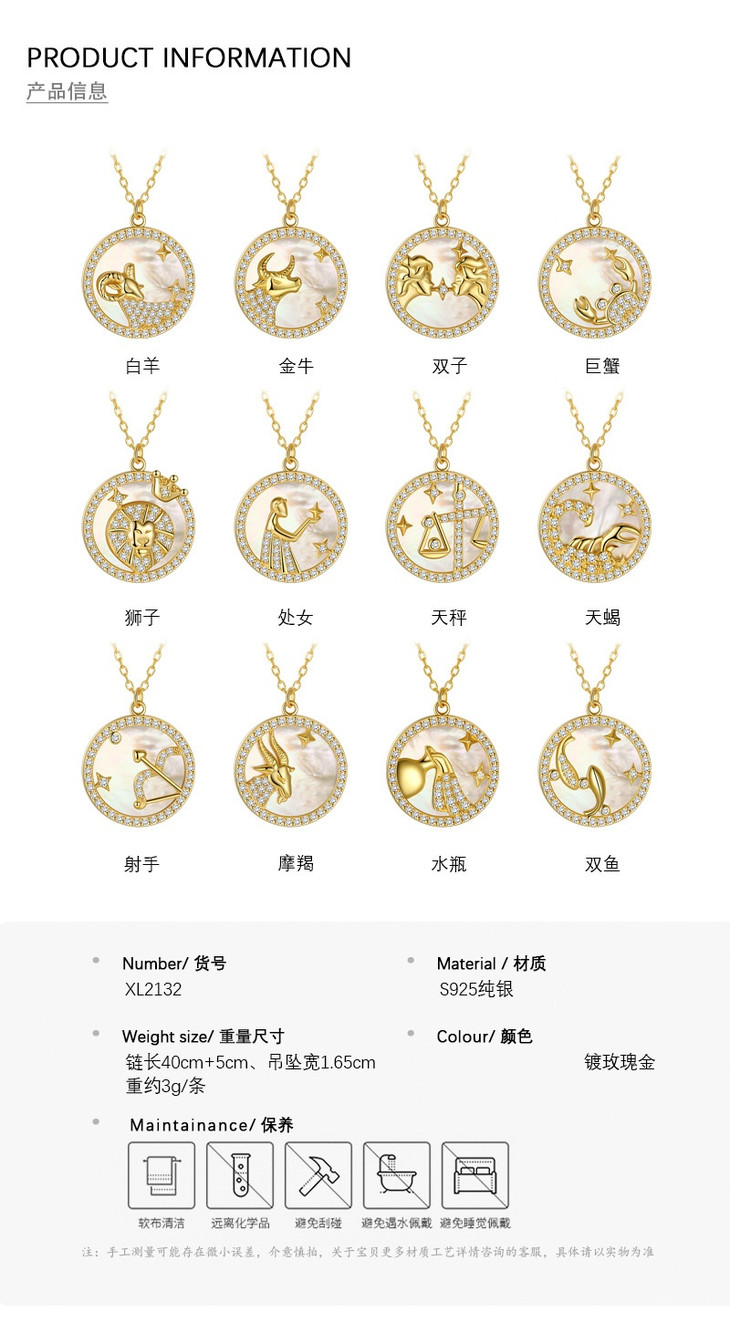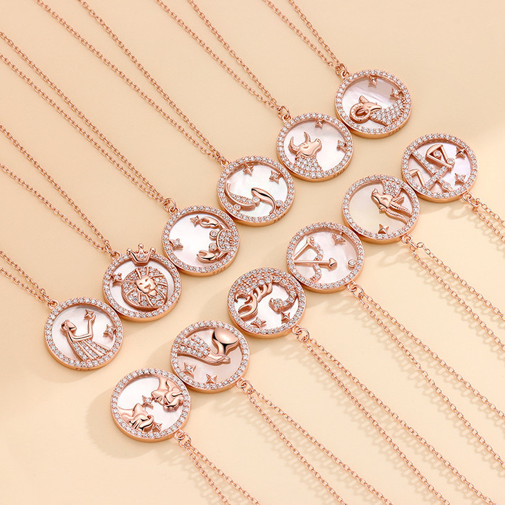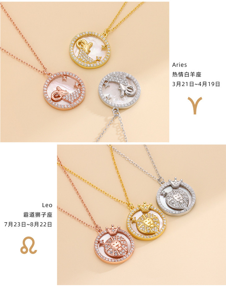 MONZECI KOIMS 轻奢系列 【第二款】十二星座白贝母项链 玫瑰金编织圆盘,贝母 + 锆石把星座符号镶成艺术品 正反两面都可带,一条项链带出两种感觉 日常搭 T 恤、小裙子都超绝,自带氛围感 戴上直接拿捏专属幸运✨