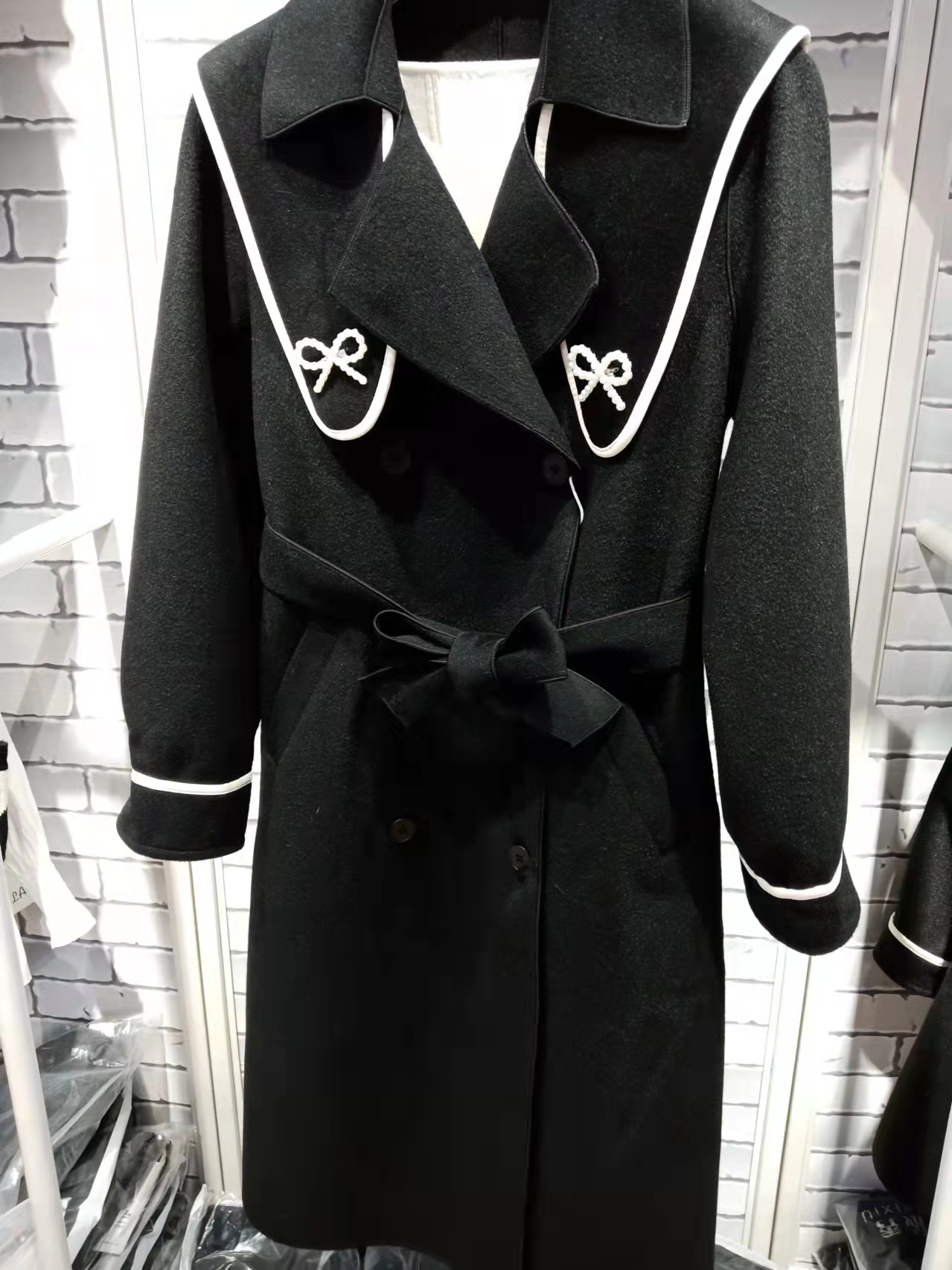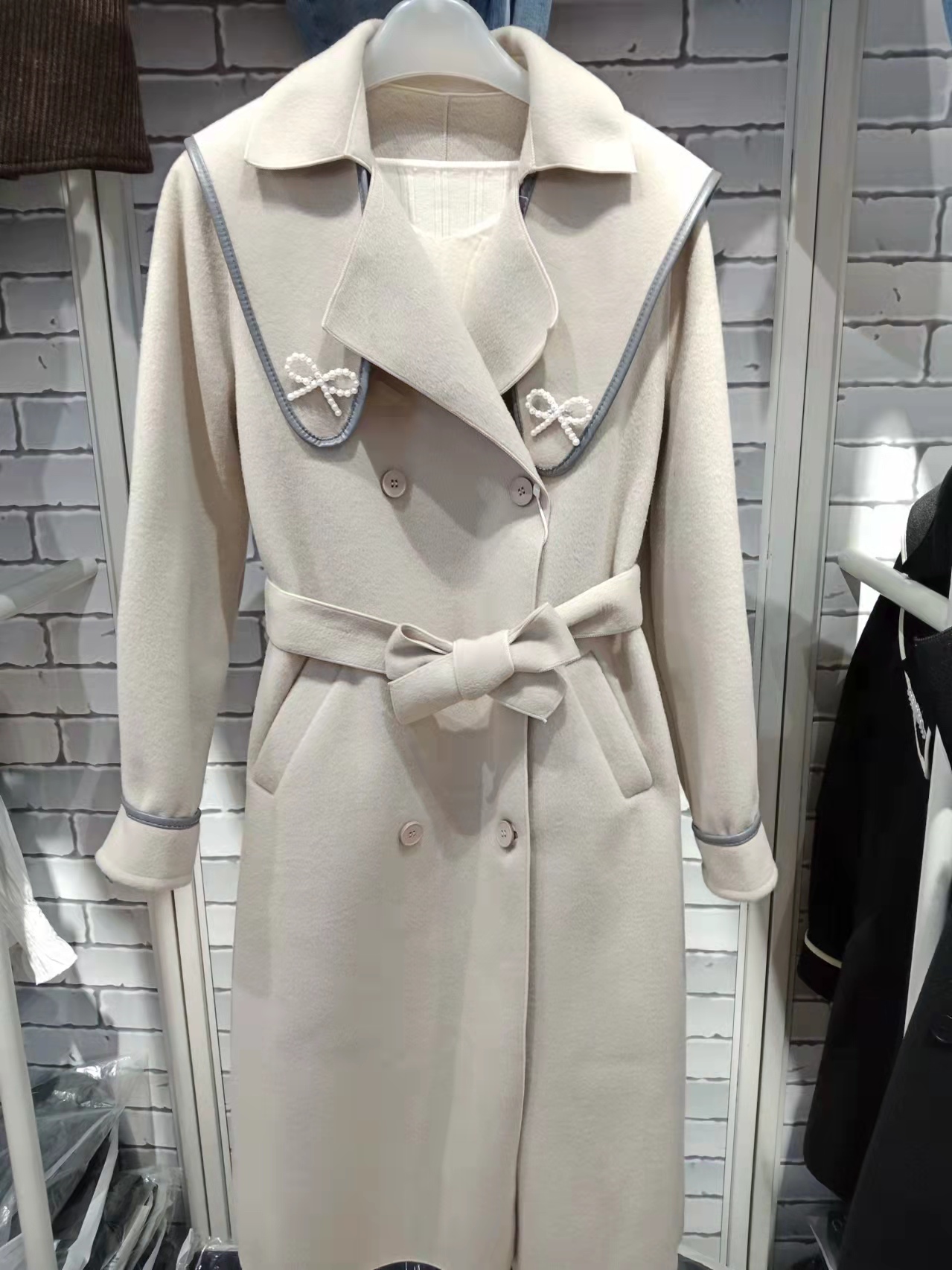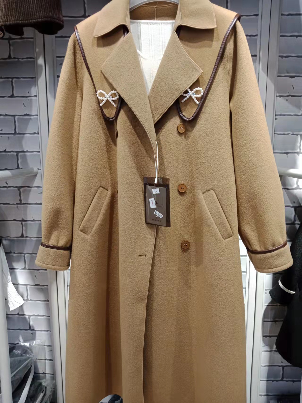 特点:长款双面羊绒,舒适保暖,初春季节的首选,肩膀装饰可以拆卸,一款两穿,时尚靓丽