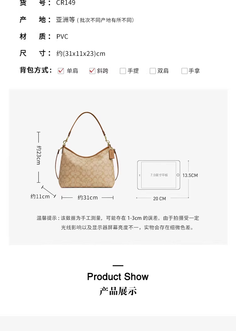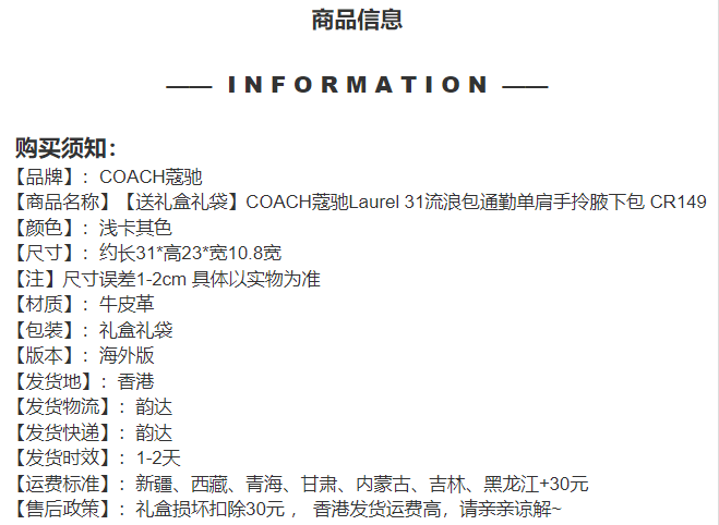 【品牌授权】【礼盒礼袋】COACH蔻驰Laurel 31流浪包奥莱通勤单肩手拎腋下包 CR149(约长31cm宽11cm高23cm)