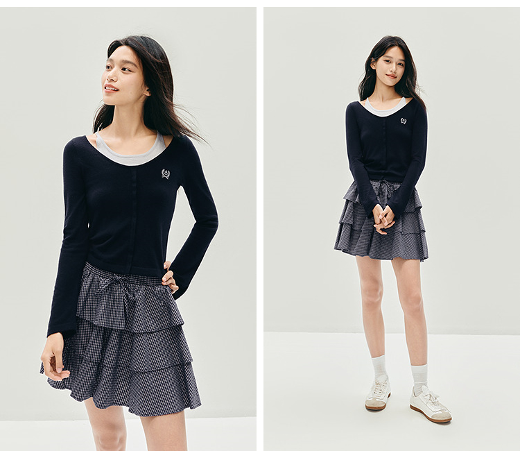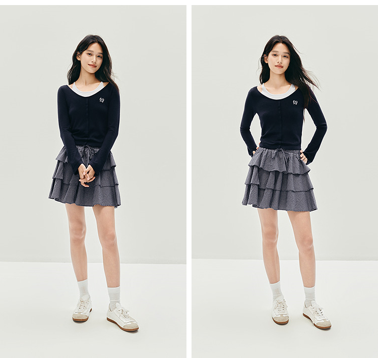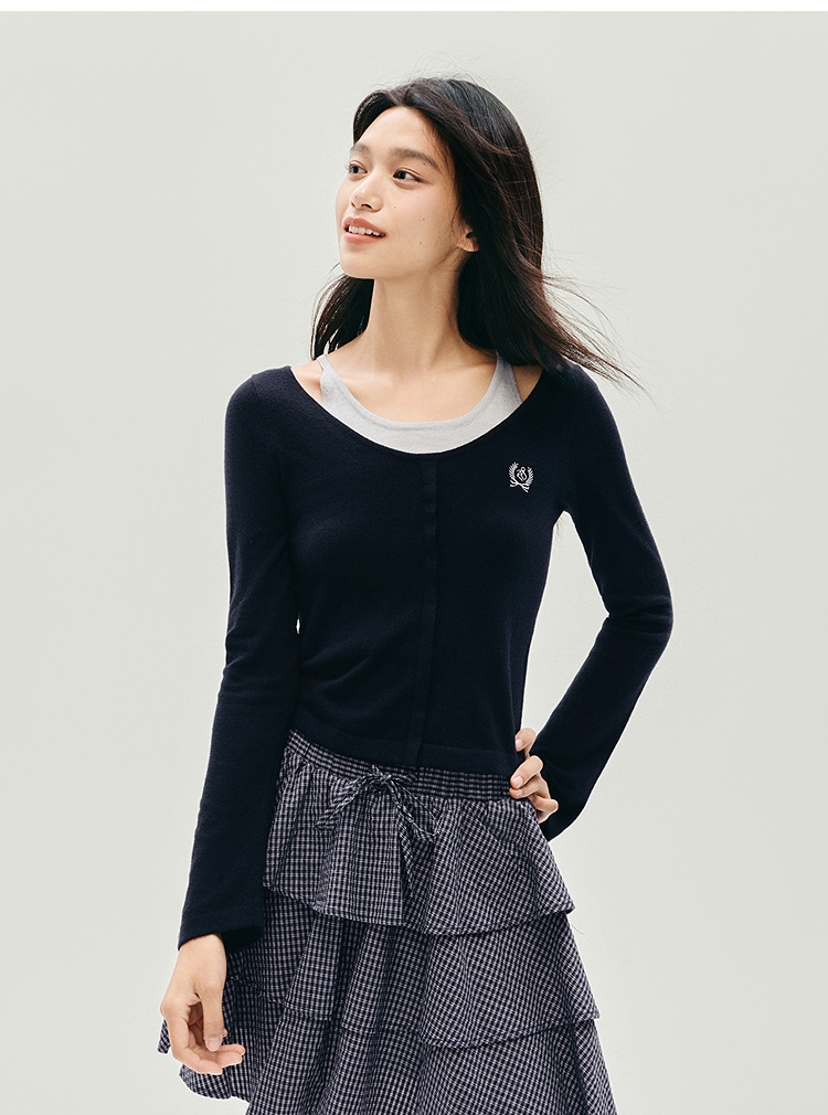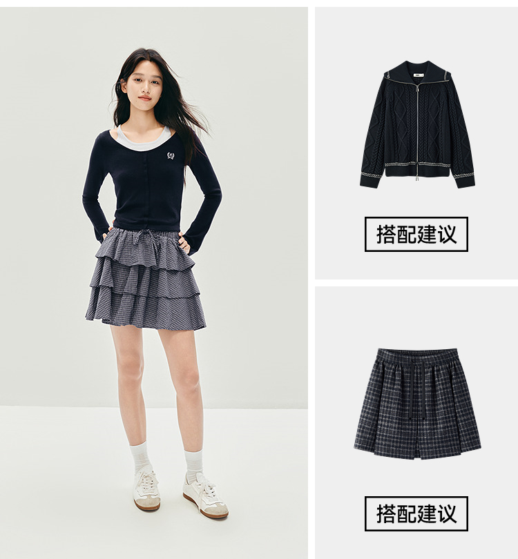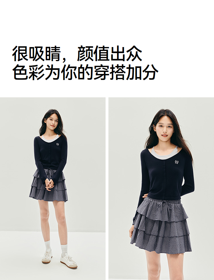 森马针织衫女冬短款假两件撞色刺绣修身2025新款小性感小心机上衣