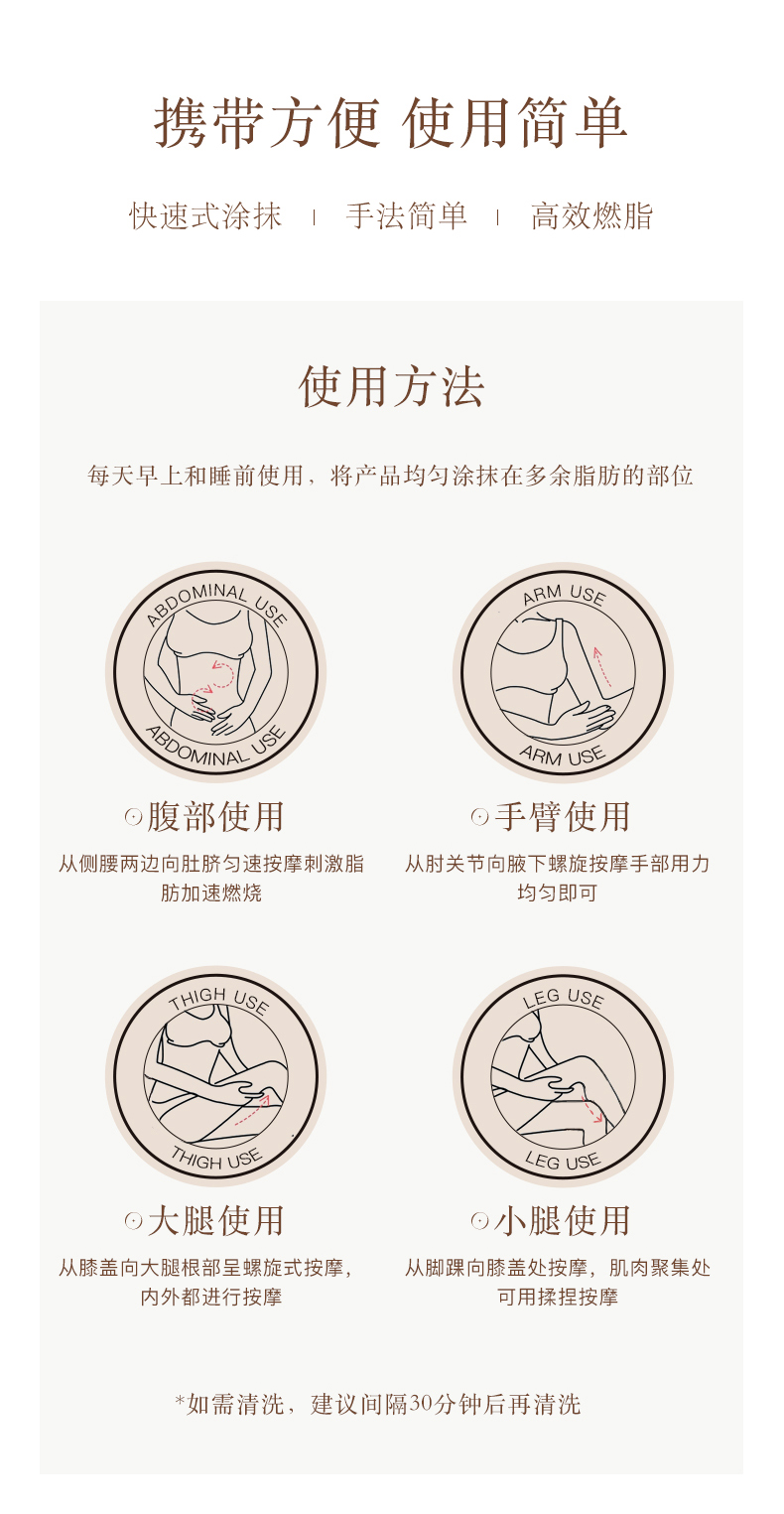 【主要成分】葡萄柚精油、杜松子精油、生姜油、魔鬼椒、瓜拉纳提取物、乙酰基六肽-8、脂肪酶