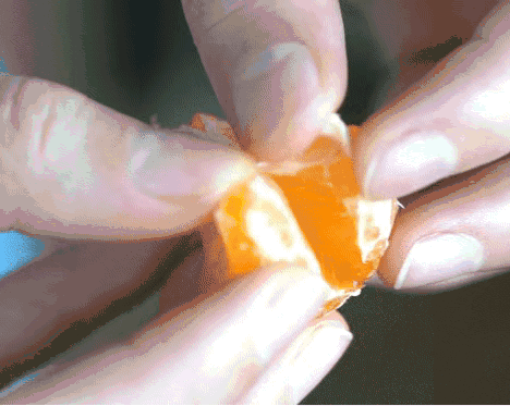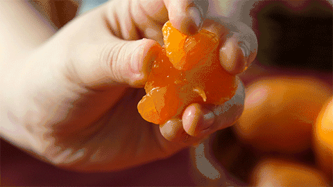 它橘瓣儿间的隔膜薄如蝉翼,饱满的果粒们在瓣膜下若隐若现,剥的时候一不小心刮破了膜,汁水就biubiubiu迸射出来。小心翼翼撕开瓣膜,薄得透光~