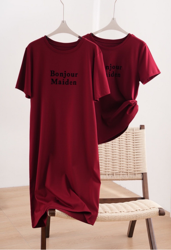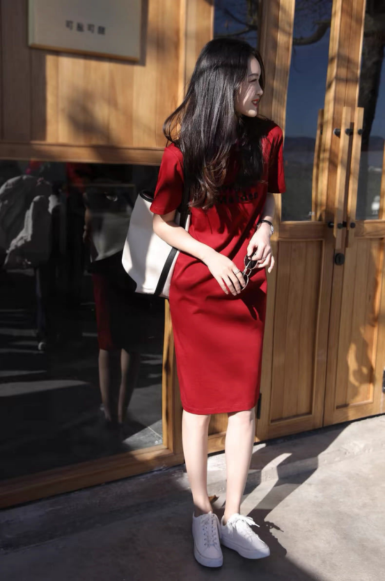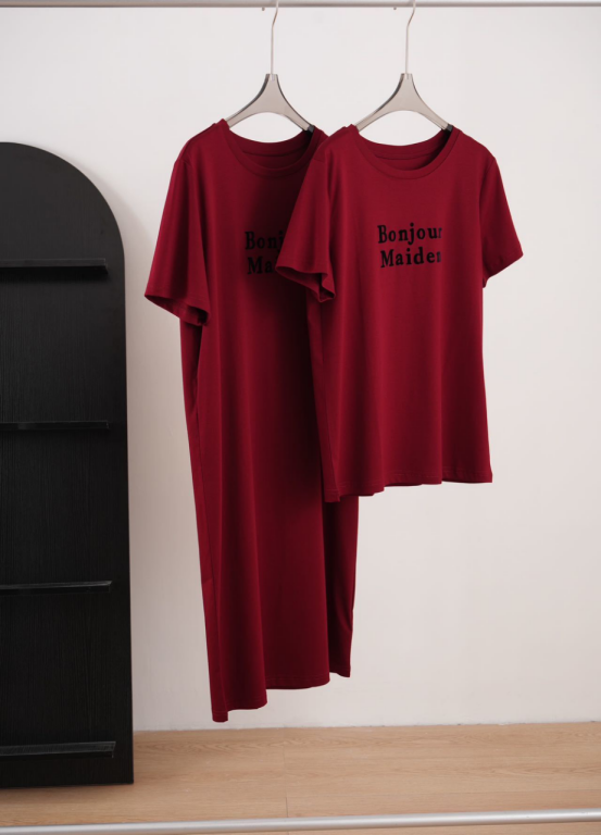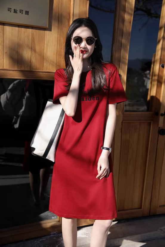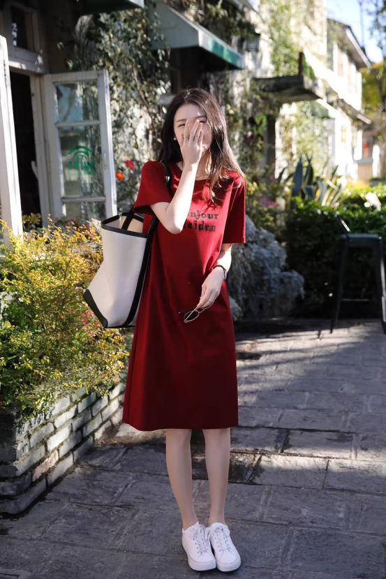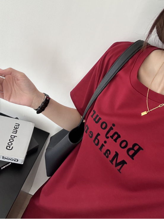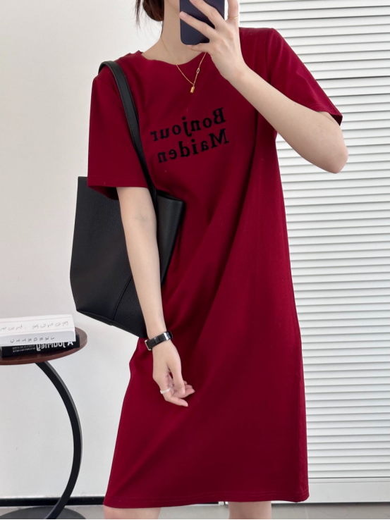✨ 连衣裙 也是波尔多红撞黑色字母,简单的高级感! 如果懒人穿搭有公式。t裙一定是最优解! 轻松又简单,是早八人快速出门的最佳选择~ 微宽松版型,看似直上直下,其实做了微微的收腰效果 以此达到遮肉藏拙,又不失利落的显瘦感 圆领领型基础百搭,领口双走线➕后包边巩固! 随意穿脱也不易变形~耐穿又耐看!