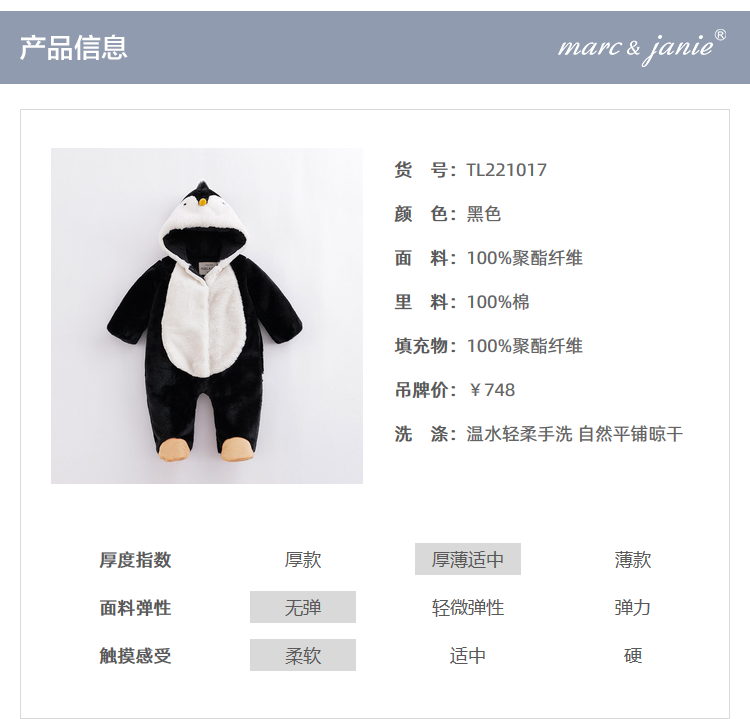 马克珍妮秋装新款 女宝宝小企鹅仿兔毛连体衣221017