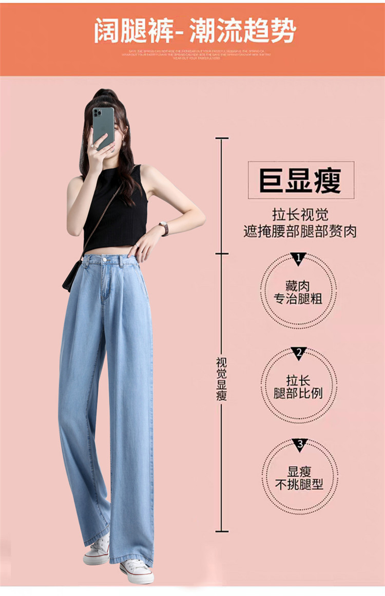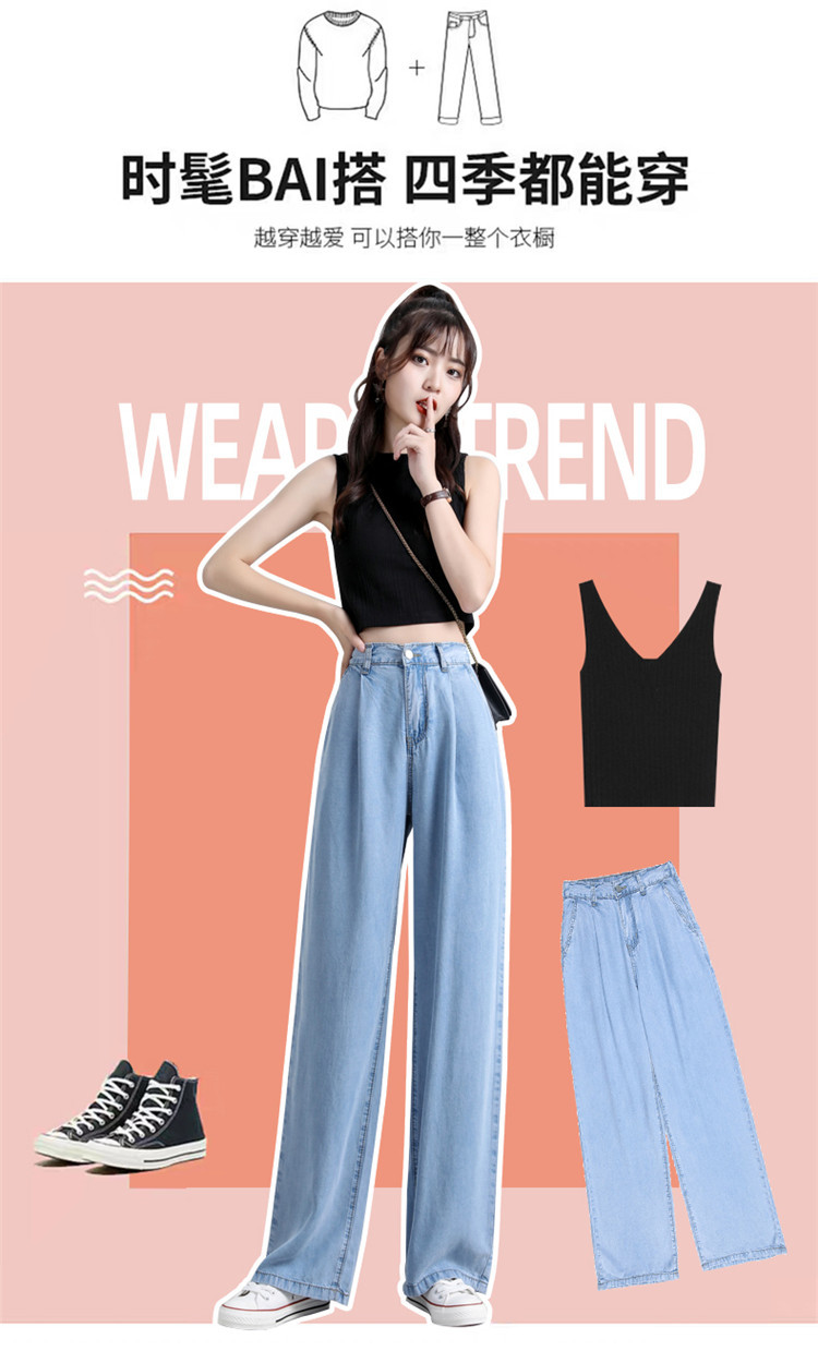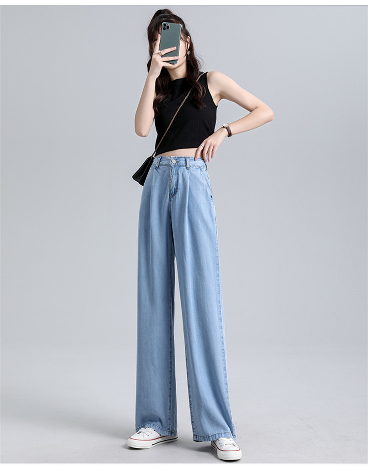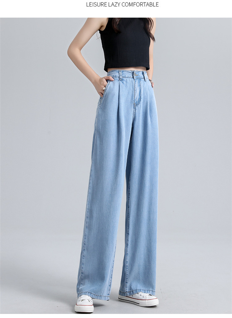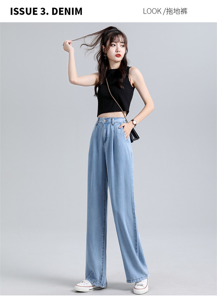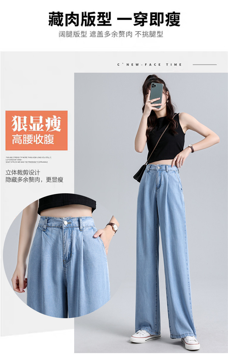 女装浅蓝色牛仔裤女 高腰显瘦阔腿垂感拖地裤子薄款
