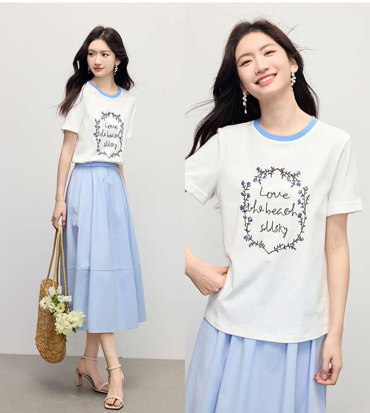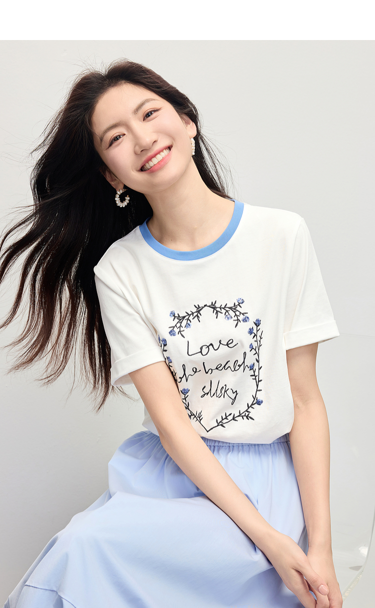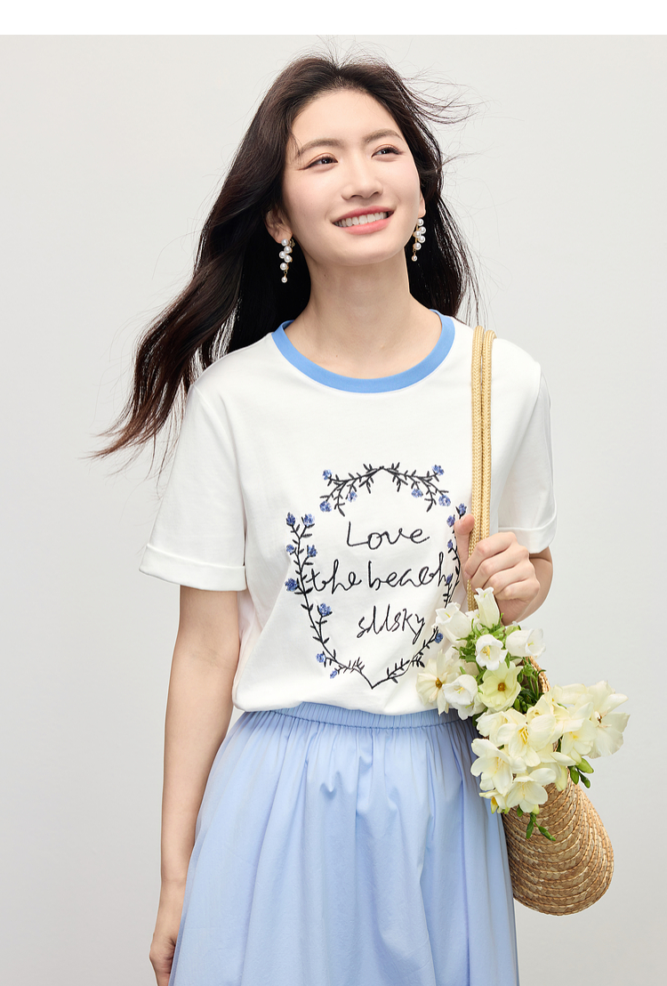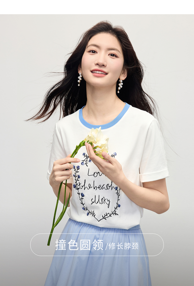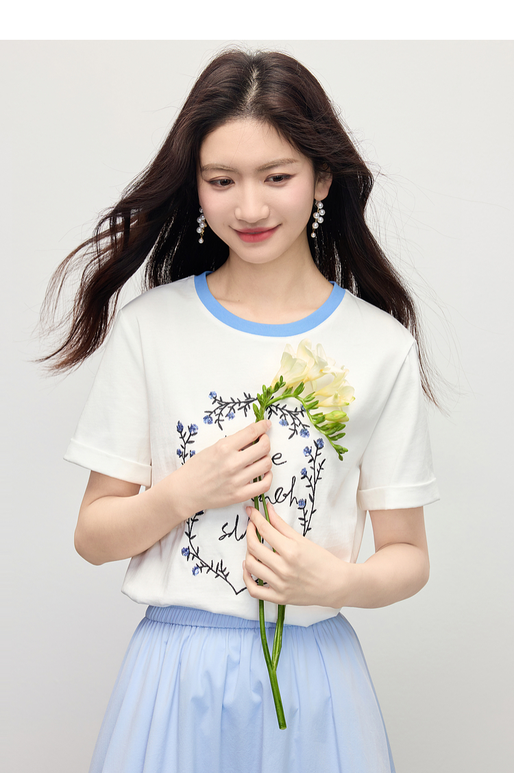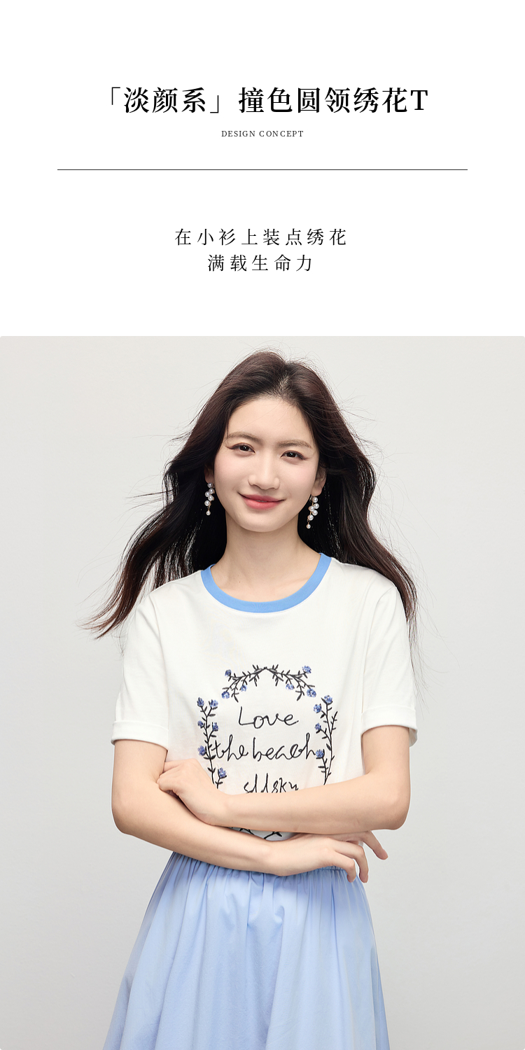 【专属特价】熙世界花卉刺绣正肩T恤女短袖2025夏日新款撞色圆领chic别致上衣