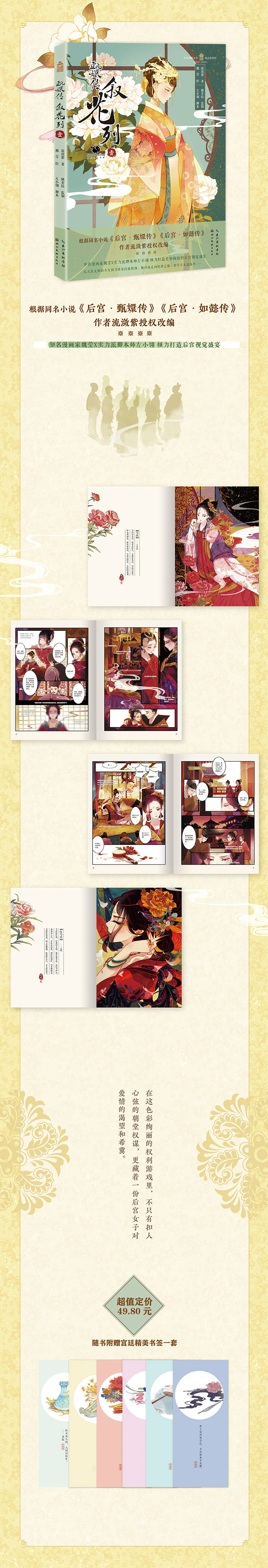 《甄嬛传 叙花列(1)》是根据流潋紫同名小说、电视剧《后宫·甄嬛传》改编而成的中国风绘本,是《甄嬛传·叙花列》绘本系列的第一册,该系列作品在2013年获得第九届中国国际动漫节“金猴奖”。这部作品在原著的基础上,用漫画的形式对华妃、甄嬛、眉庄、端妃、敬妃、等人物作了细节的刻画,成功描绘了这些天真少女如何走向权利尽头的过程,这是一场视觉与故事的双重盛宴。此外,作品还包含有作者与创作团队的访谈,绘者的独门绘画教程等内容。