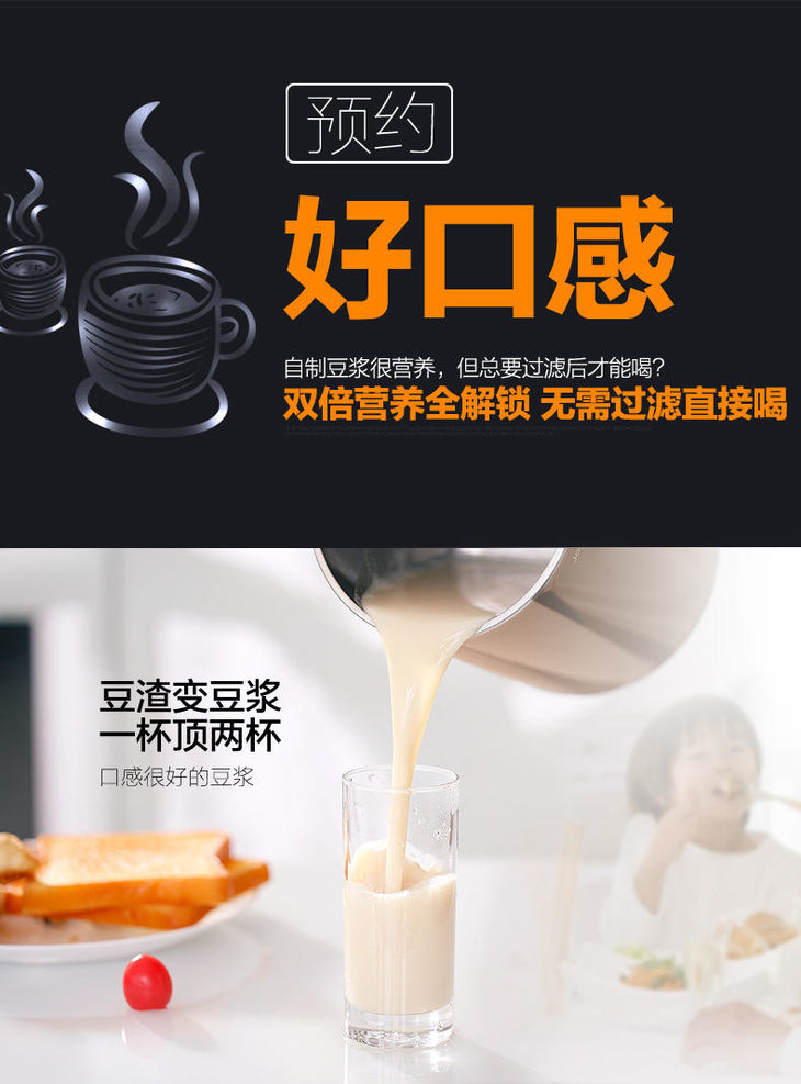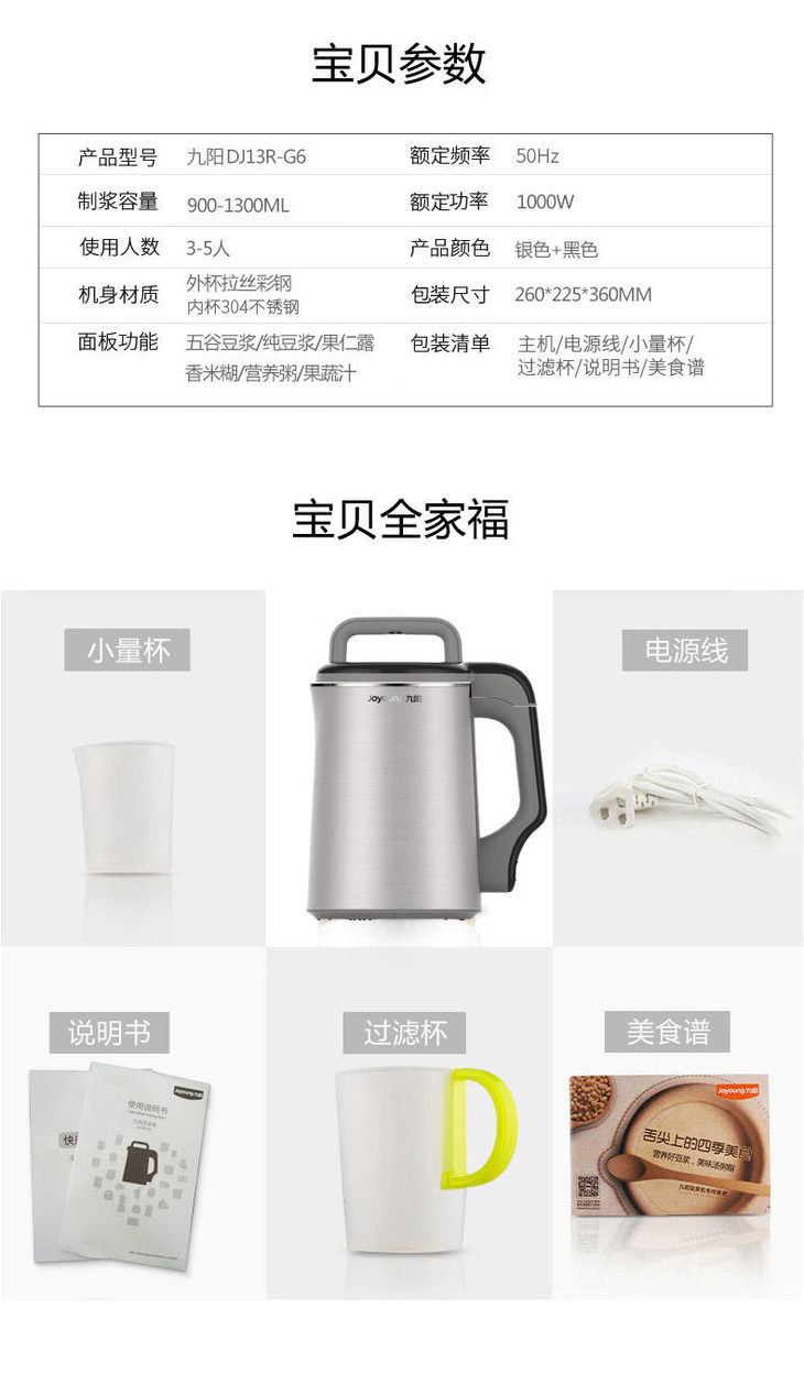 南5 九阳(Joyoung)豆浆机DJ13R-G6 破壁免滤 加热双预约全自动 多功能 家用豆浆机 1.3L容量