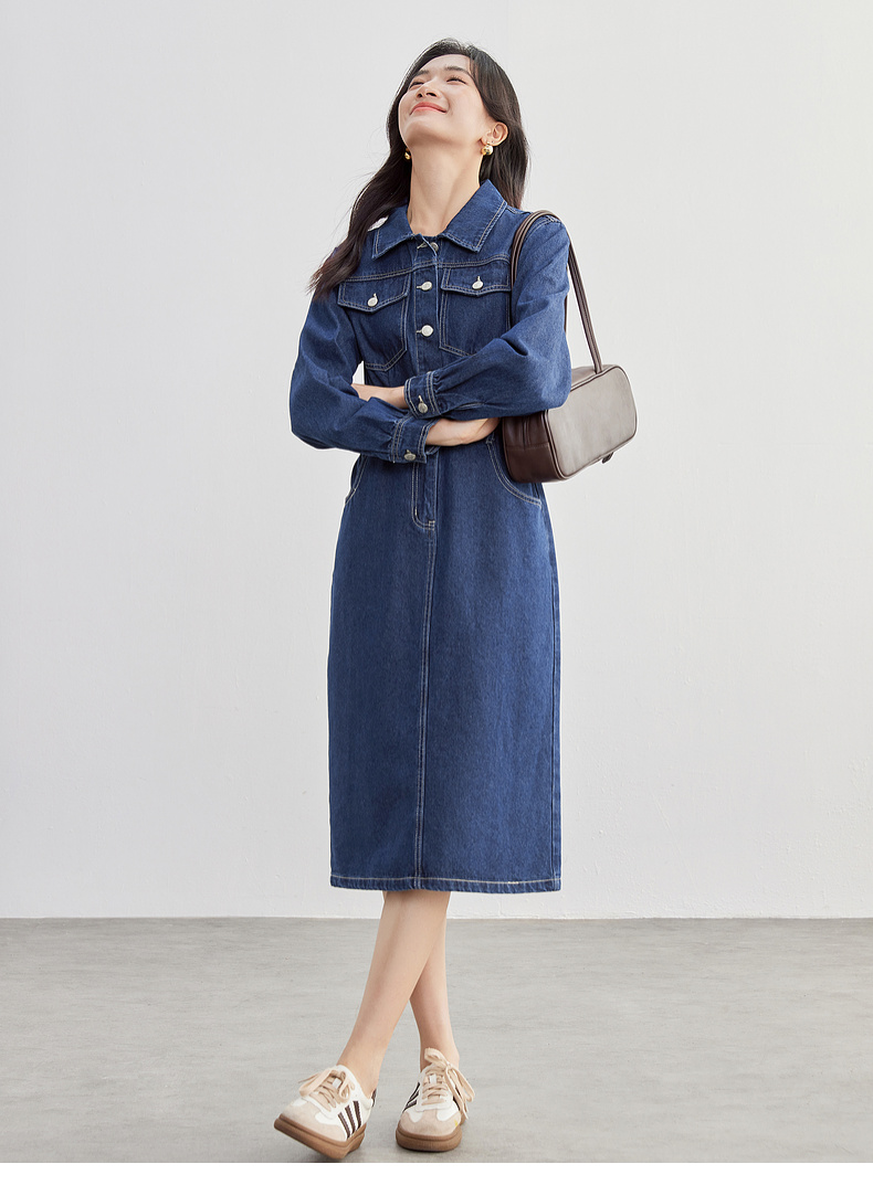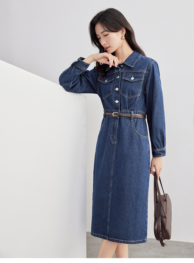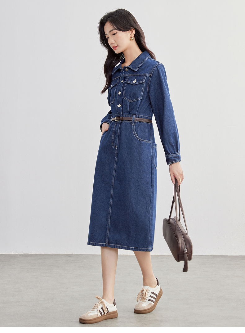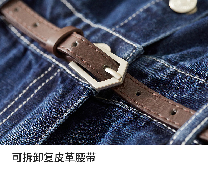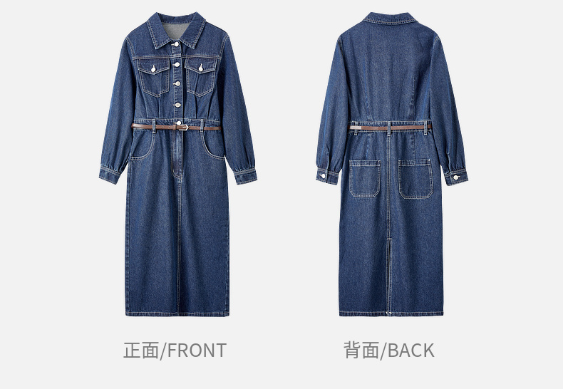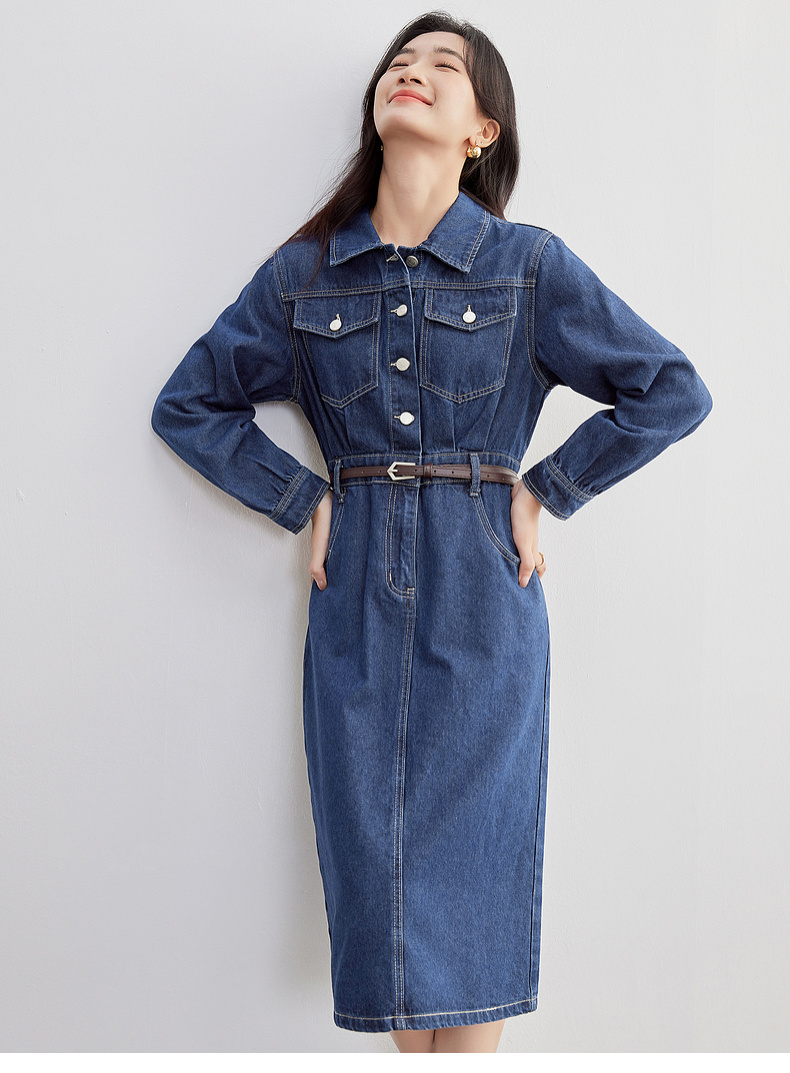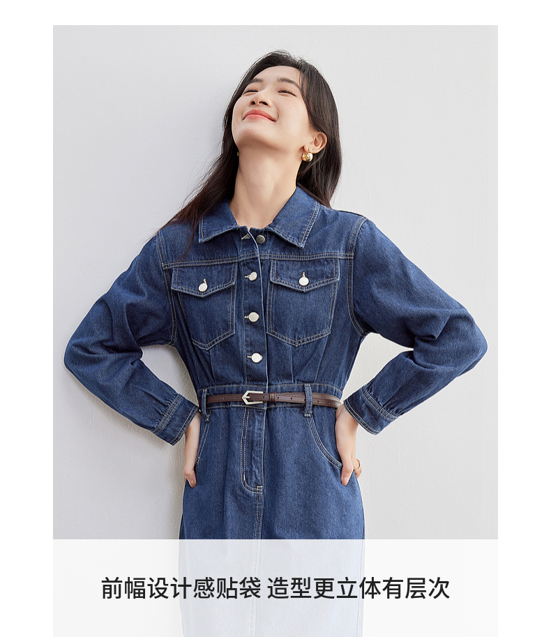 【内购】【 腰带设计牛仔裙 】水洗牛仔棉衬衣翻领设计牛仔连衣裙赠送腰带-W51L80094X