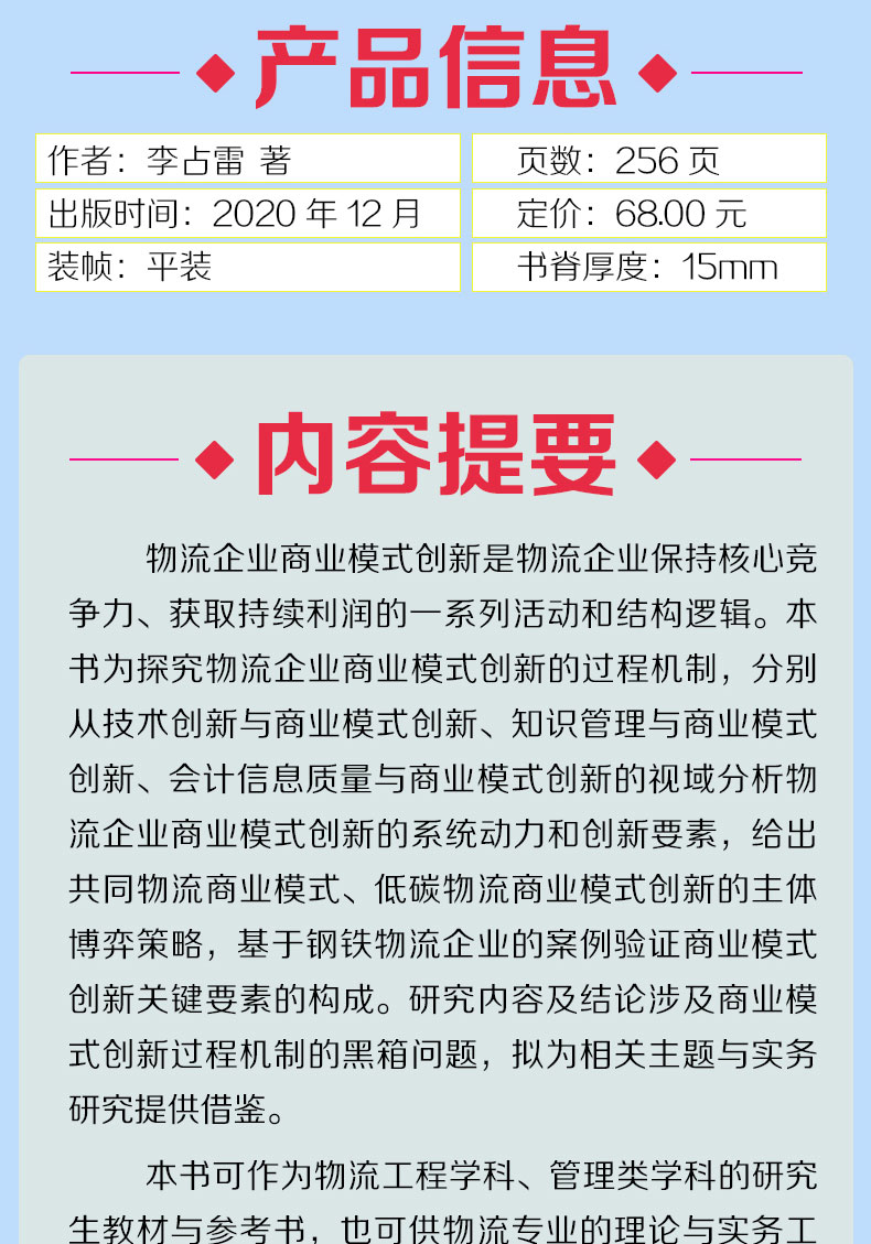 物流企业商业模式创新 李占雷 高等院校物流工程学科 管理类学科研究生教材 物流管理书籍 物理专业教材 物流企业商业模式创新设计