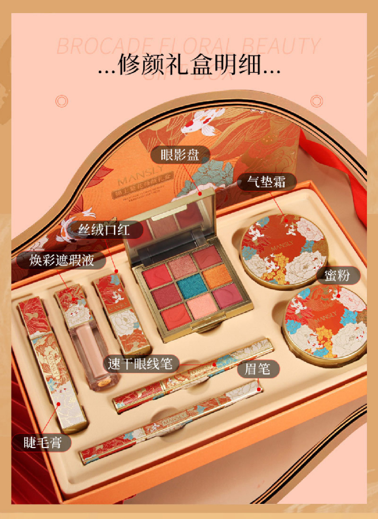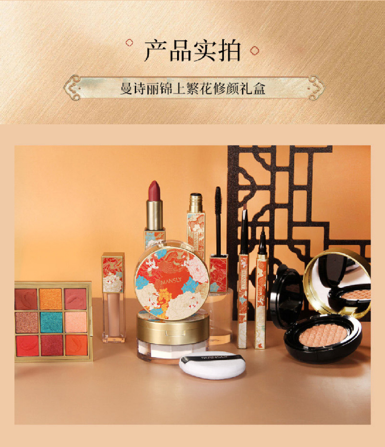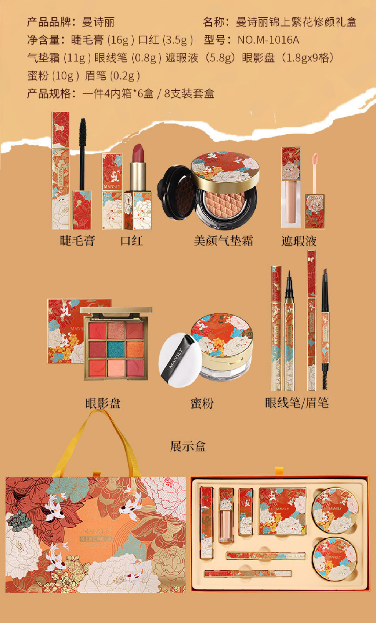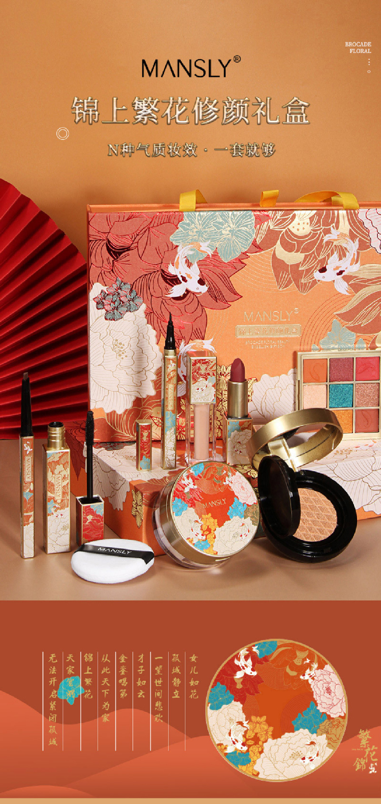 【好礼】曼诗丽锦上繁花修颜礼盒 中国风彩妆8件套口红眼影盘眉笔粉扑