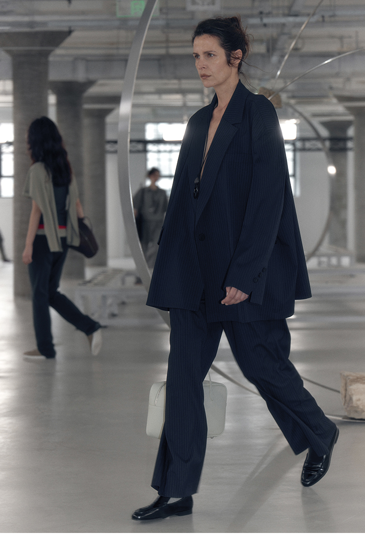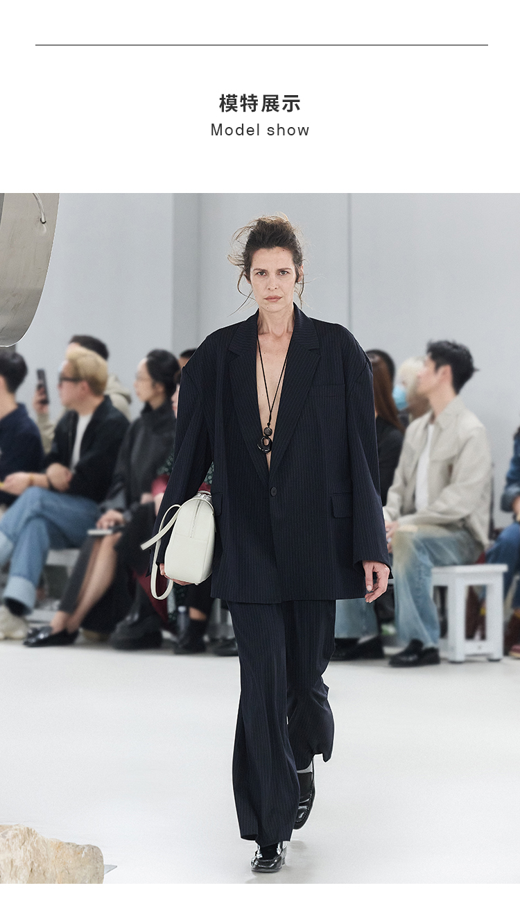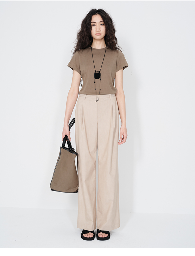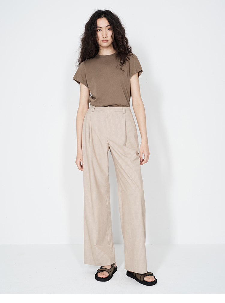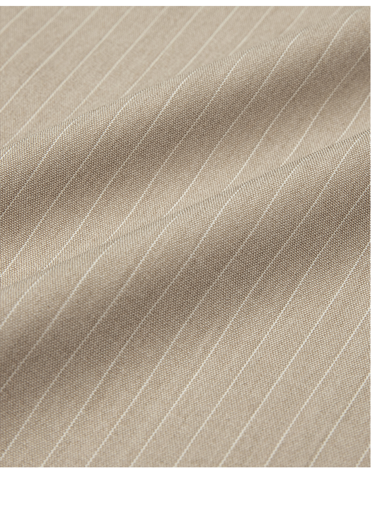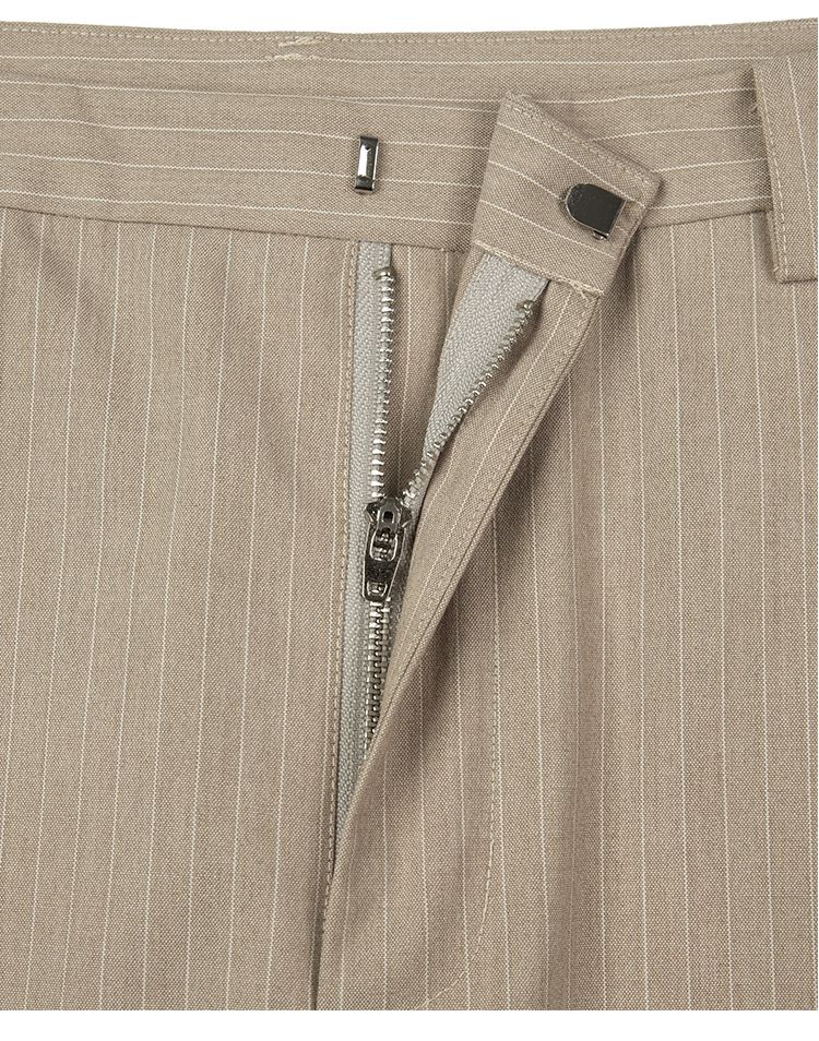 HIDEMI 【董生活同款】极简细条纹压褶设计感宽松阔腿中低腰西裤长裤 藏蓝色/燕麦色