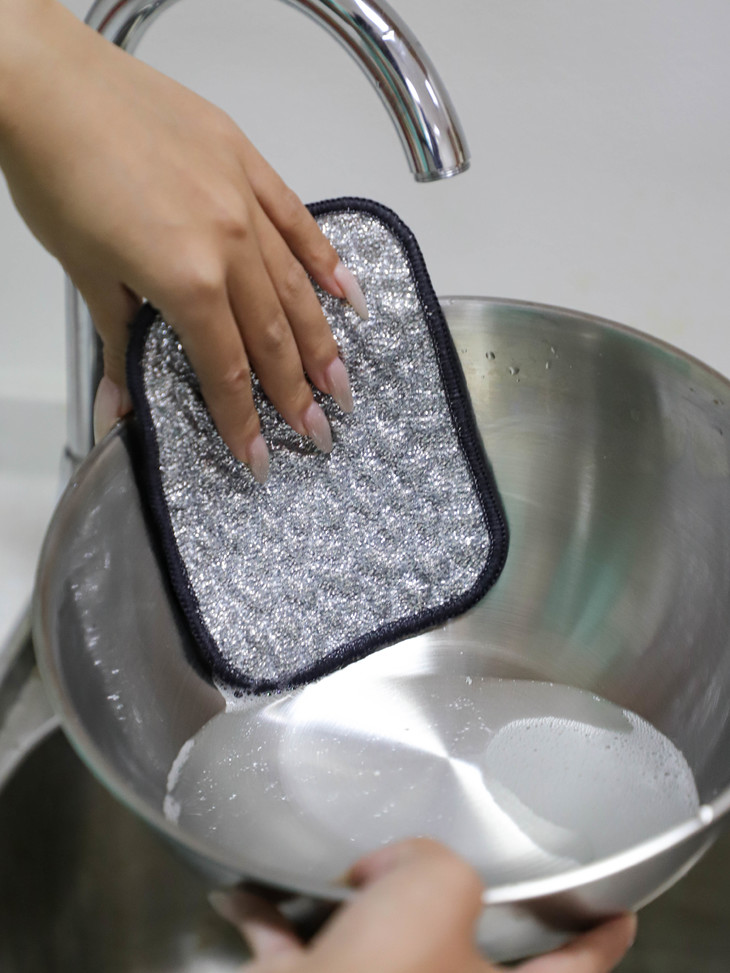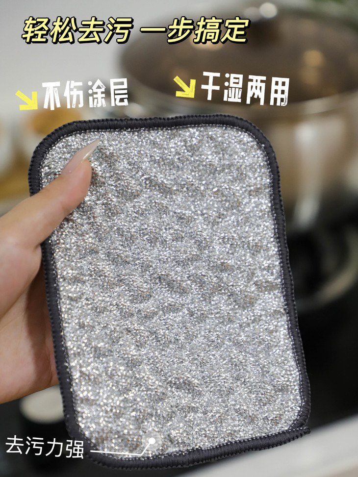 🔺采用双面设计 一面是坚韧银丝层 针对锅底焦糊、灶台陈年油垢 摩擦细腻不伤锅 轻轻刷洗即可瓦解顽固污渍,铁锅、都能用