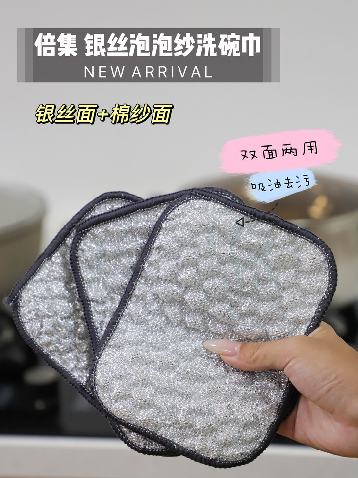 洗碗新革命❗️ 银丝洗碗巾,告别钢丝球烦恼 家人们,还在为钢丝球洗碗易刮花厨具、碎屑残留而苦恼吗❓ 快来试试这款银丝洗碗布 试试这套「银丝面刷+洗碗布」组合👍
