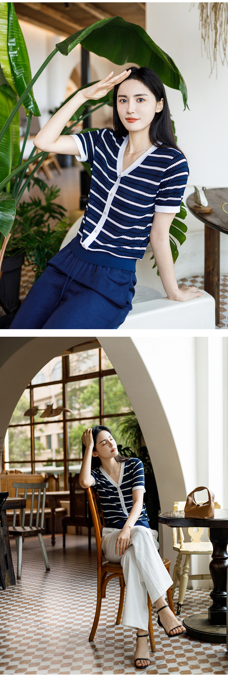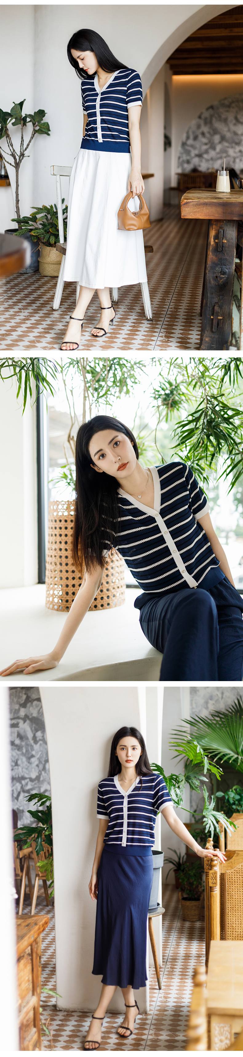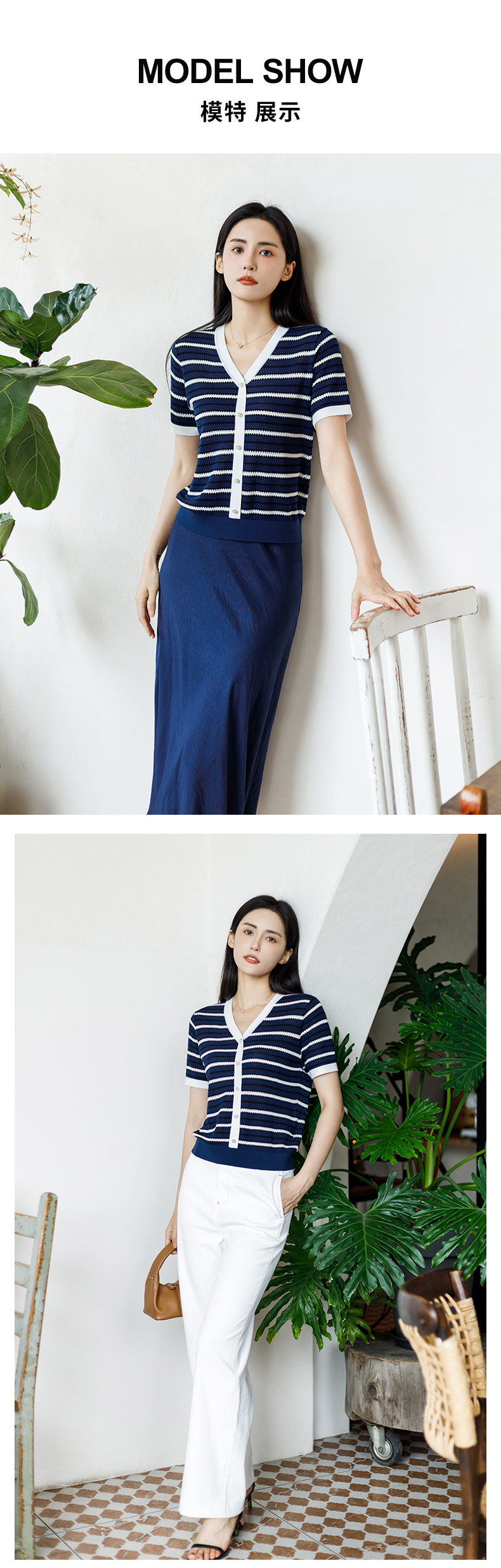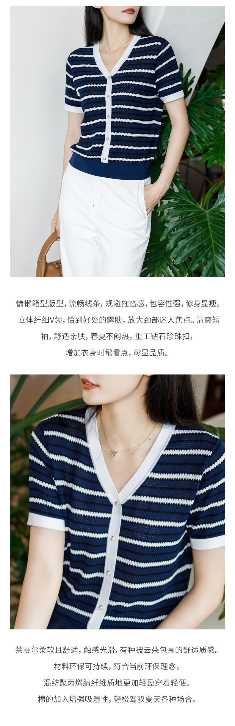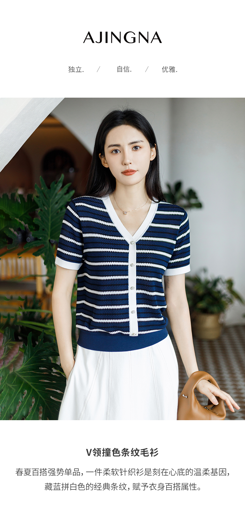 【商场同款】阿菁娜2024夏季新款V领百搭撞色条纹毛衫A29X301068