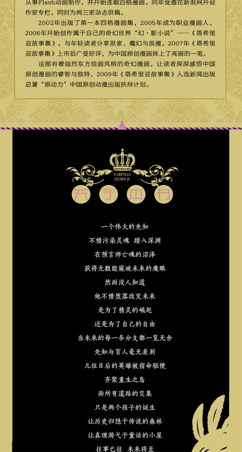 2005年开始构思塔希里亚世界。2006年开始在博客连载。2007年被《萌芽》看中,推荐给接力出版社,随后出版。不温不火,一年一本地陆续推出,至今已出至第6本,故事仍在继续。