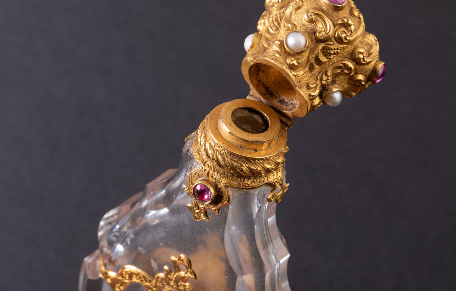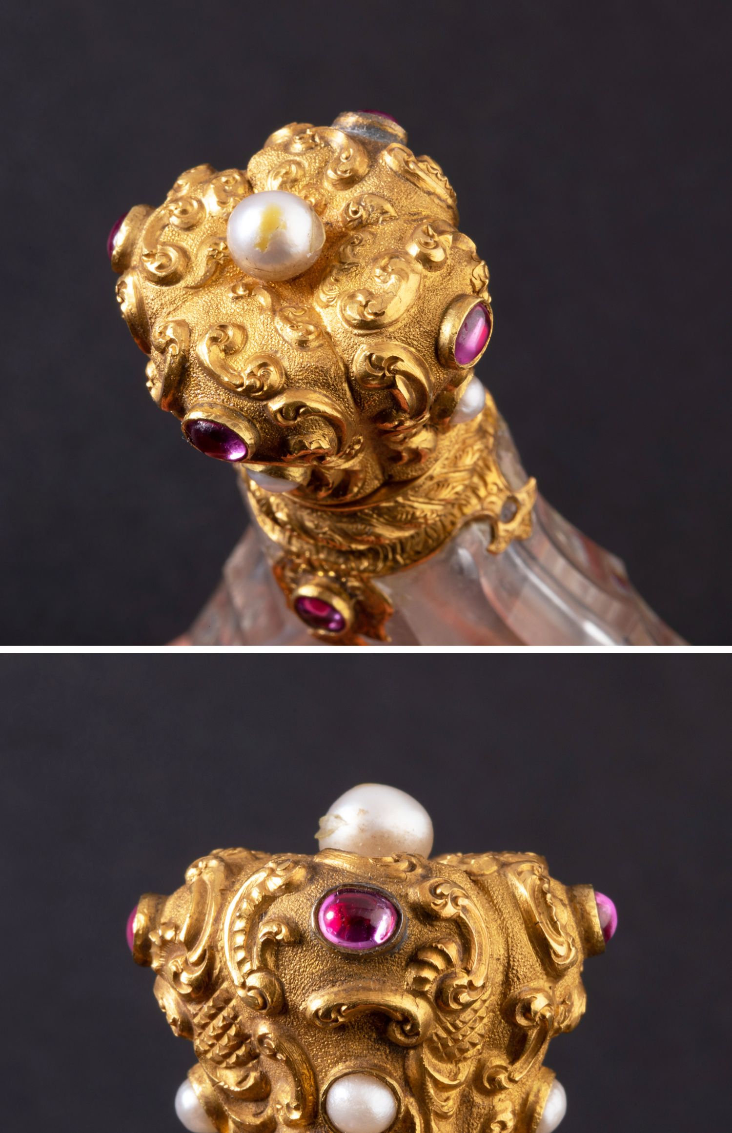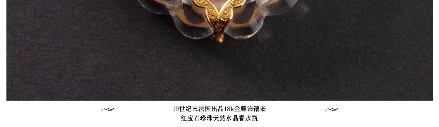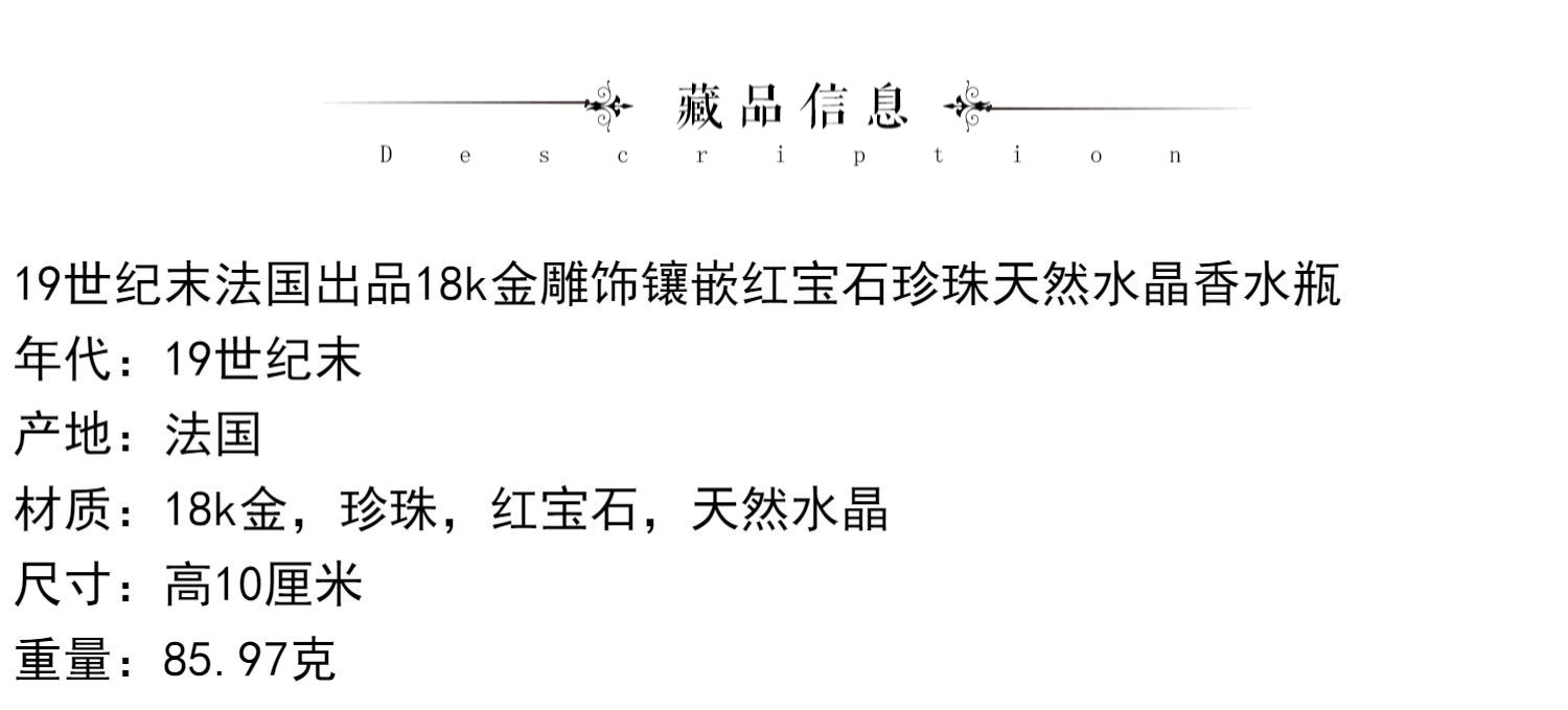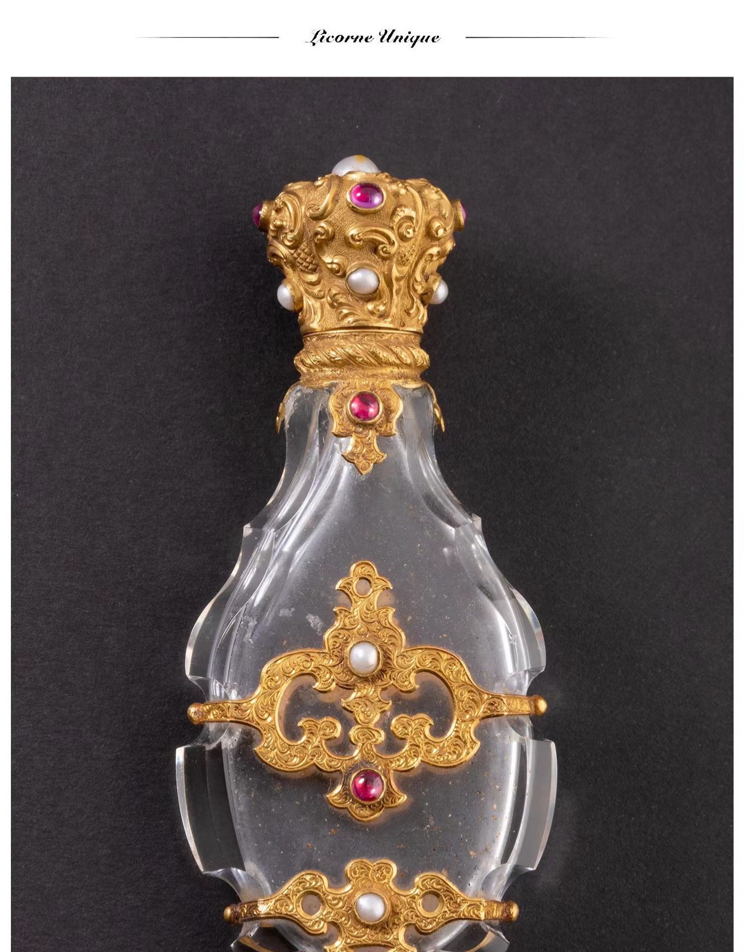 独角鹿西洋古董18K金雕饰镶嵌红宝石珍珠天然水晶香水瓶